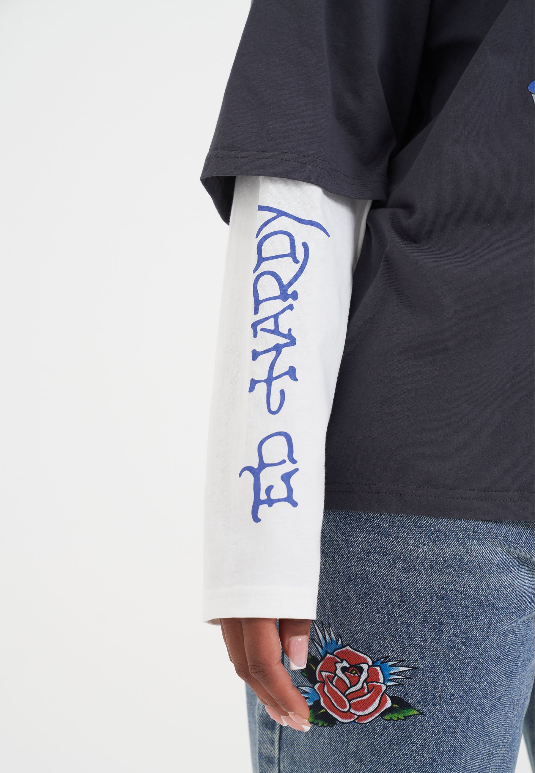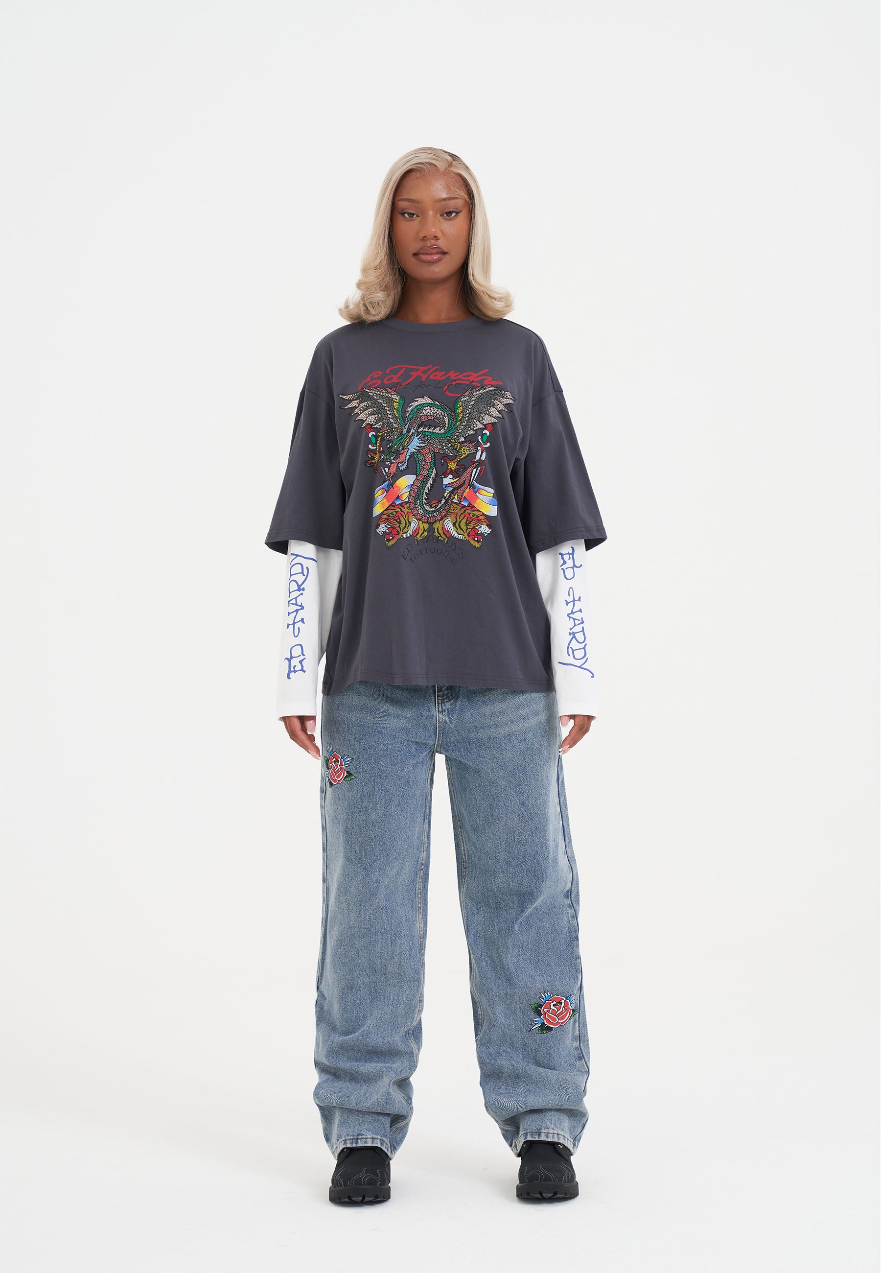 WOMENS FLYING DRAGON DOUBLE SLEEVE T-SHIRT in Charcoal
