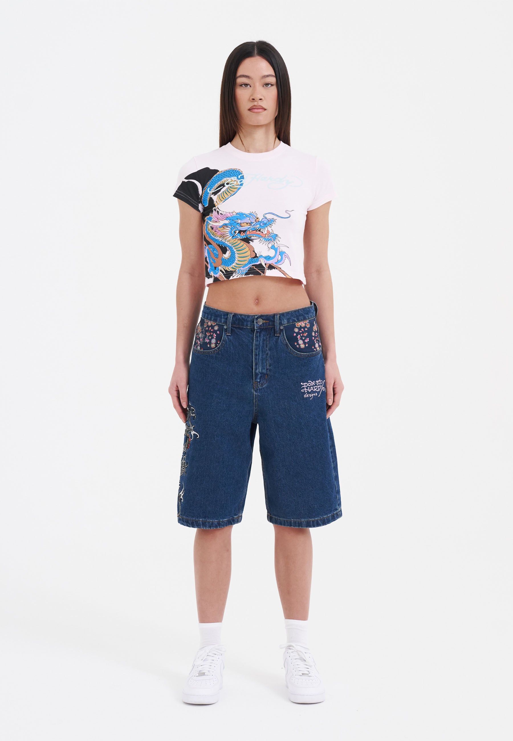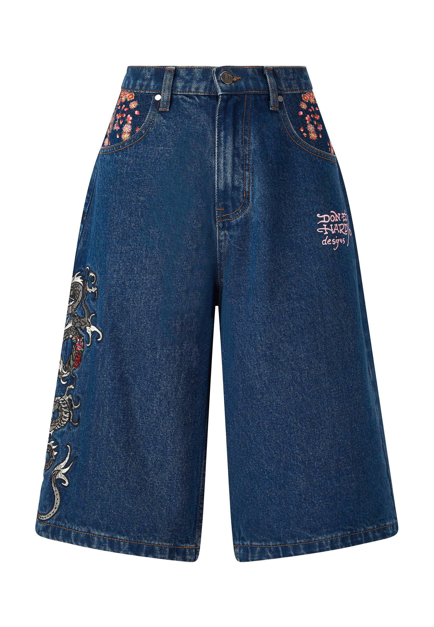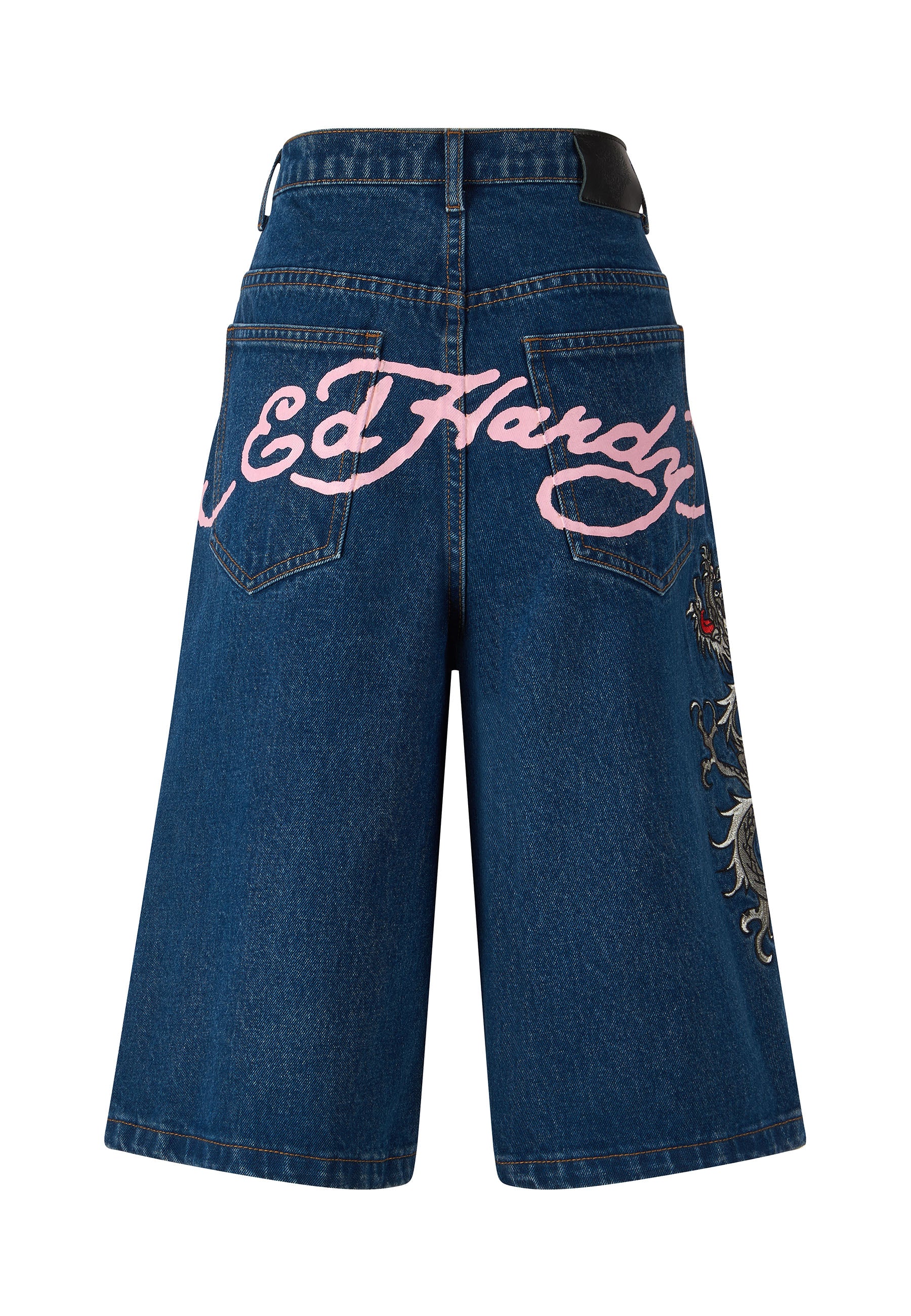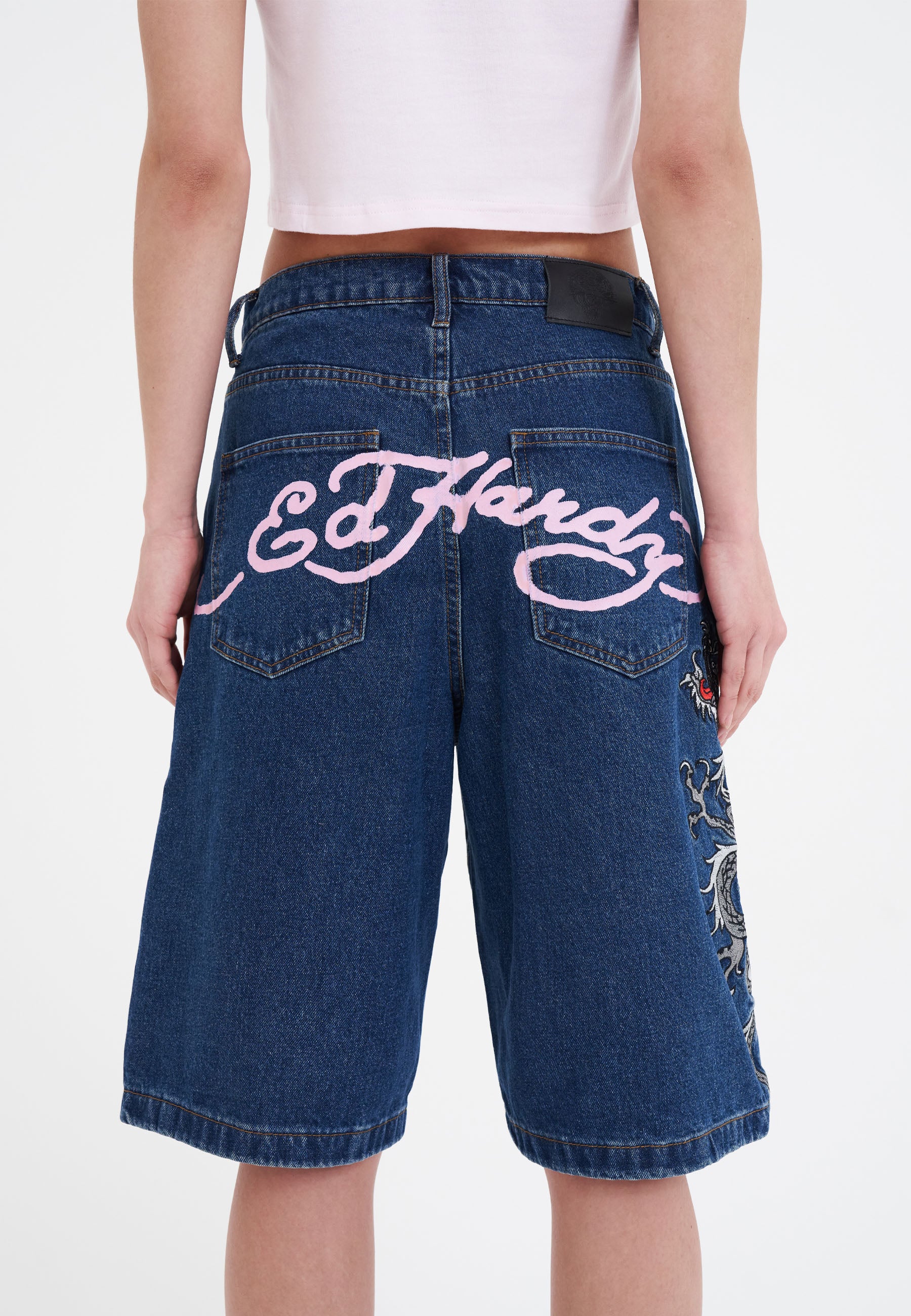 Oversized denim shorts for women are back, and these are a showstopper thanks to a high def, full-colour embroidered dragon and the iconic Ed Hardy signature emblazoned across the back pockets.