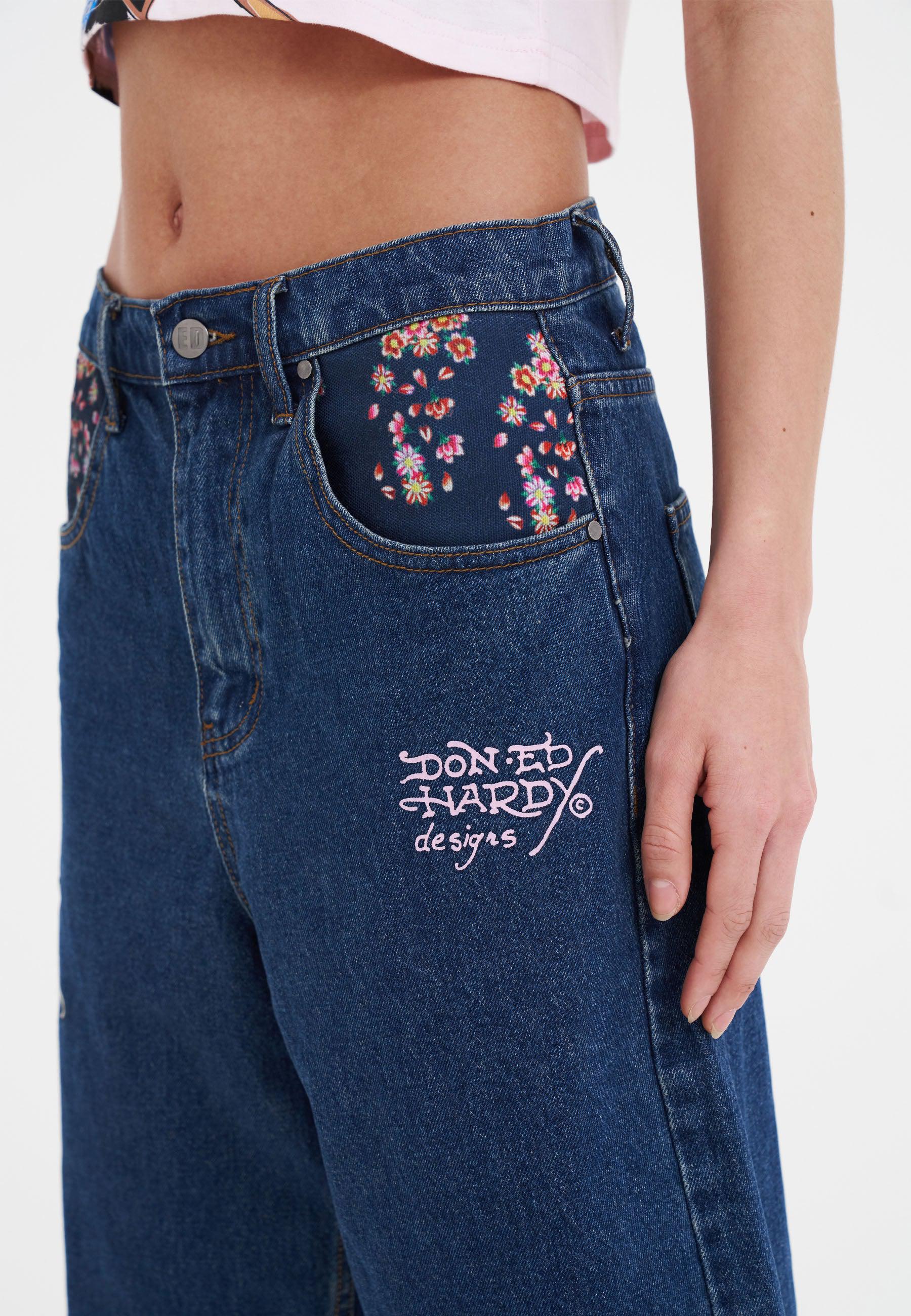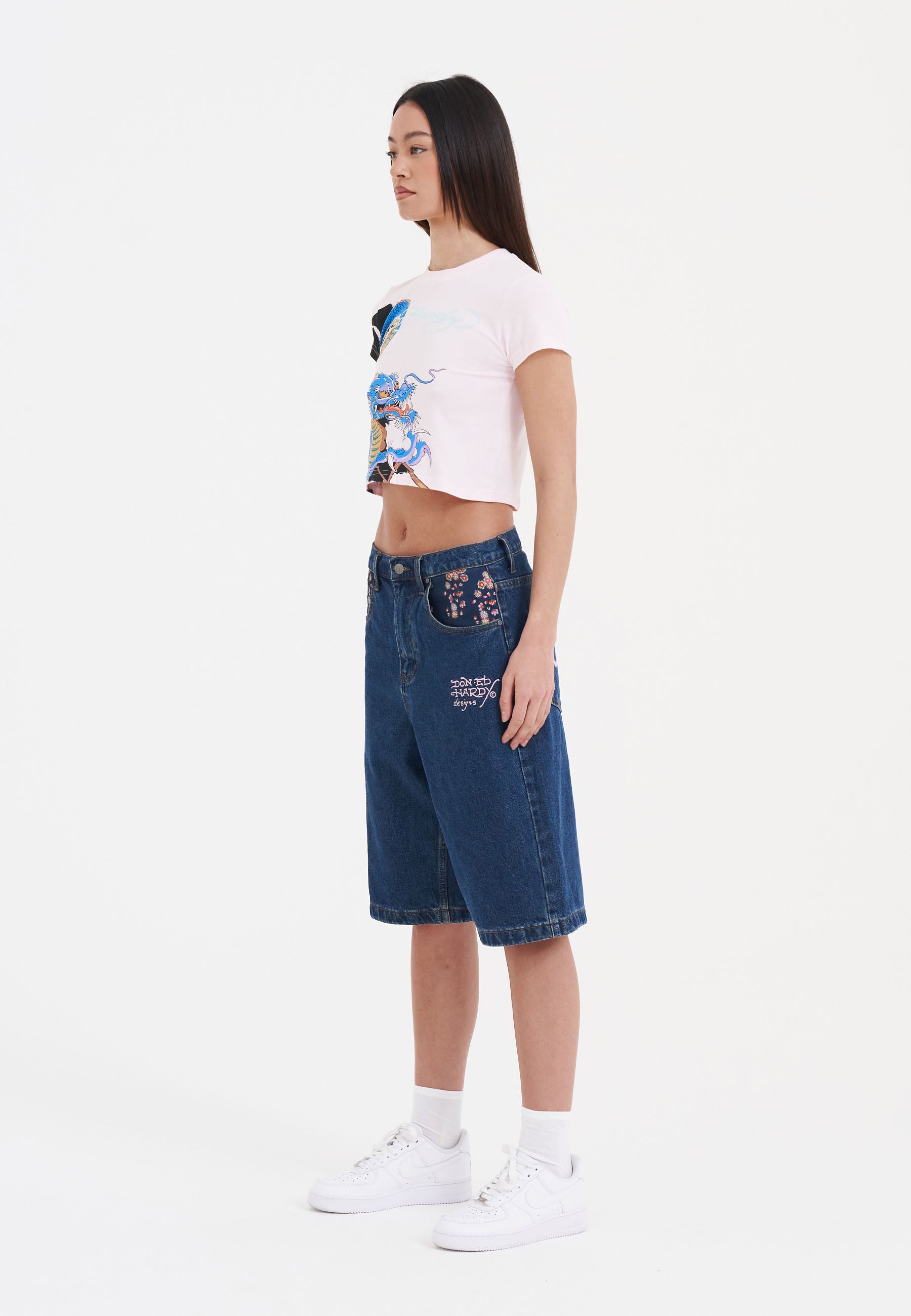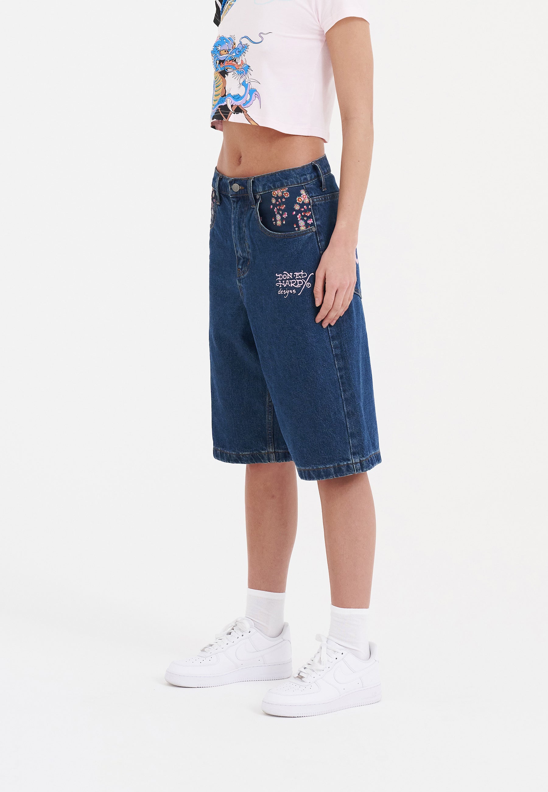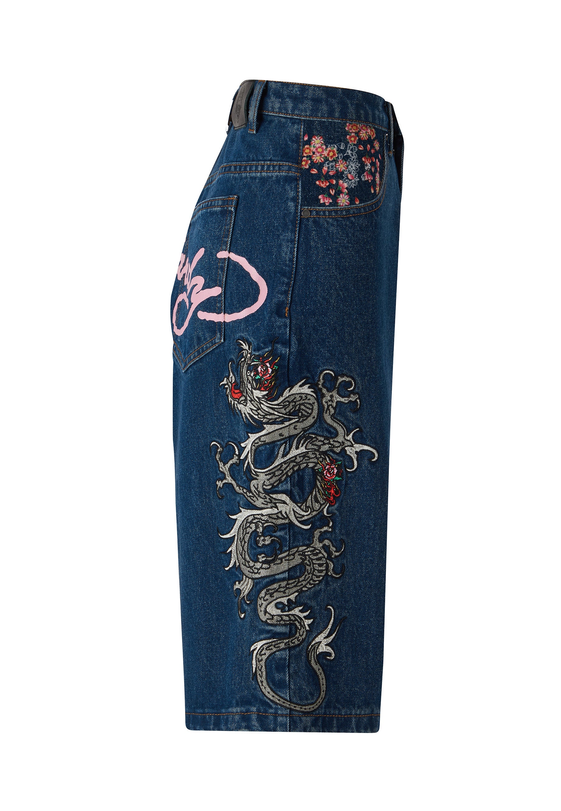 Oversized denim shorts for women are back, and these are a showstopper thanks to a high def, full-colour embroidered dragon and the iconic Ed Hardy signature emblazoned across the back pockets.
