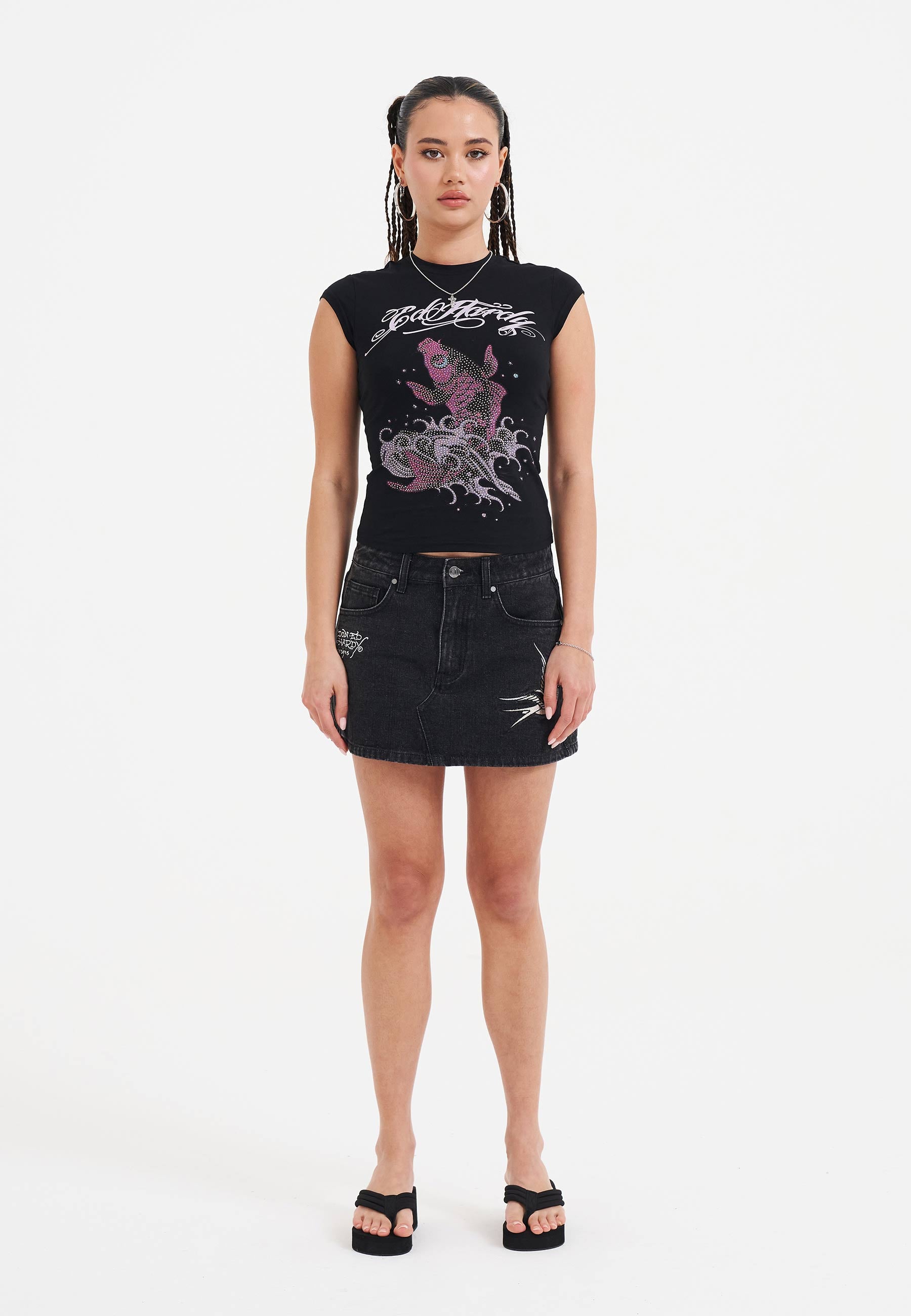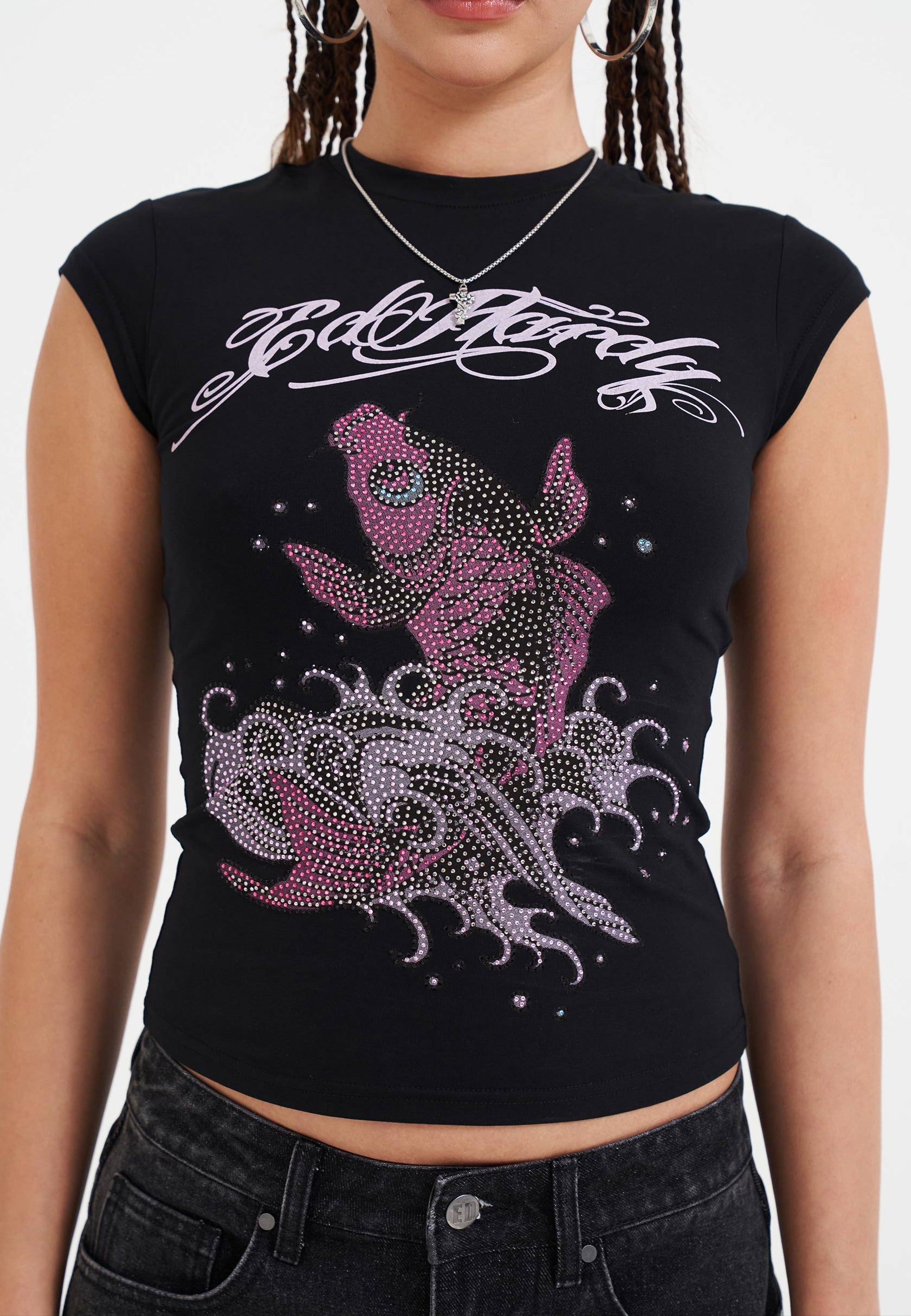Womens Koi Fish Diamante Cap Sleeve T-Shirt Top - Black