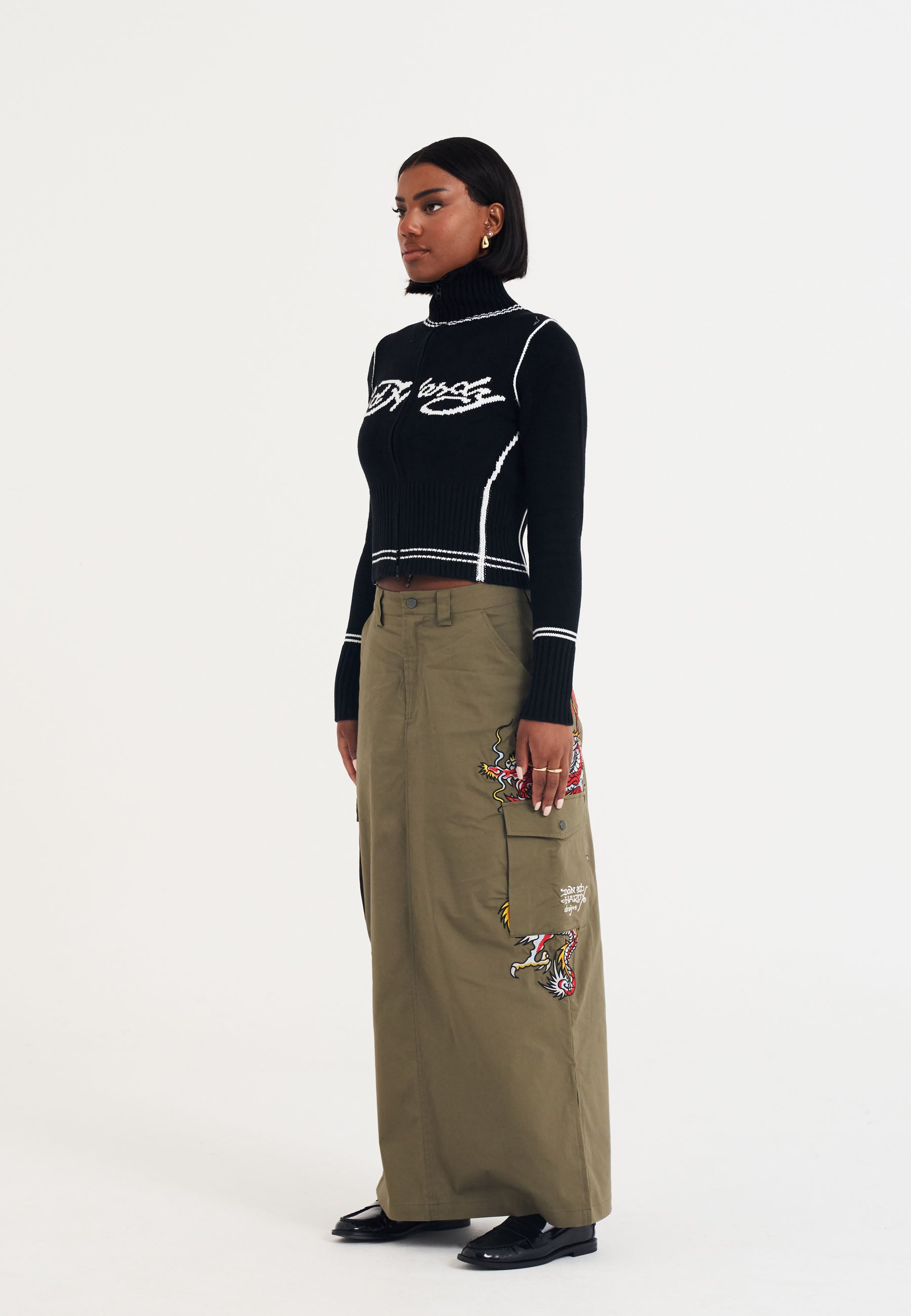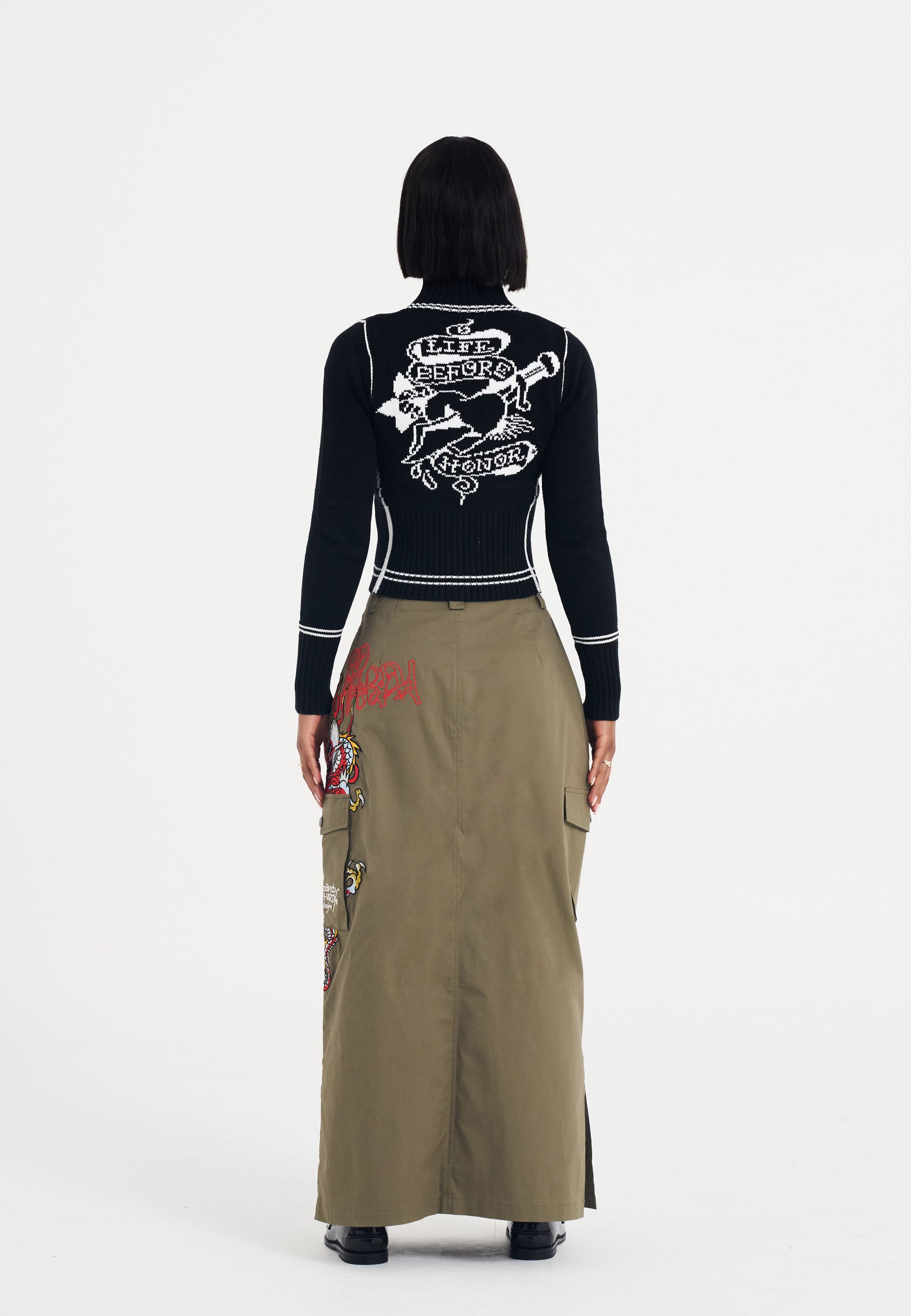 Designed with fine rib knit and contrast colour seams, this jacket showcases a zip fastening, a tonal Ed Hardy signature jacquard across the chest, and a refined jacquard back graphic.
