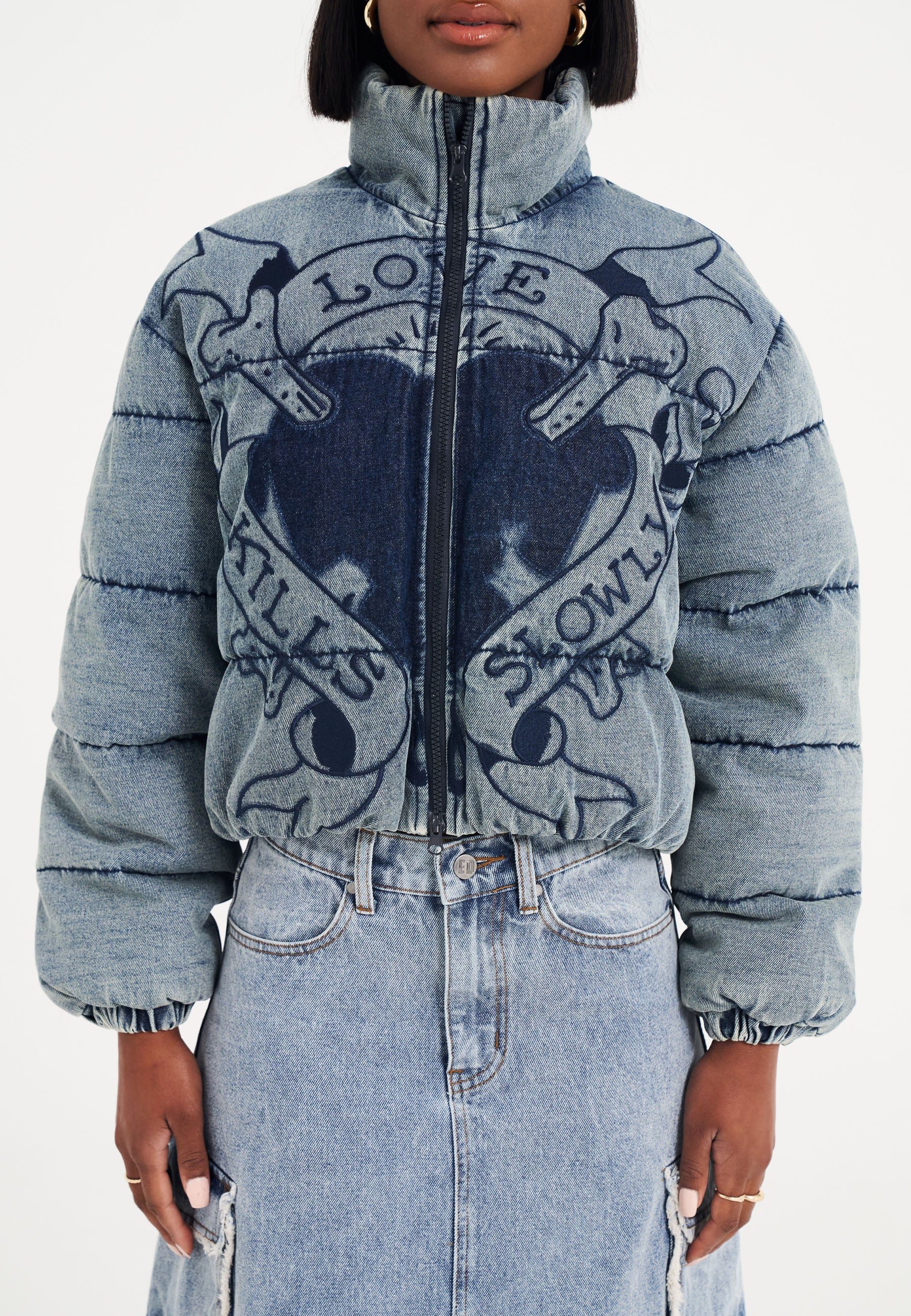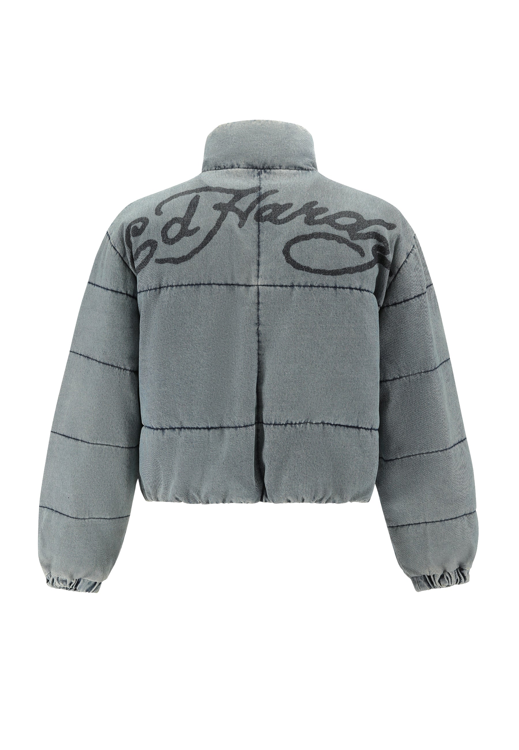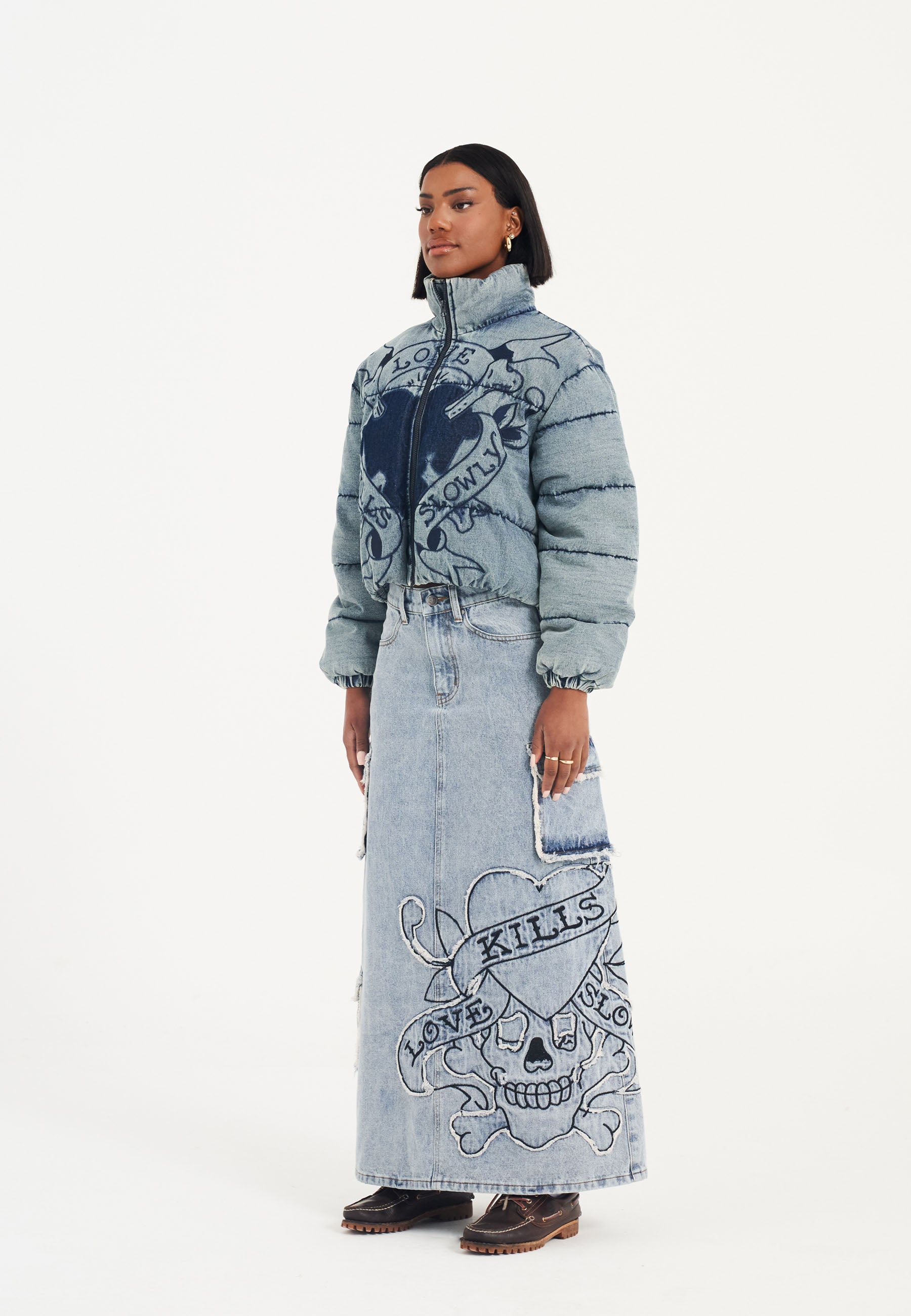 Featuring Ed's artwork reimagined for the season, the Love Kills Denim Puffer combines premium materials with design detailing: quilted bleach wash, tonal embroidery on the front, printed logo on the reverse, and front side pockets and a zip closure.