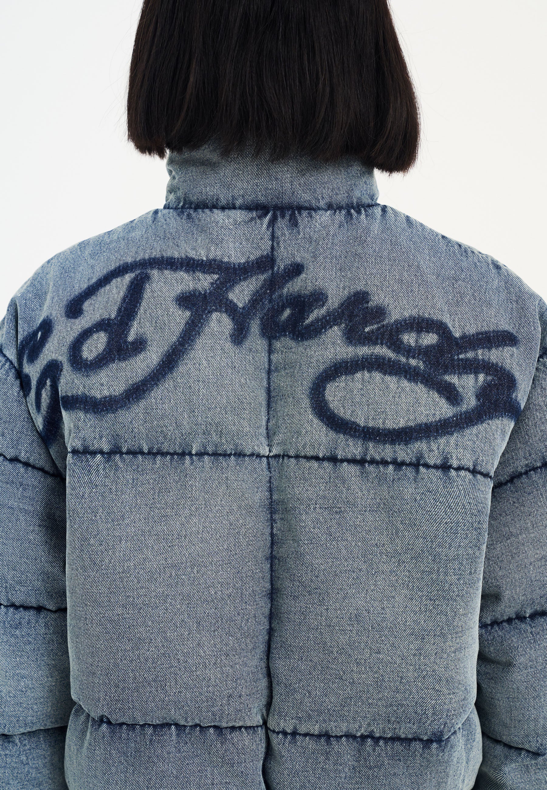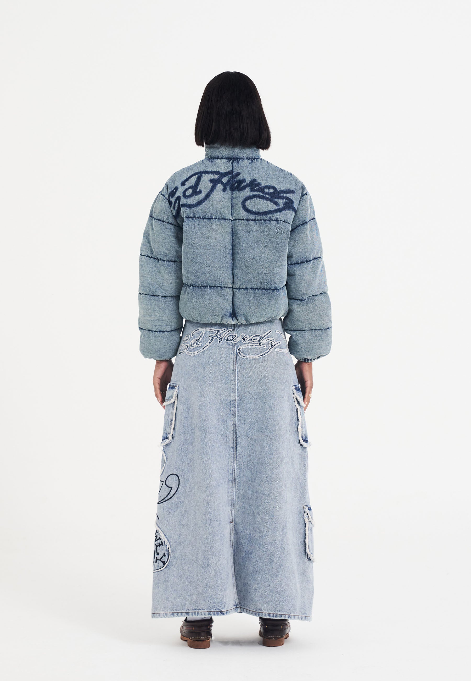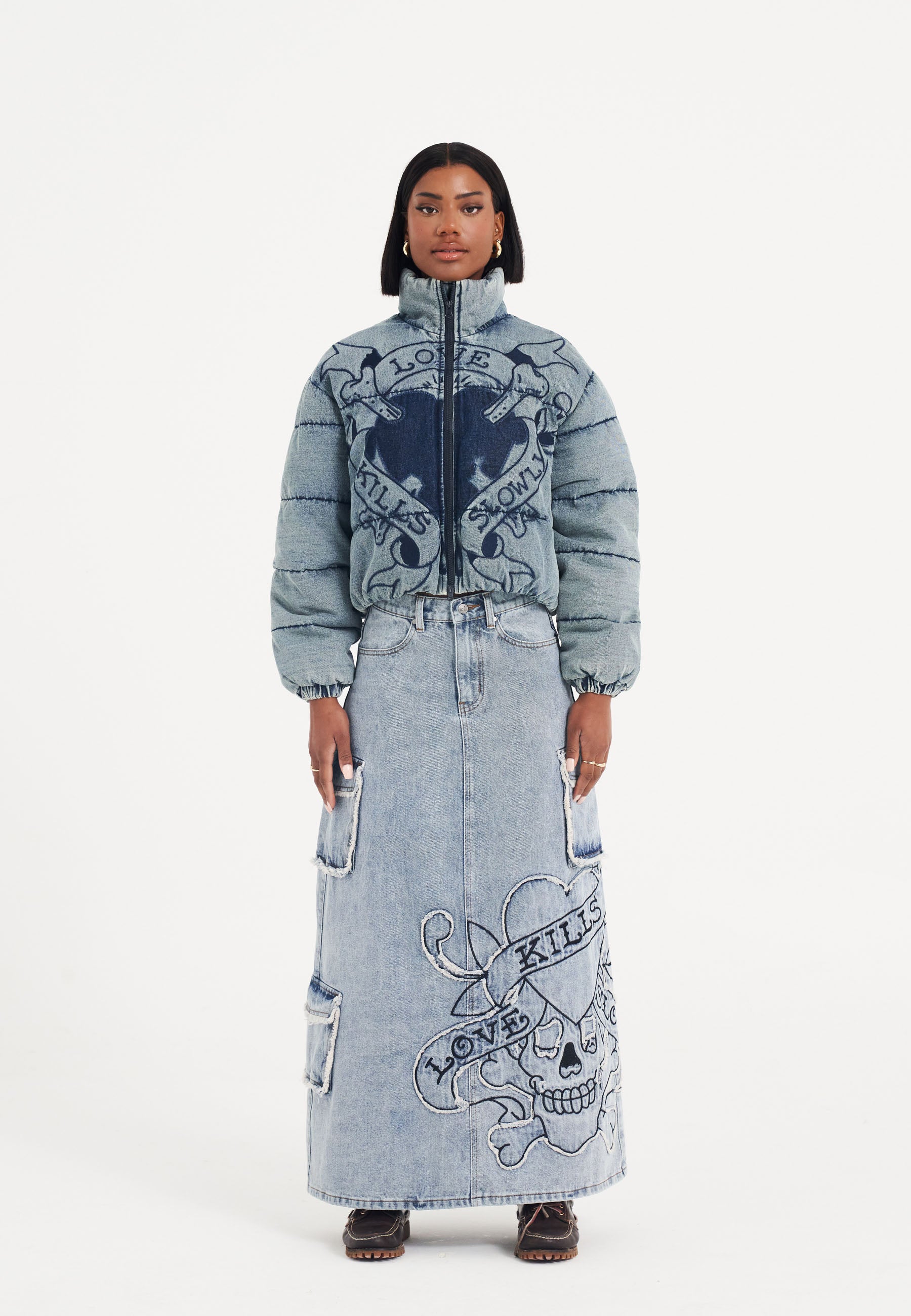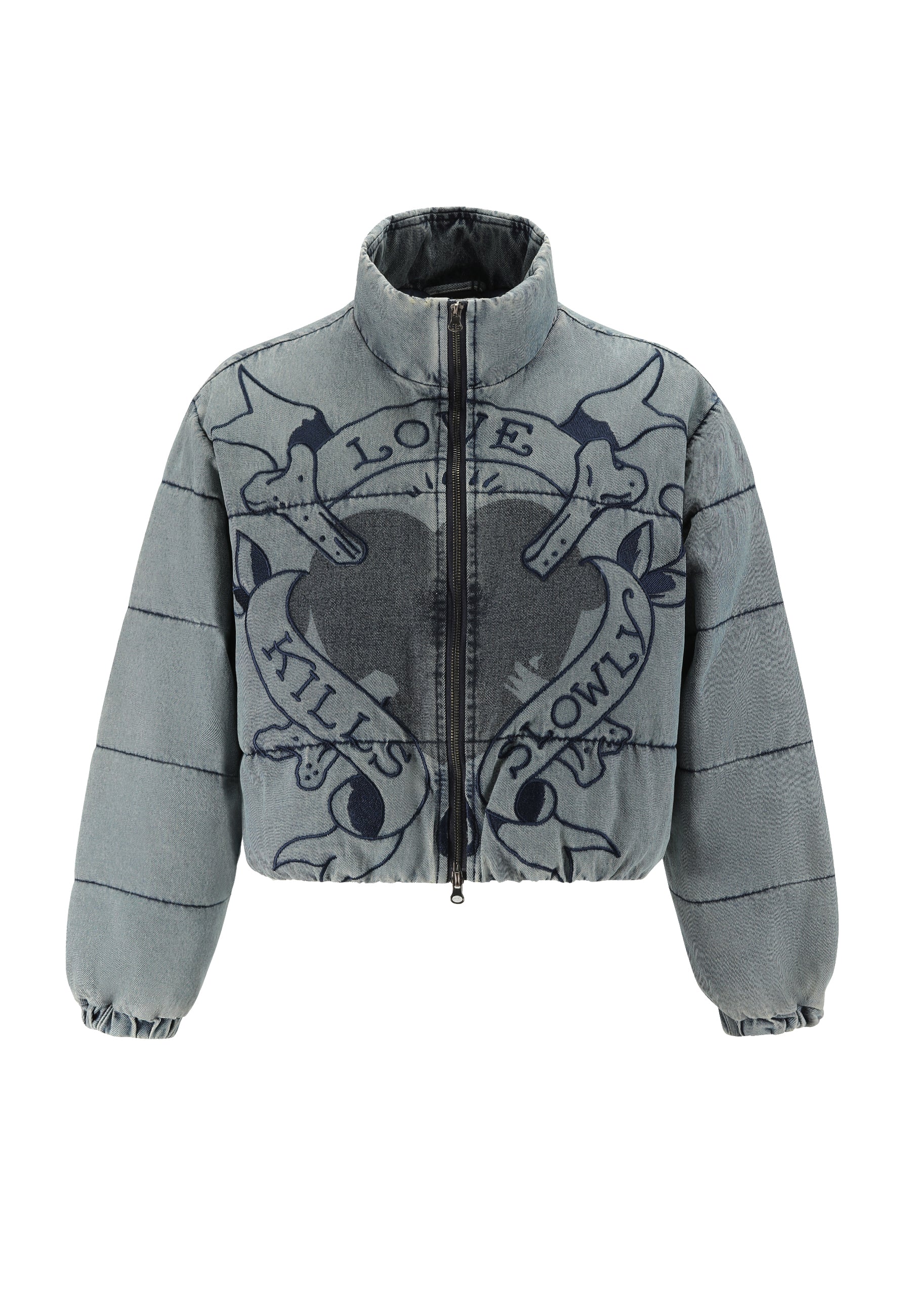 Featuring Ed's artwork reimagined for the season, the Love Kills Denim Puffer combines premium materials with design detailing: quilted bleach wash, tonal embroidery on the front, printed logo on the reverse, and front side pockets and a zip closure.