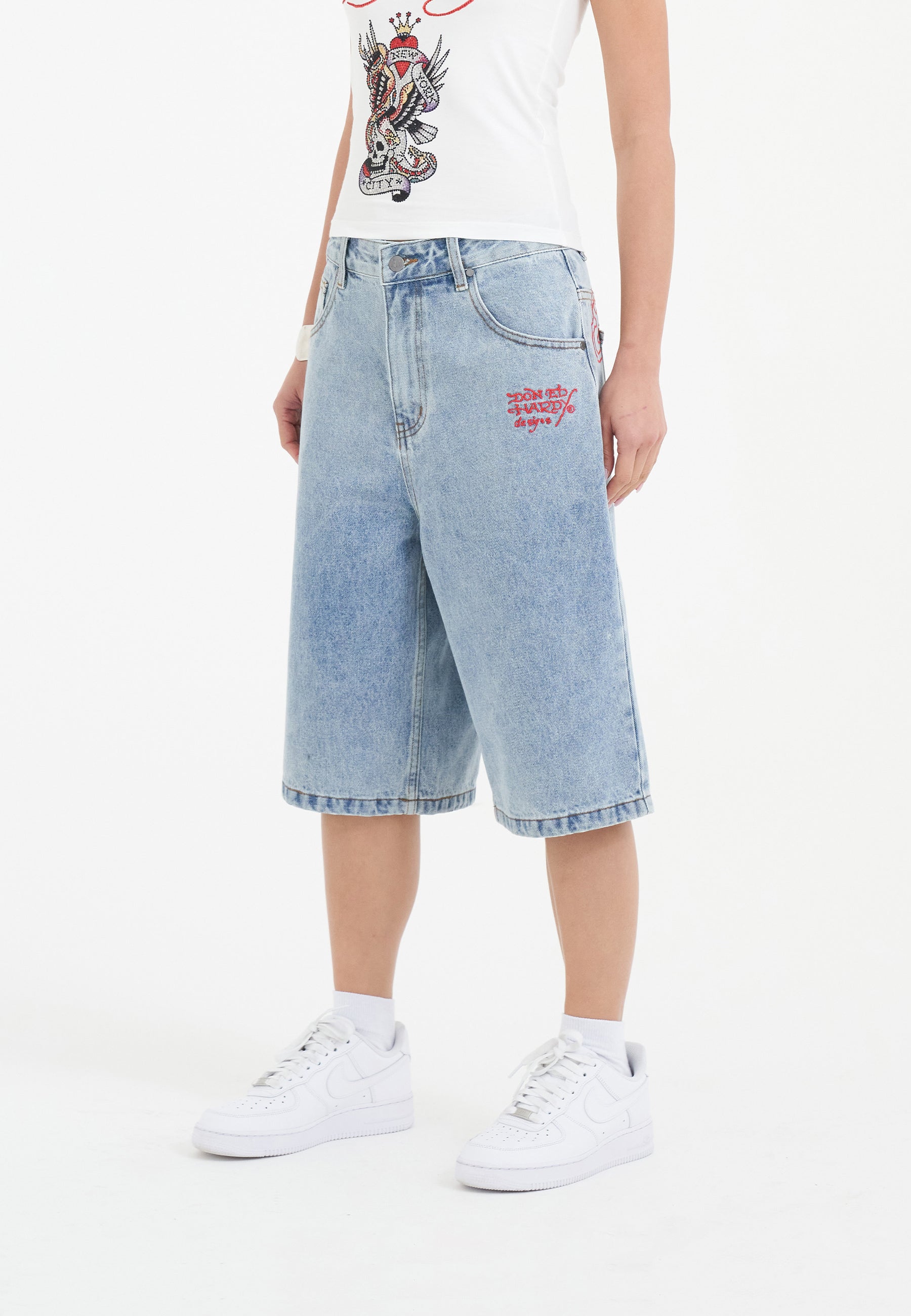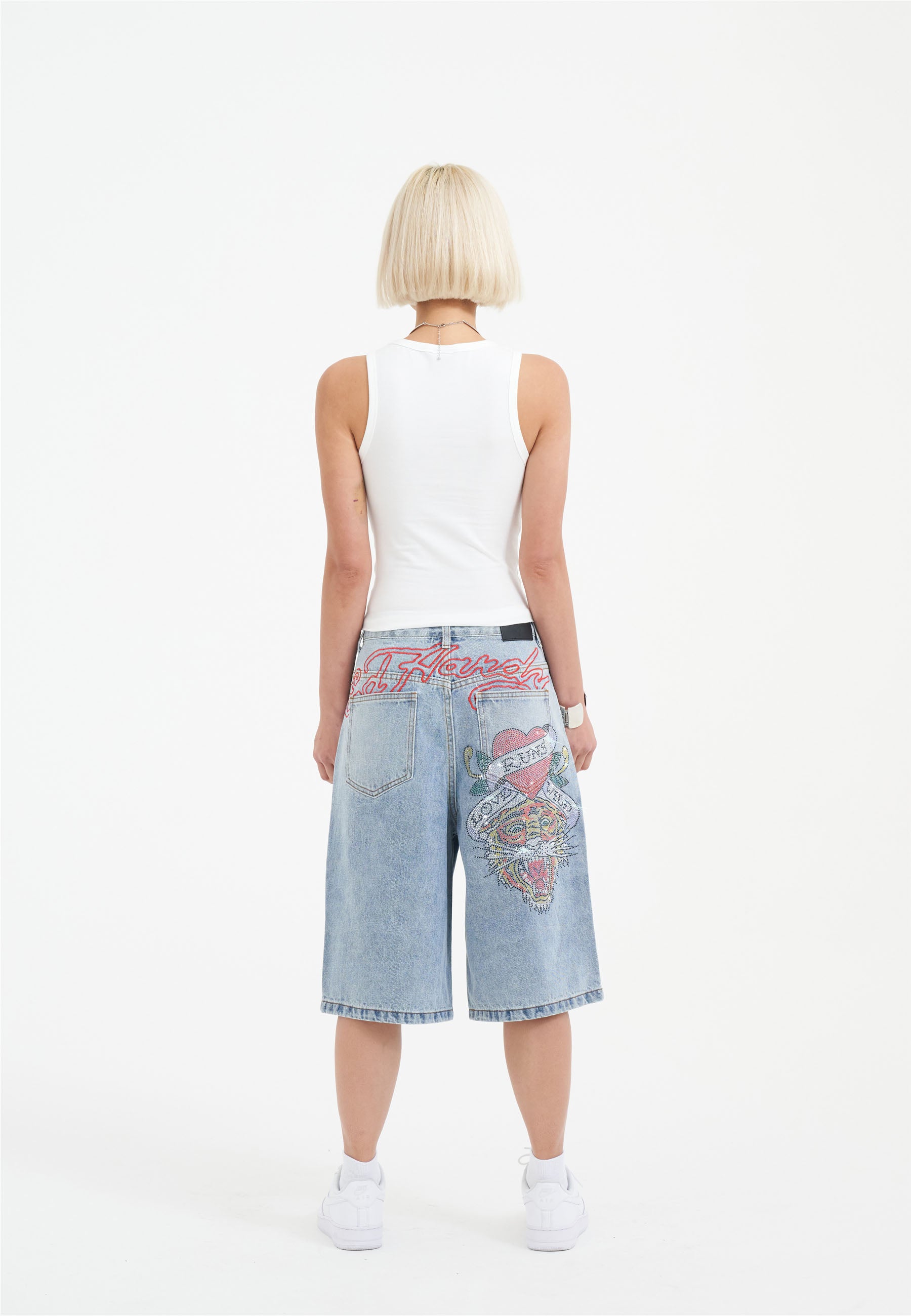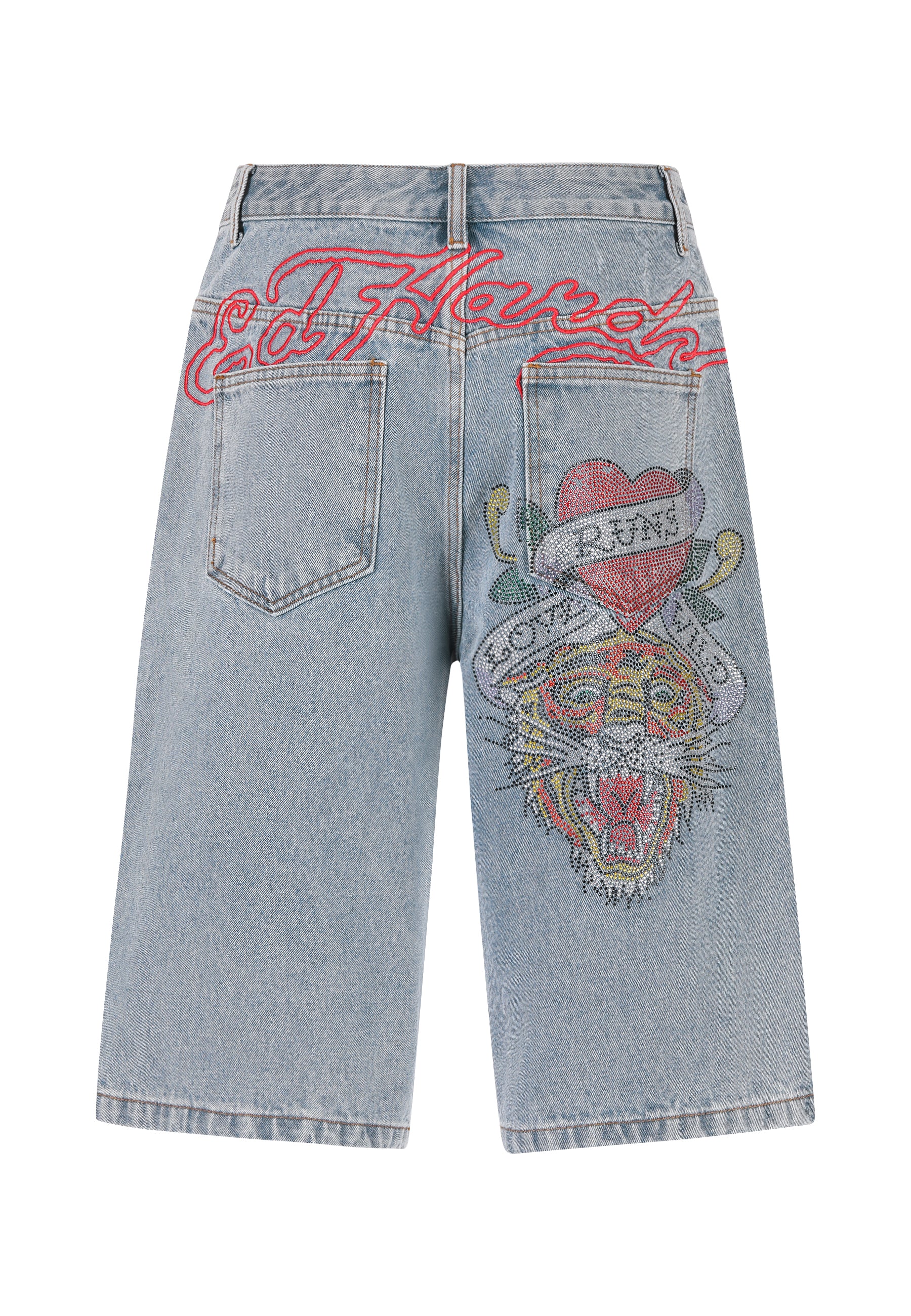 Revived from the depths of his archive illustrations, the Love Runs Wild Jorts showcase a full wrap-around graphic that serves as a testament to the enduring spirit of passion and defiance, historic to Ed's designs.