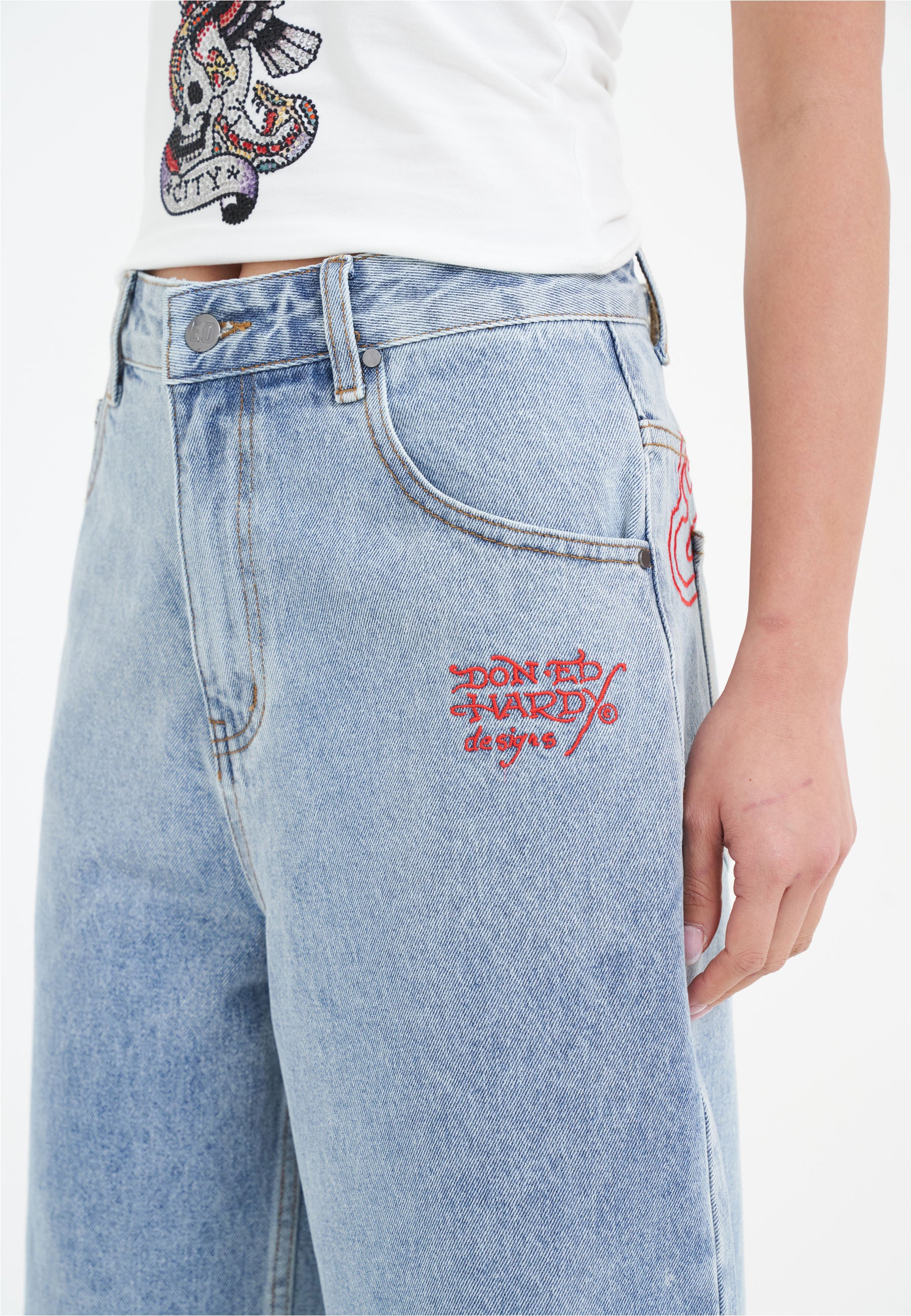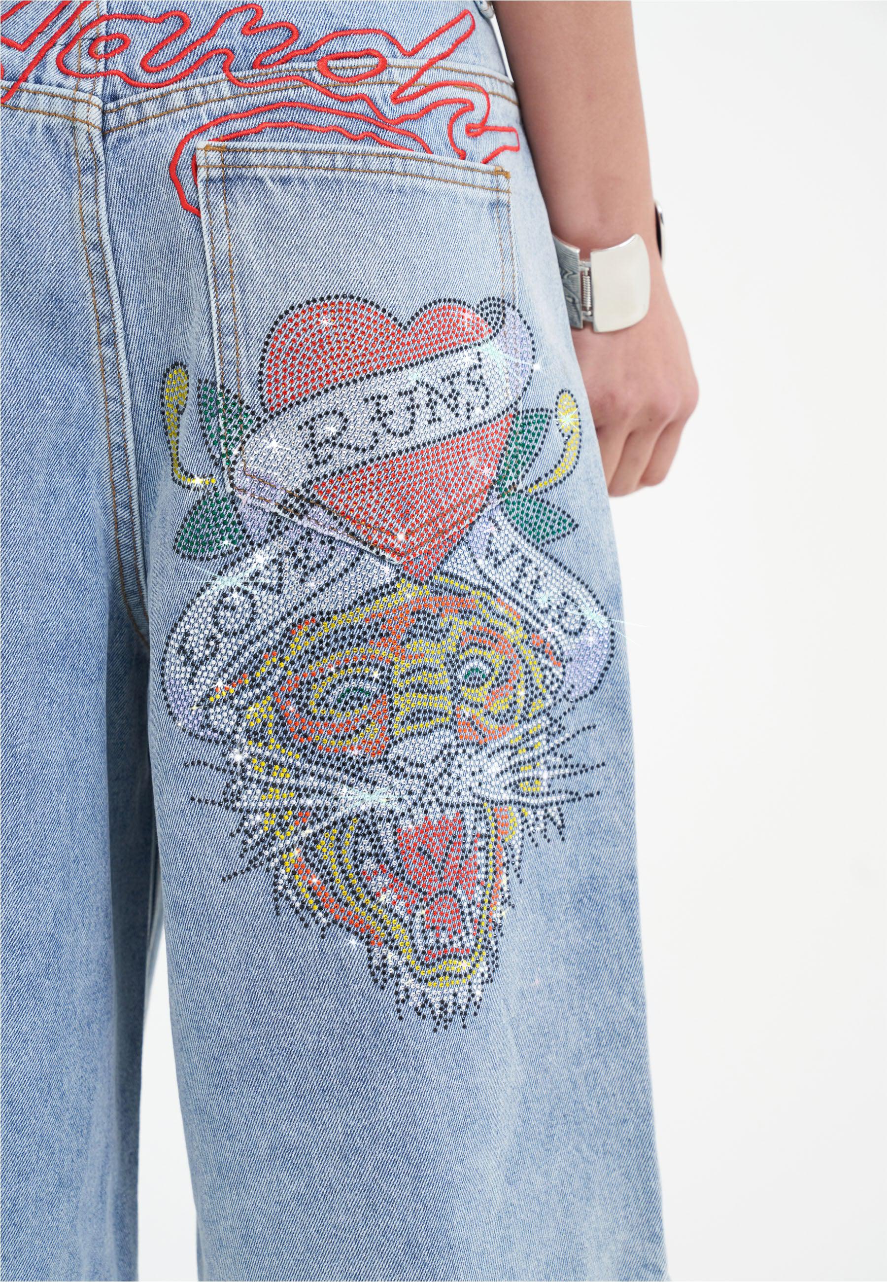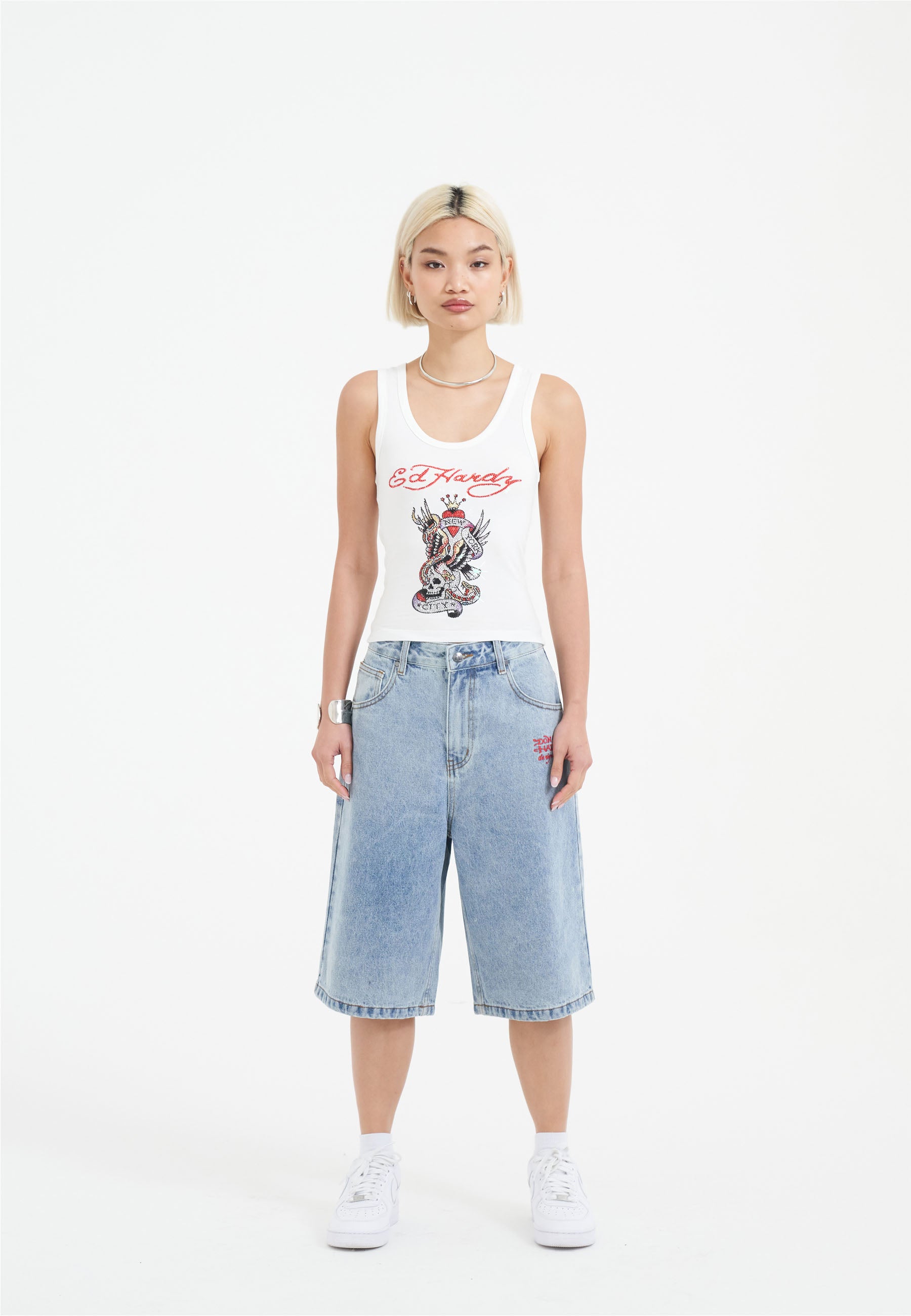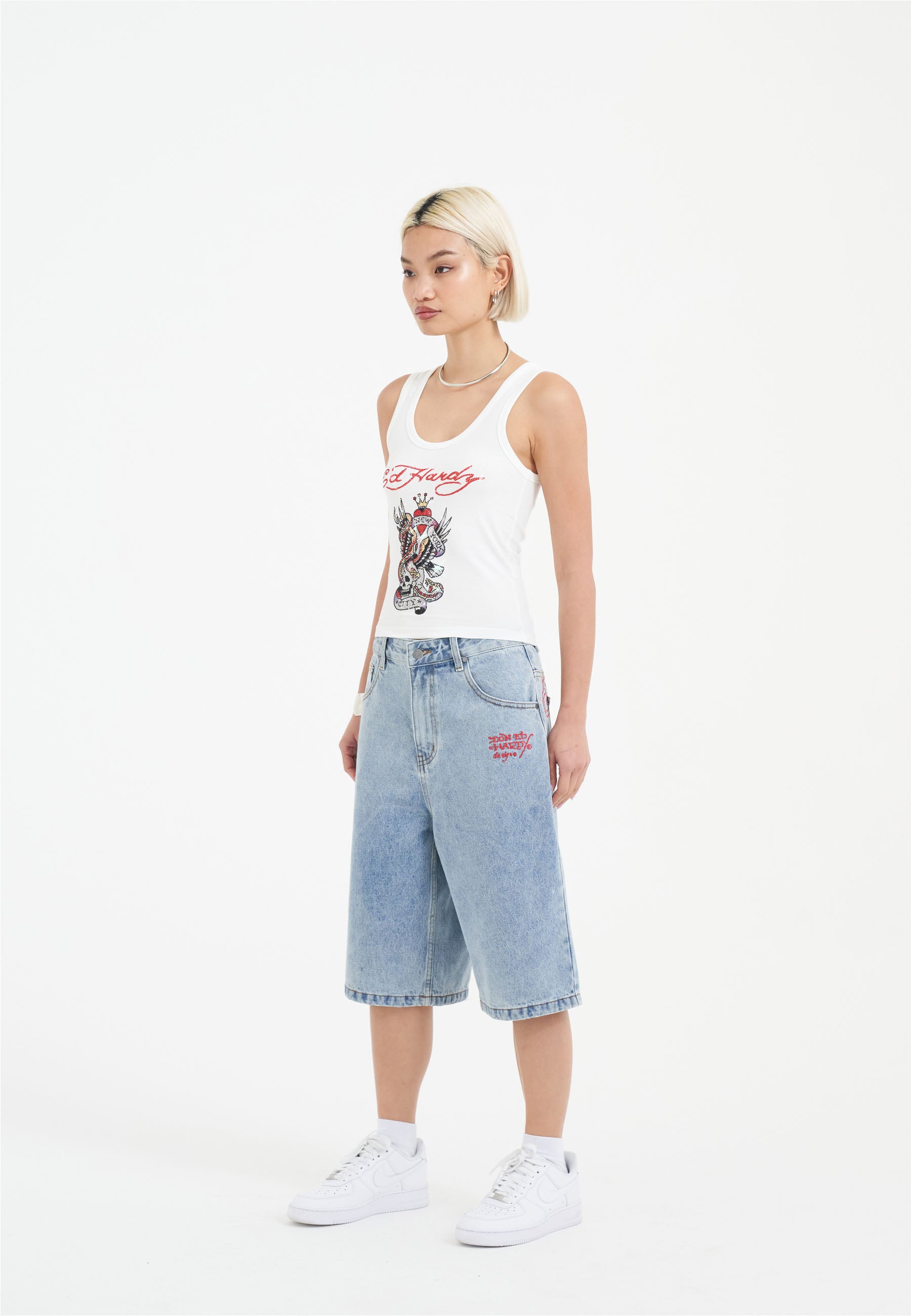 Revived from the depths of his archive illustrations, the Love Runs Wild Jorts showcase a full wrap-around graphic that serves as a testament to the enduring spirit of passion and defiance, historic to Ed's designs.