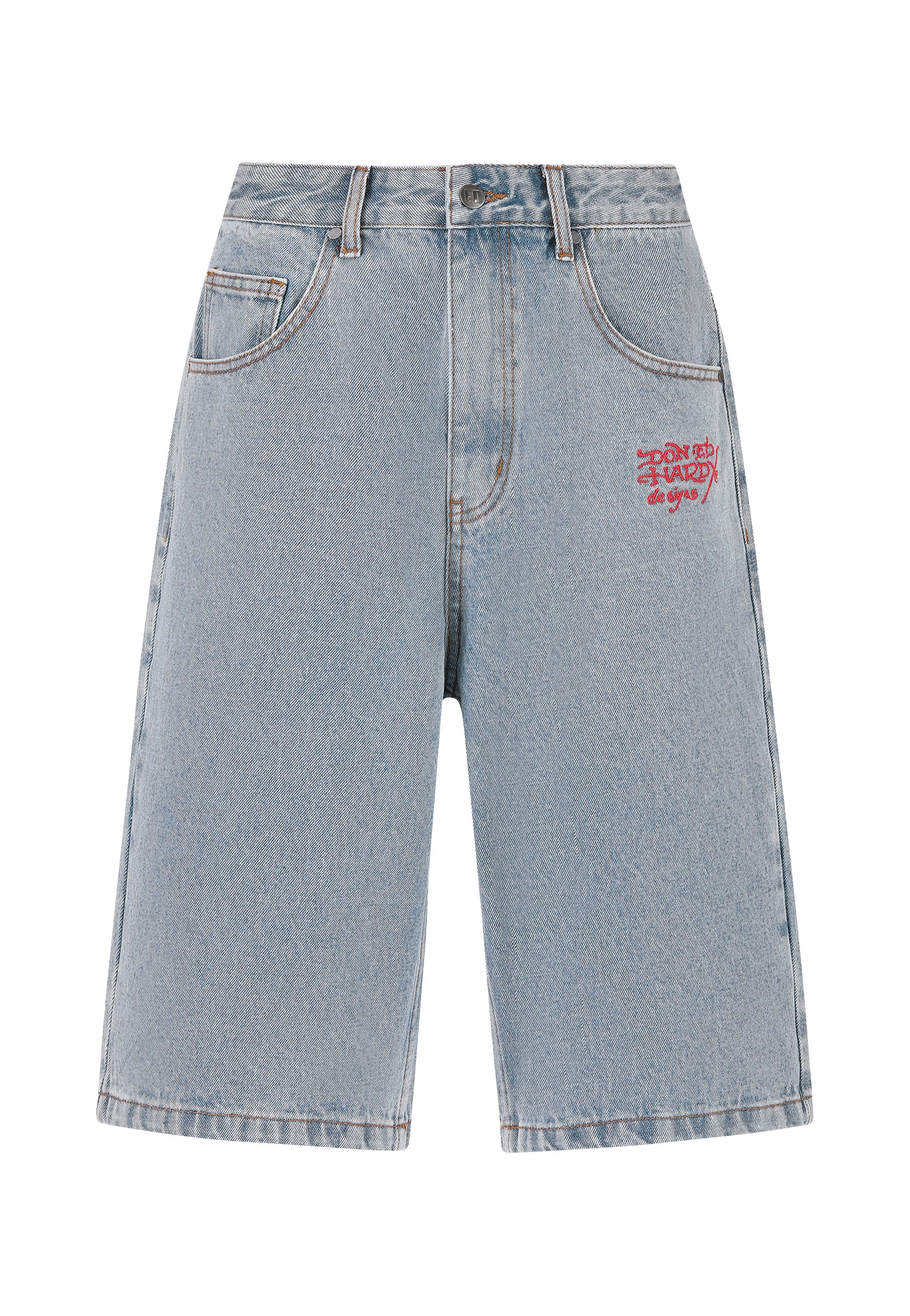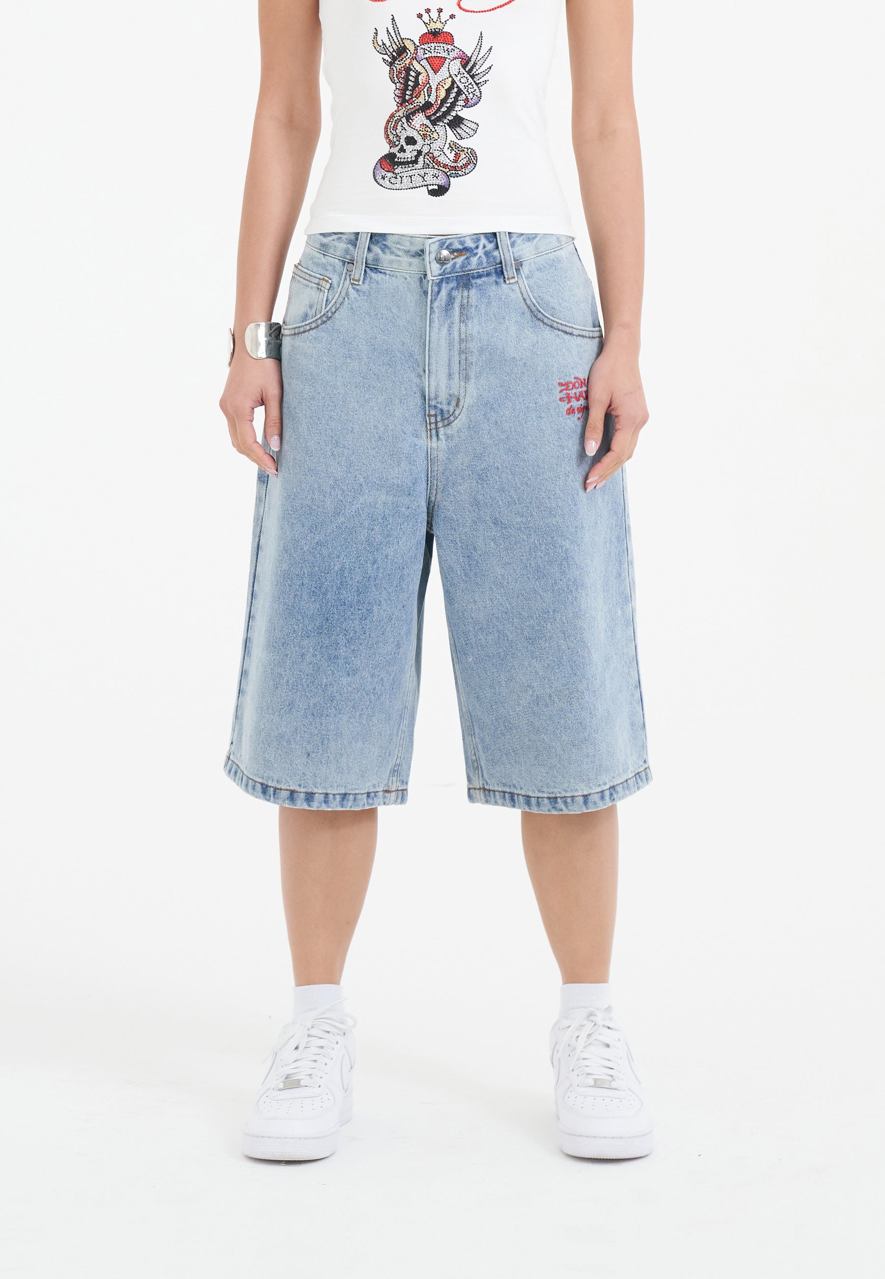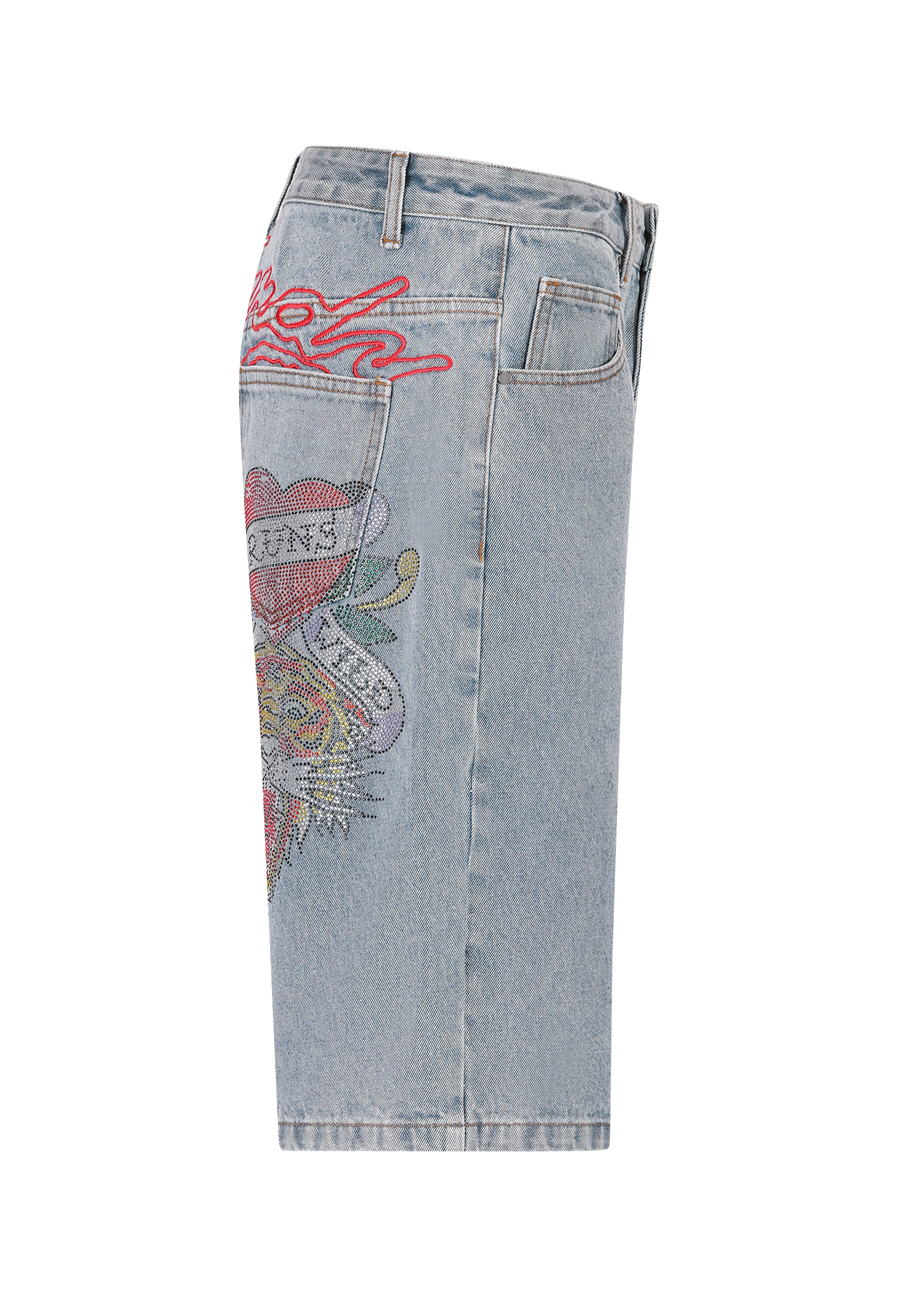 Womens Love Runs Wild Diamante Denim Jorts Shorts - Bleach