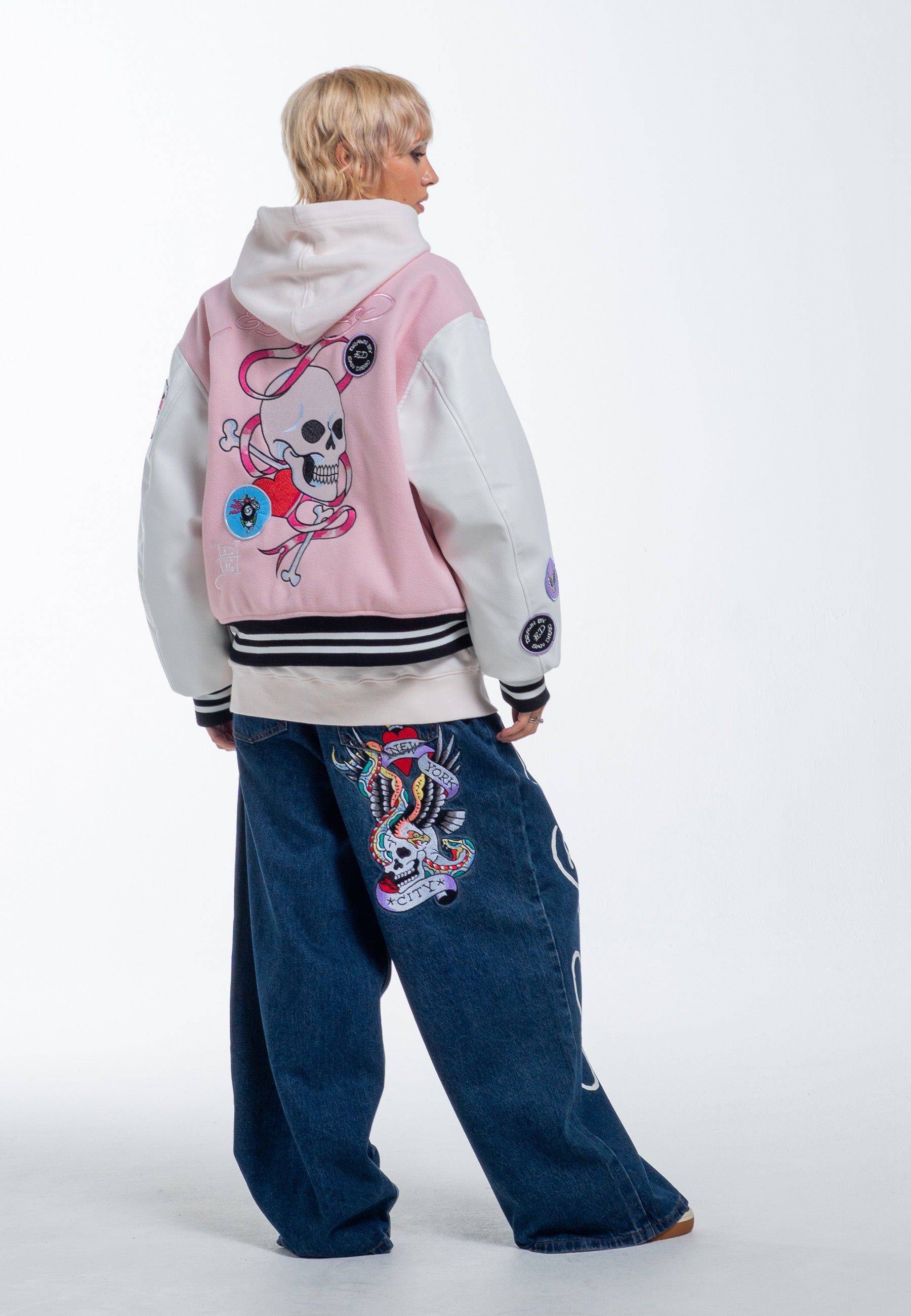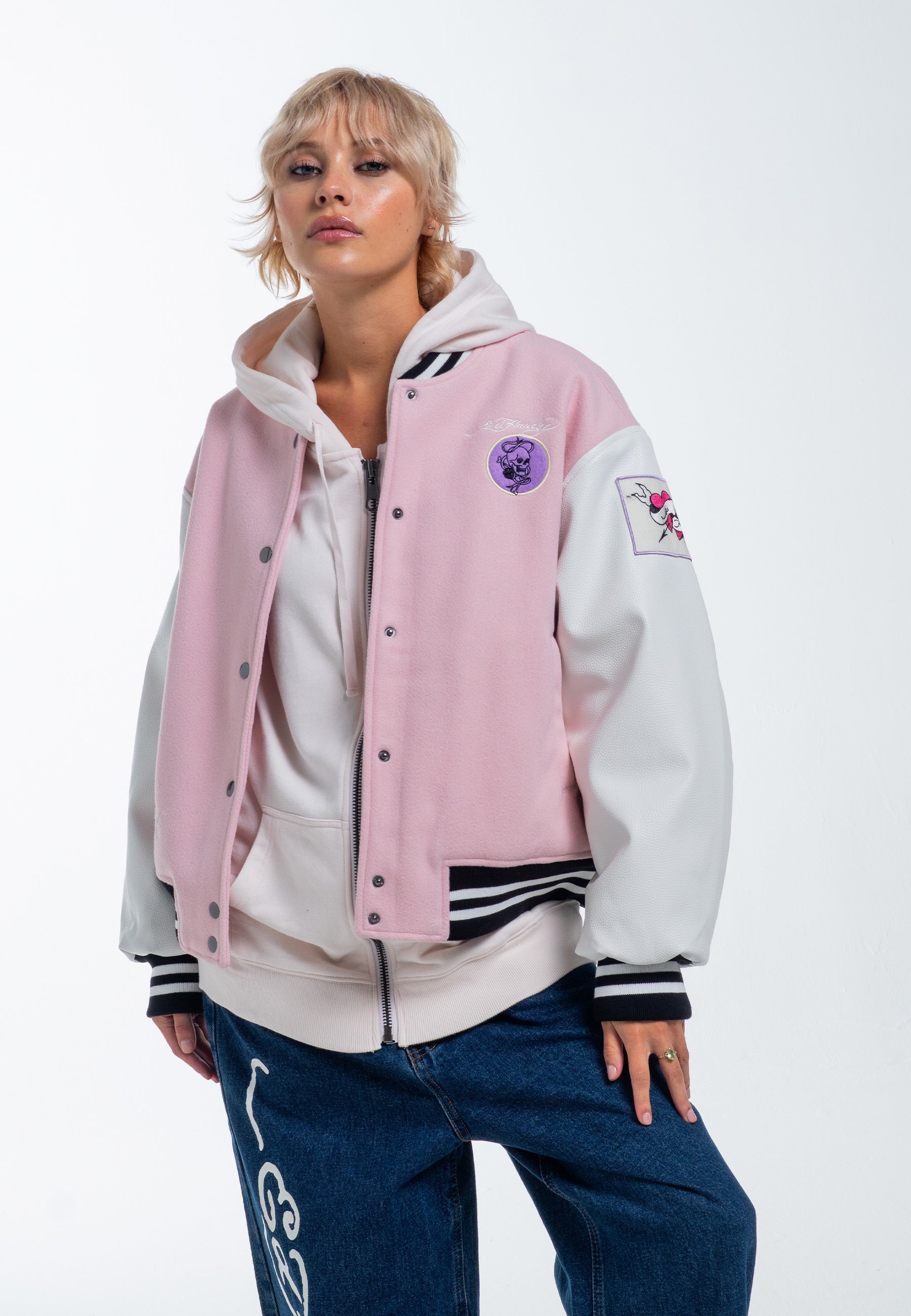 Introducing the Love Wrapped Varsity Bomber Jacket, a two-tone masterpiece in pink and white. Crafted from 70% woollen and 30% tumbled PU, Featuring a primary embroidered design of skull and bones, it's adorned with additional appliqué badges showcasing a selection of Ed's signature designs.