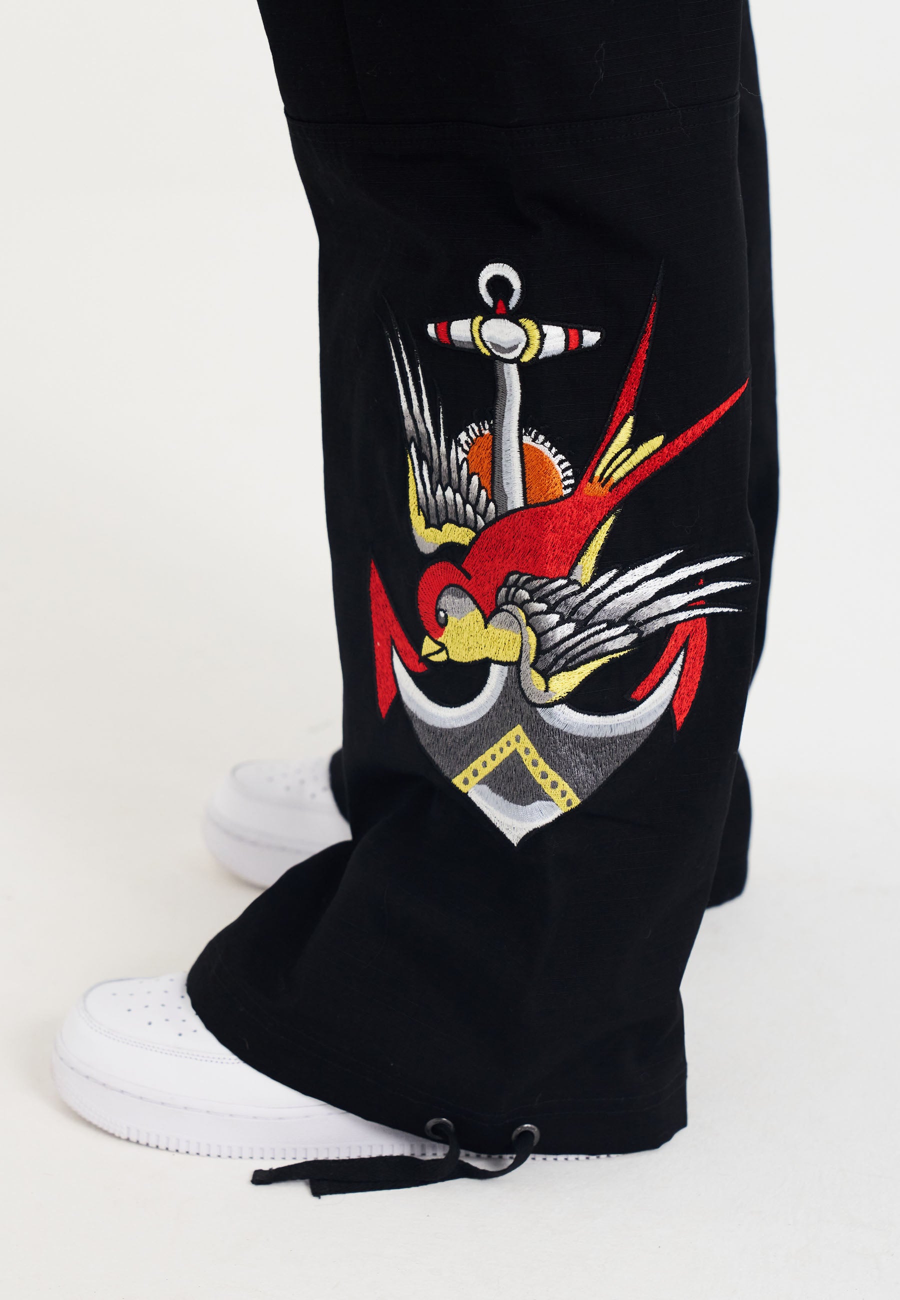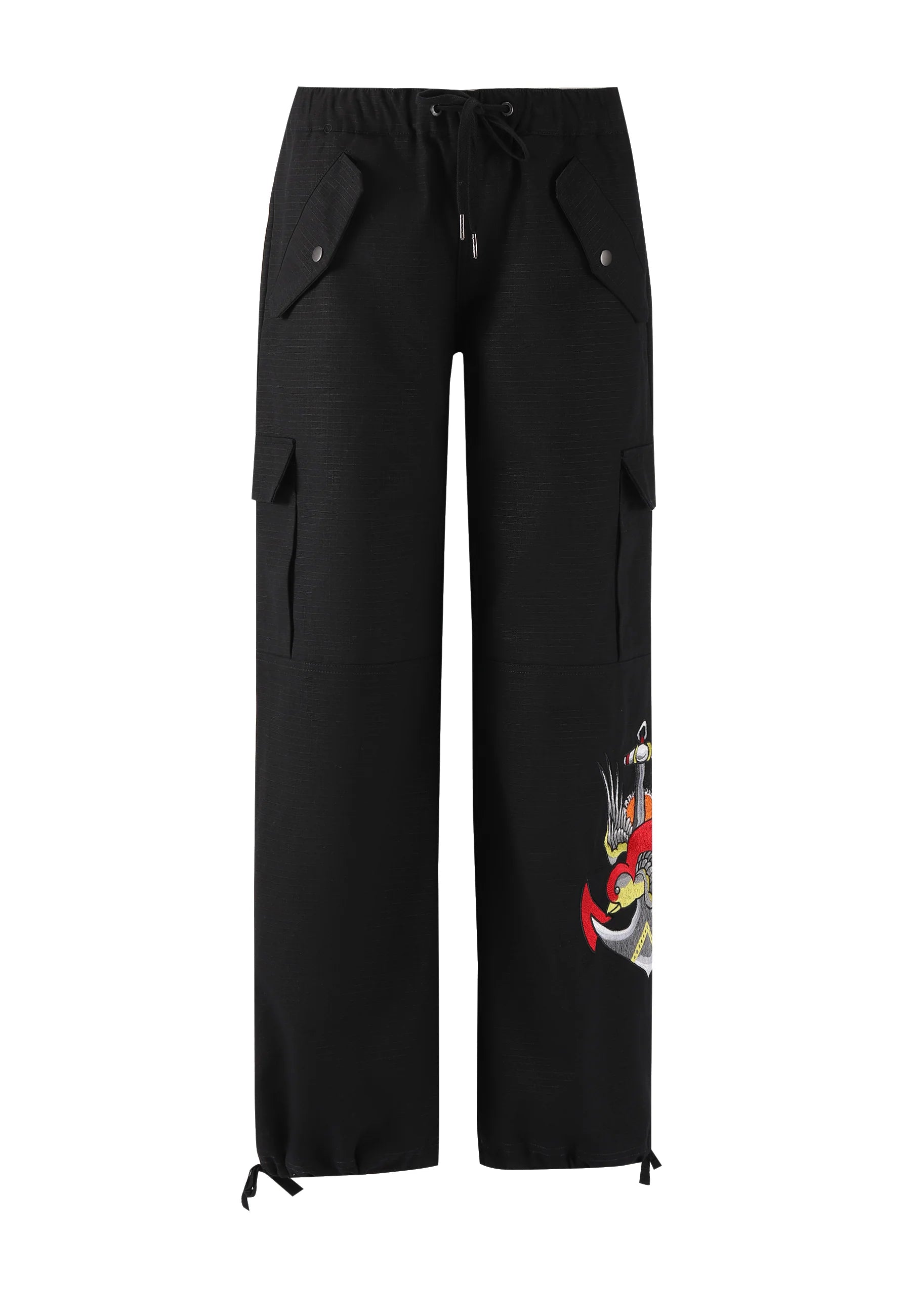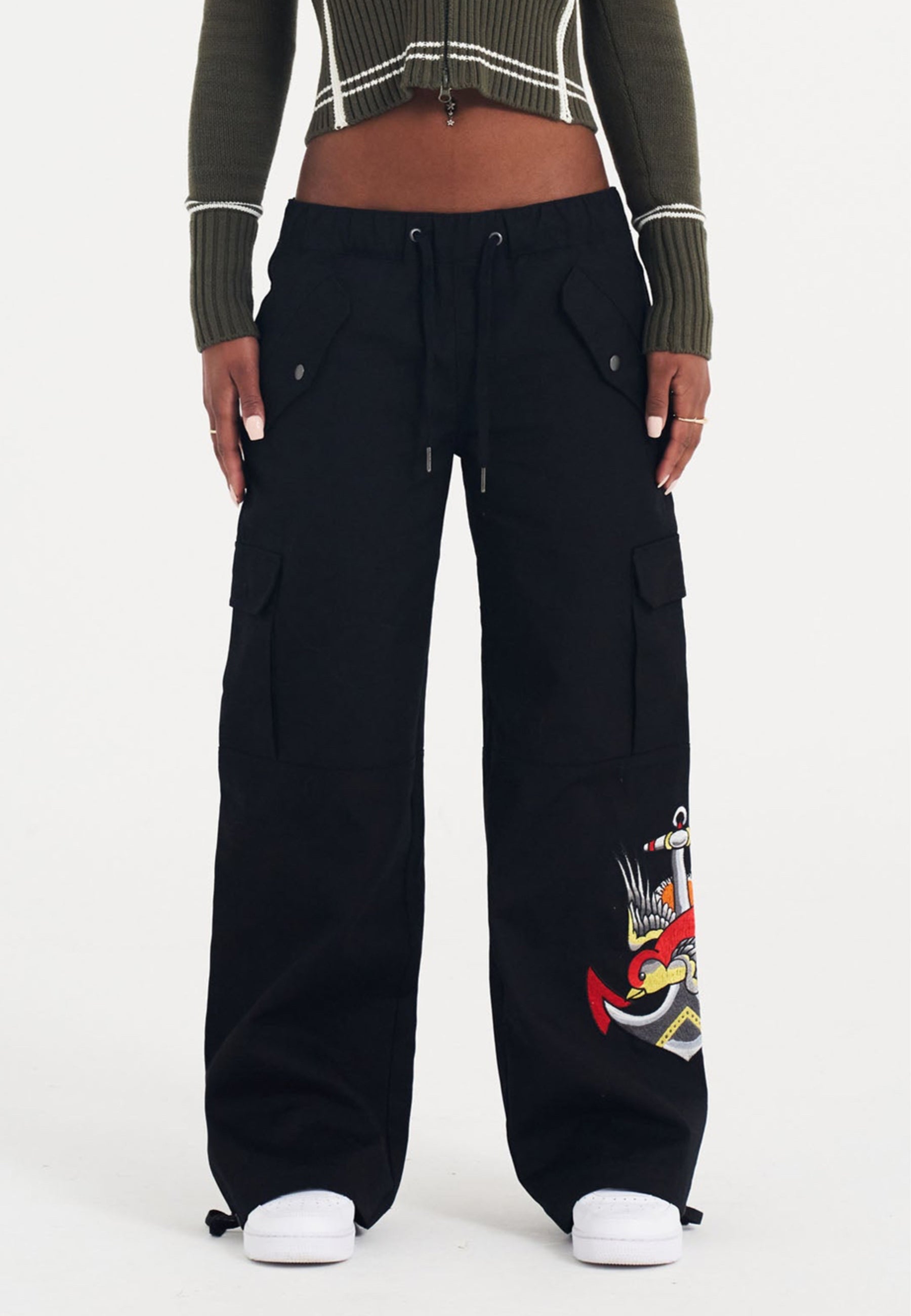 These black cargo trousers offer a relaxed fit with a wide leg. Designed with practicality in mind, they feature two velcro pockets on each leg, two poppered front pockets, and a zip back pocket. The drawstring cuffs add versatility, while the embroidered logo and calf patch graphic bring a touch of Ed Hardy's iconic tattoo style, finished with a signature logo on the back pocket.