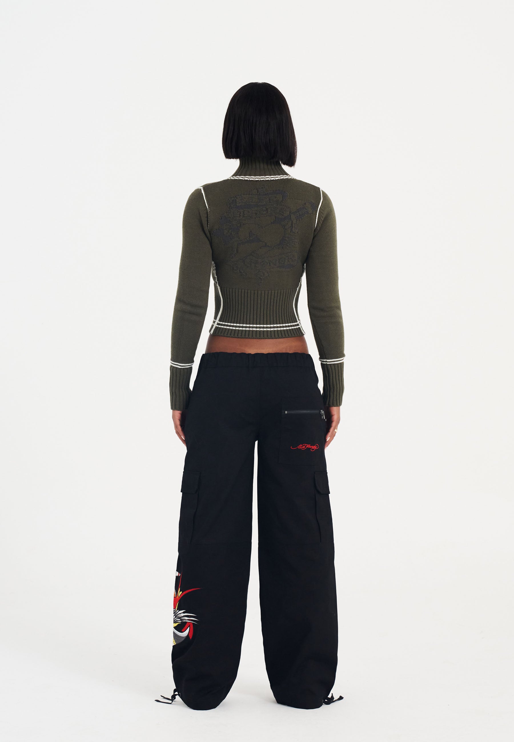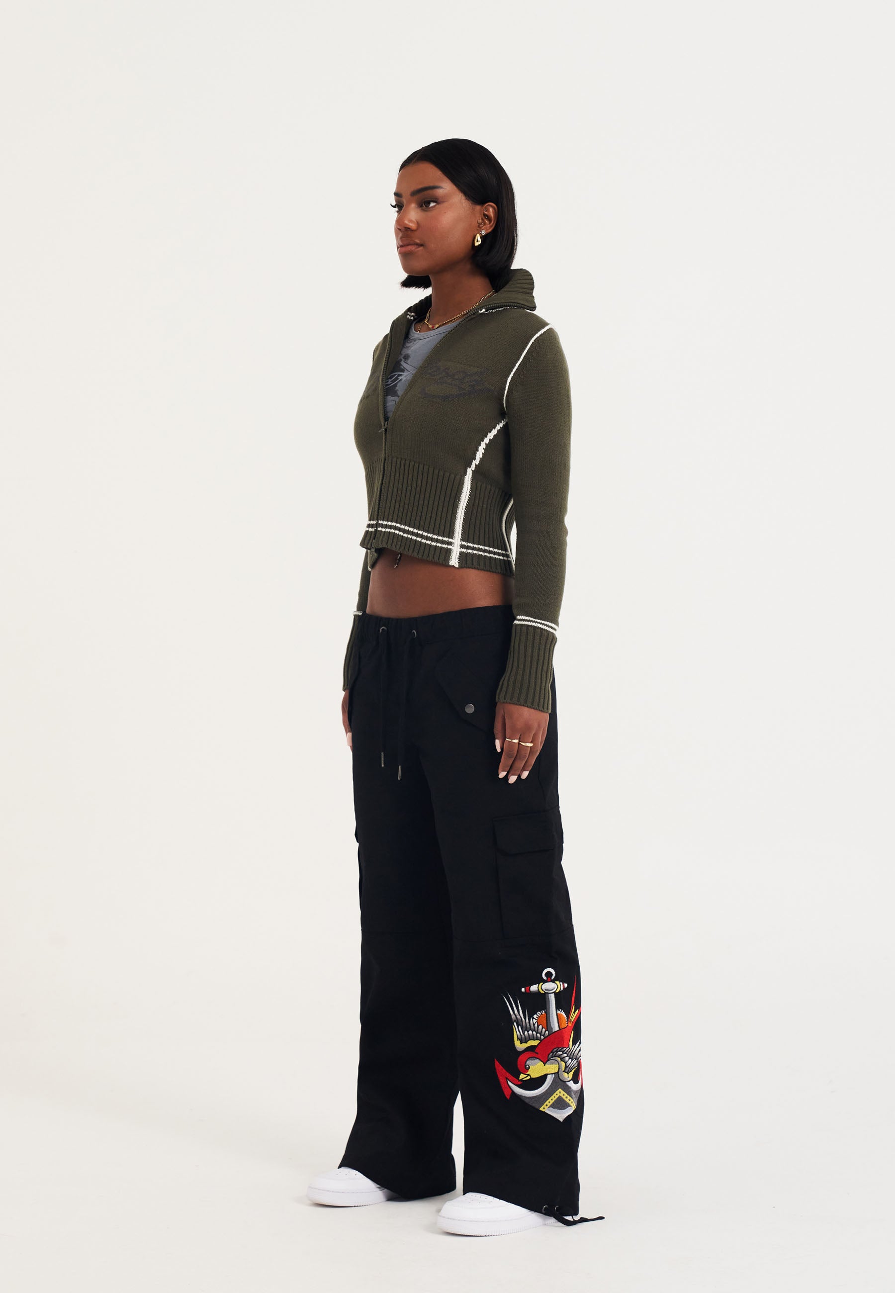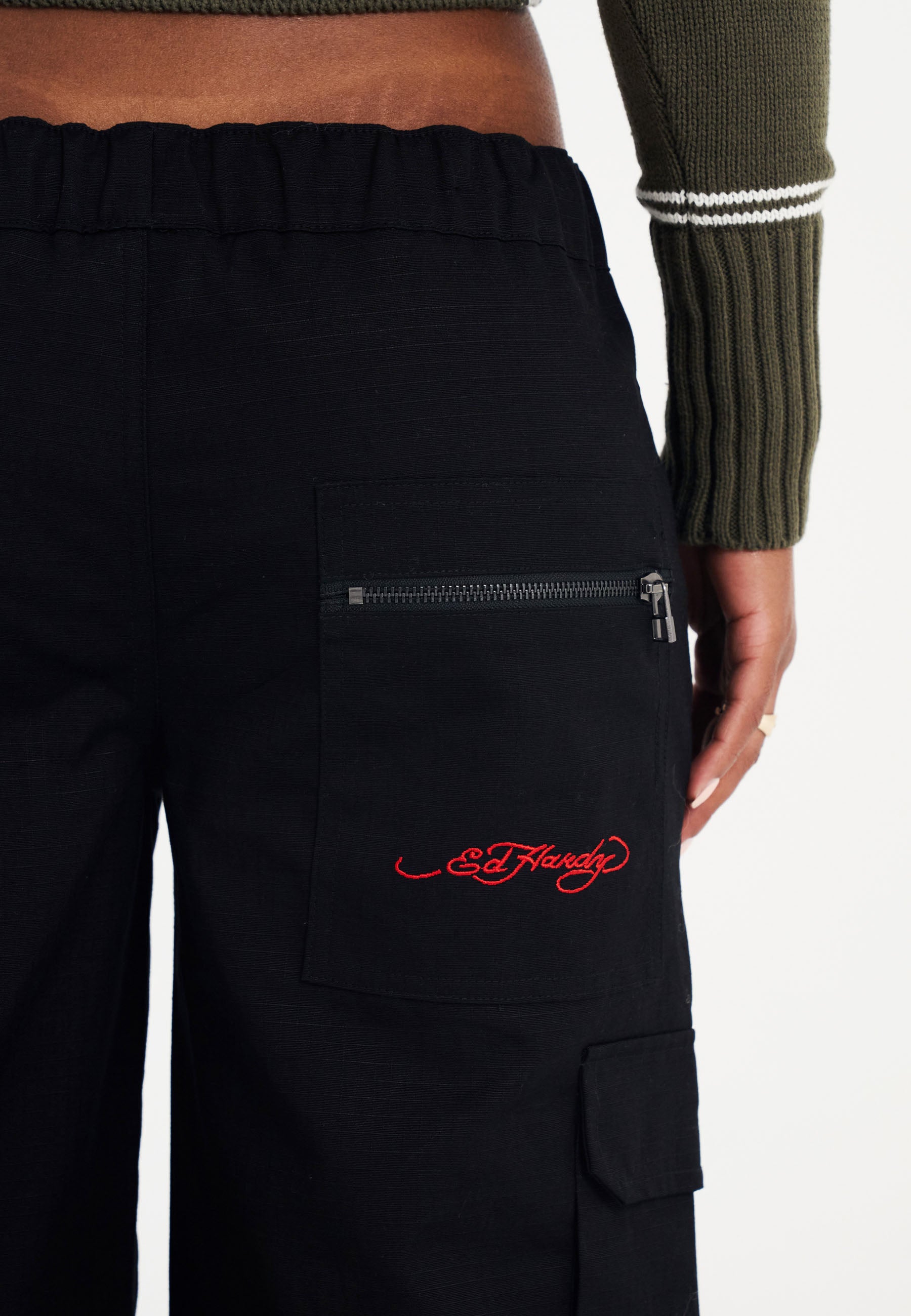 These black cargo trousers offer a relaxed fit with a wide leg. Designed with practicality in mind, they feature two velcro pockets on each leg, two poppered front pockets, and a zip back pocket. The drawstring cuffs add versatility, while the embroidered logo and calf patch graphic bring a touch of Ed Hardy's iconic tattoo style, finished with a signature logo on the back pocket.