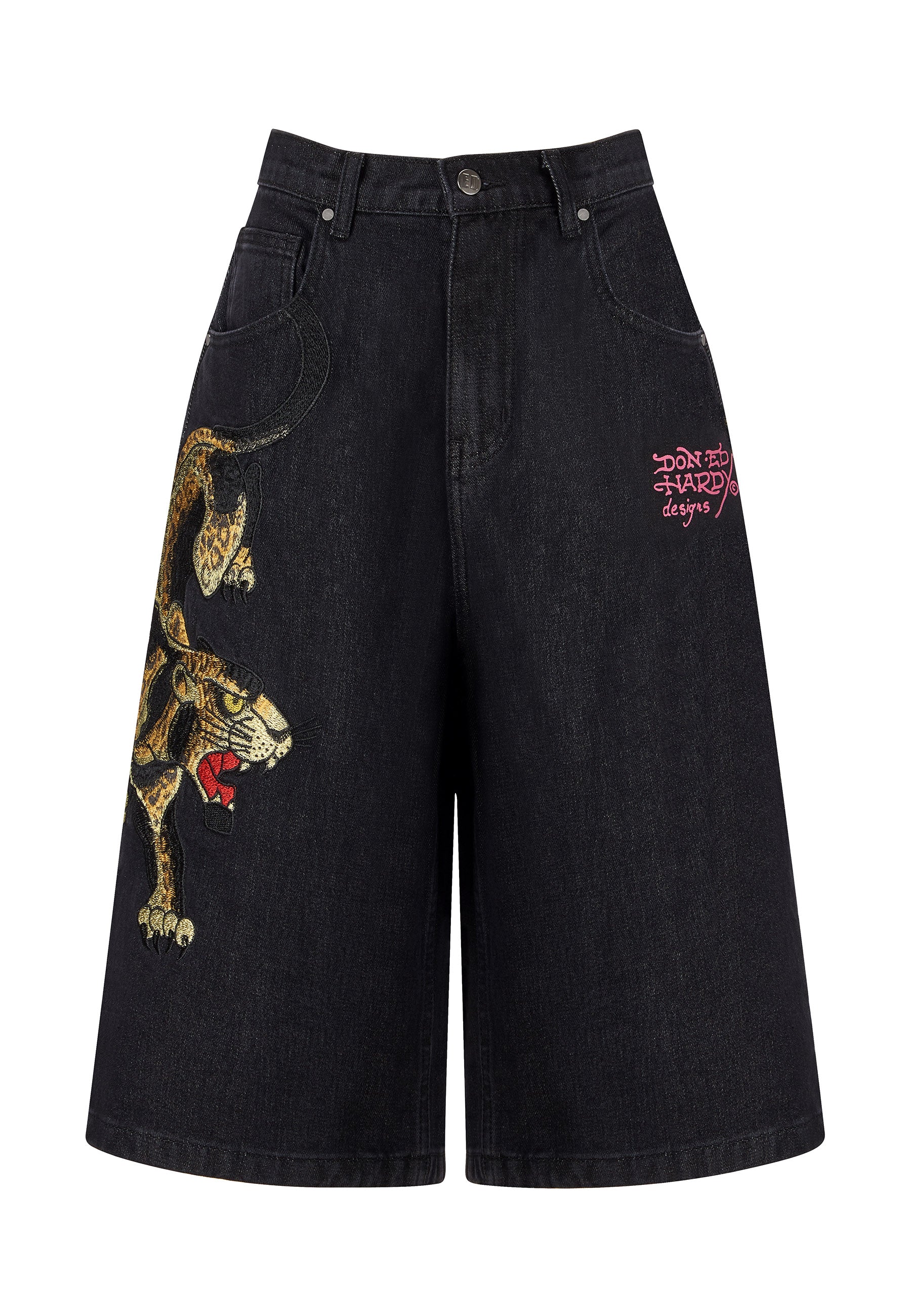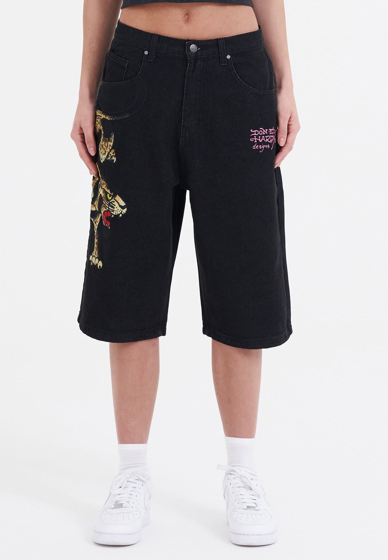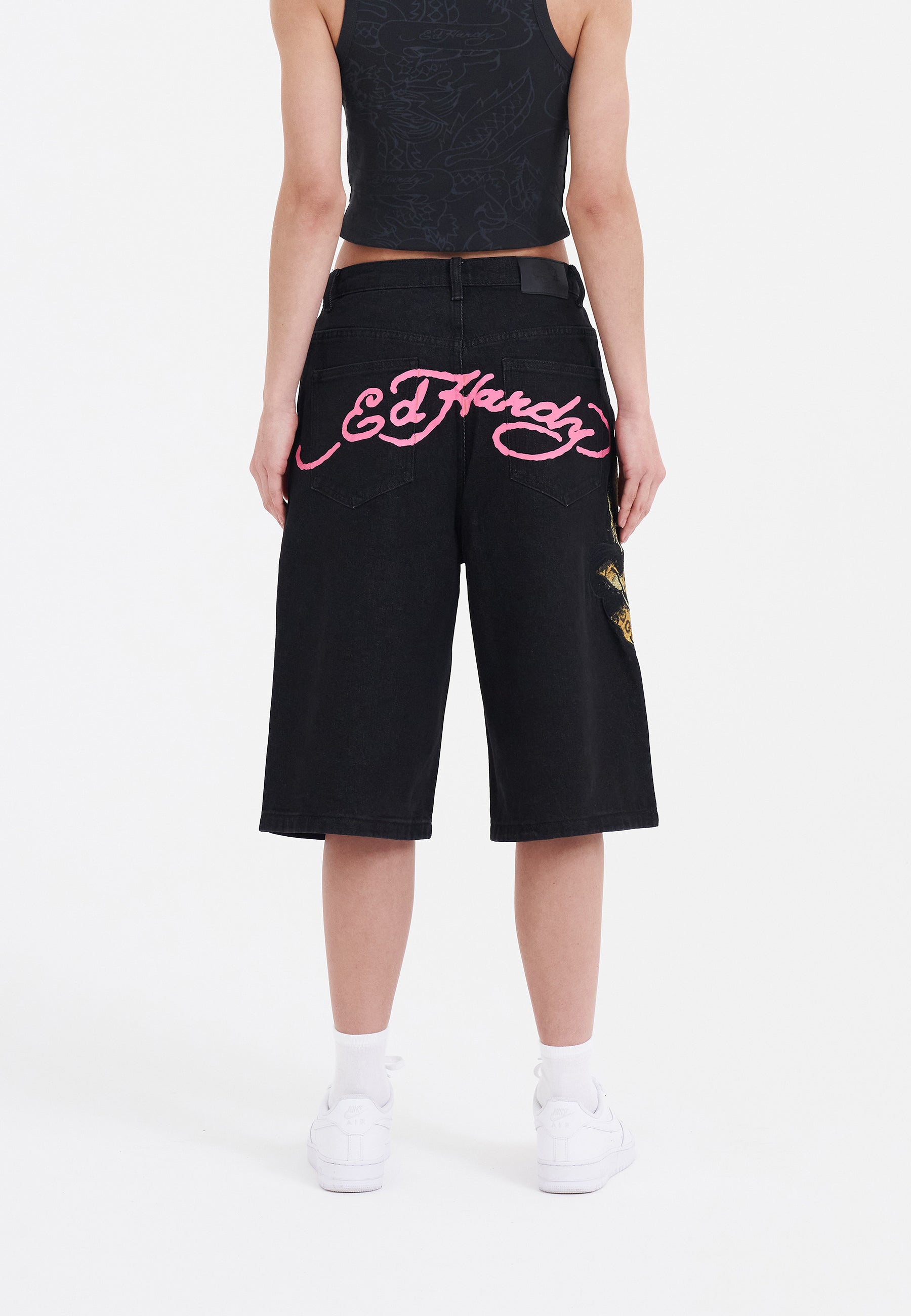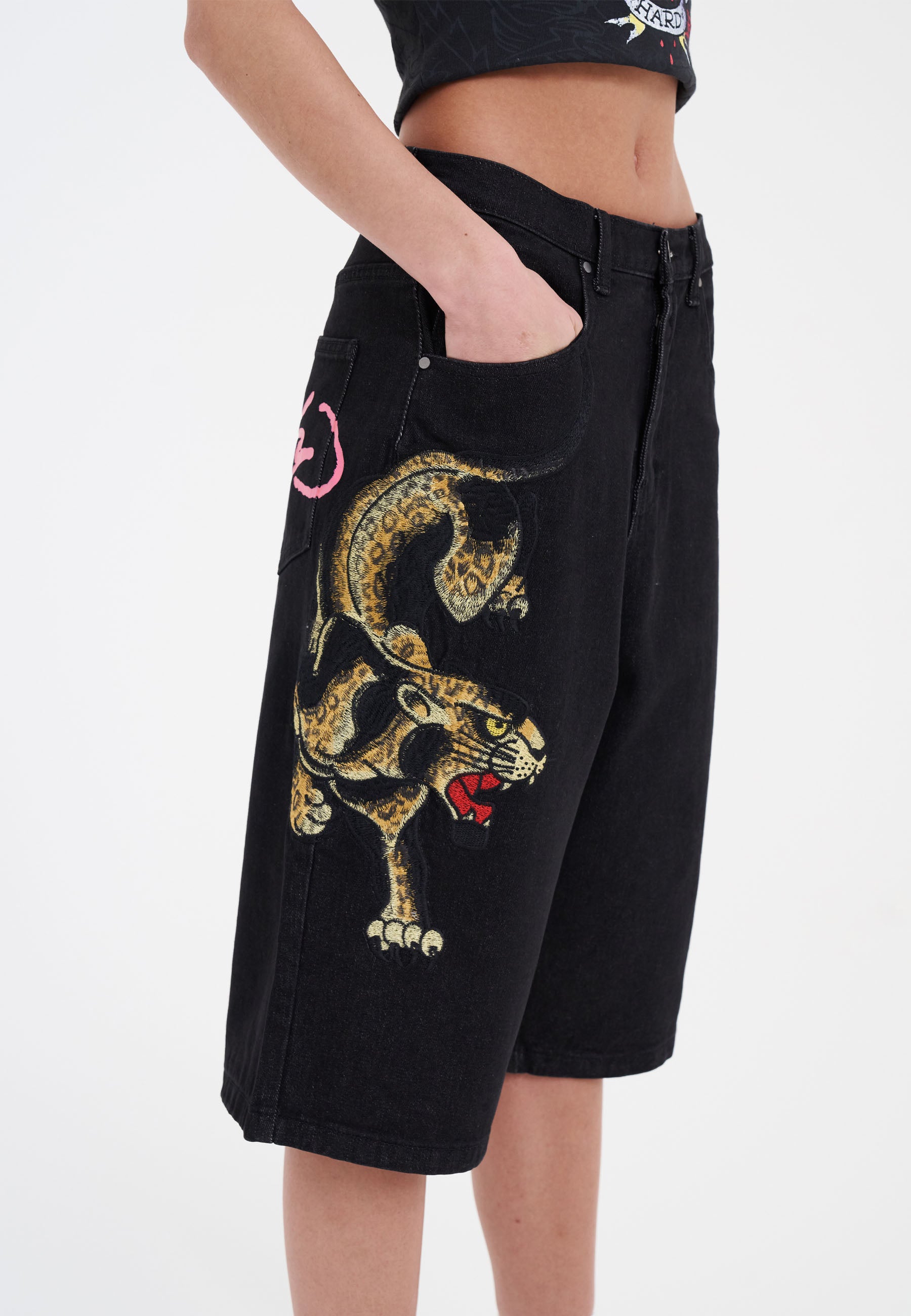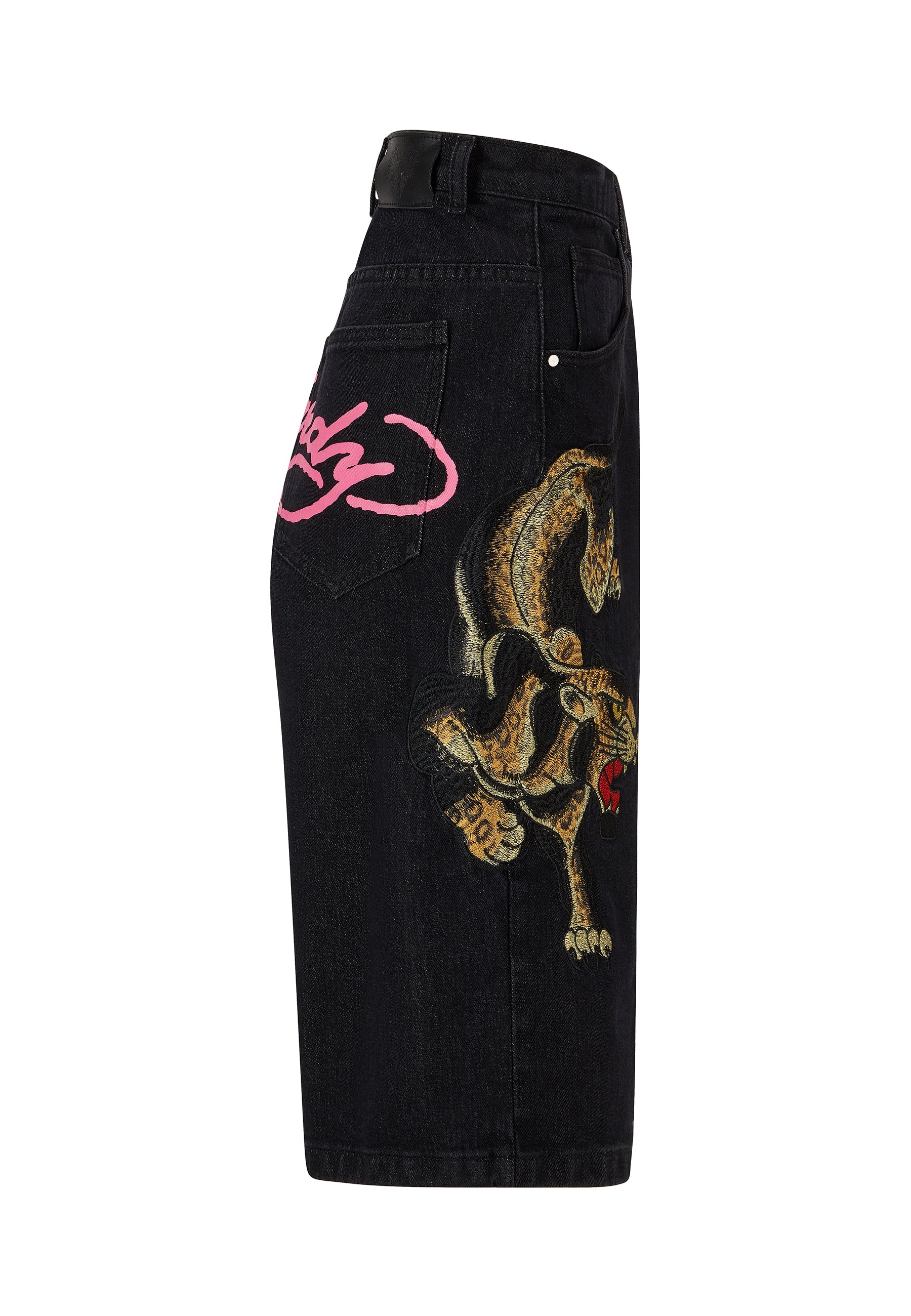 The Panther Crawl relaxed short in black, 100% cotton denim features an eye-catching full-colour embroidered illustration and the Ed Hardy logo across the rear in pink.