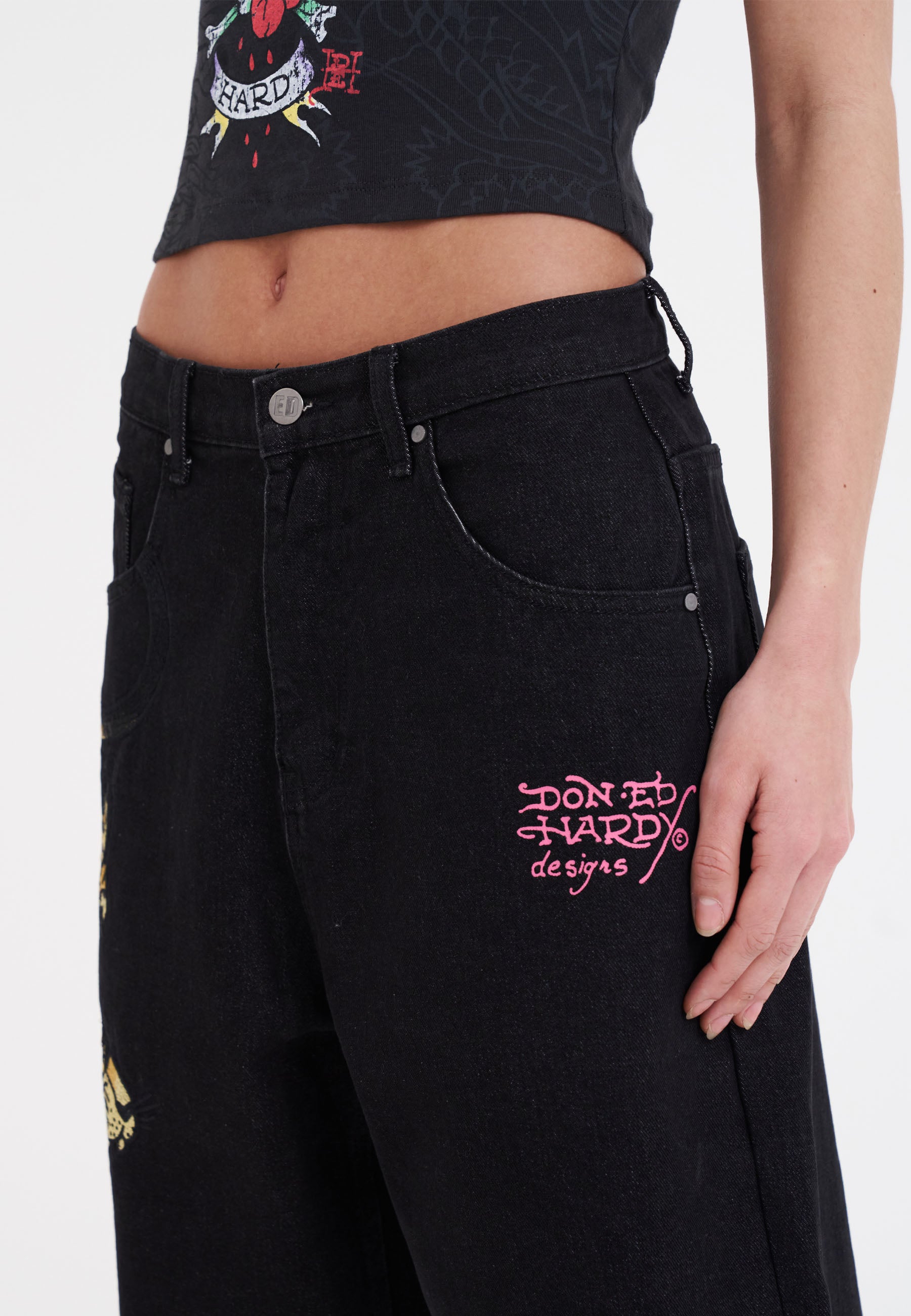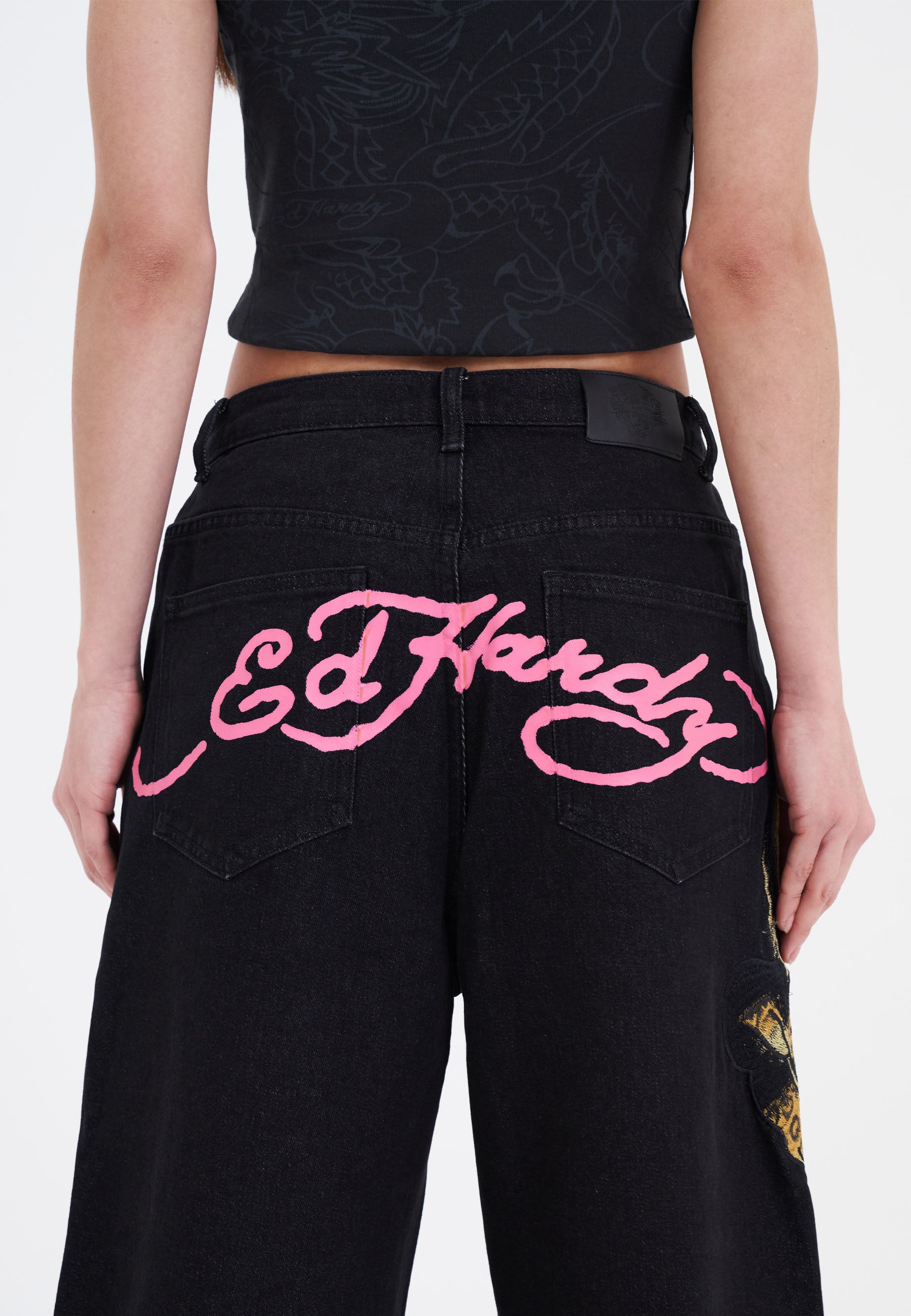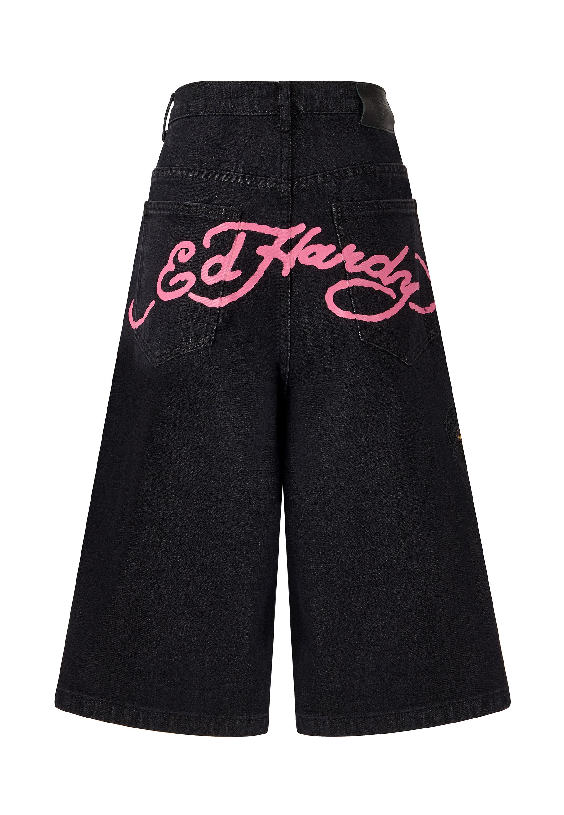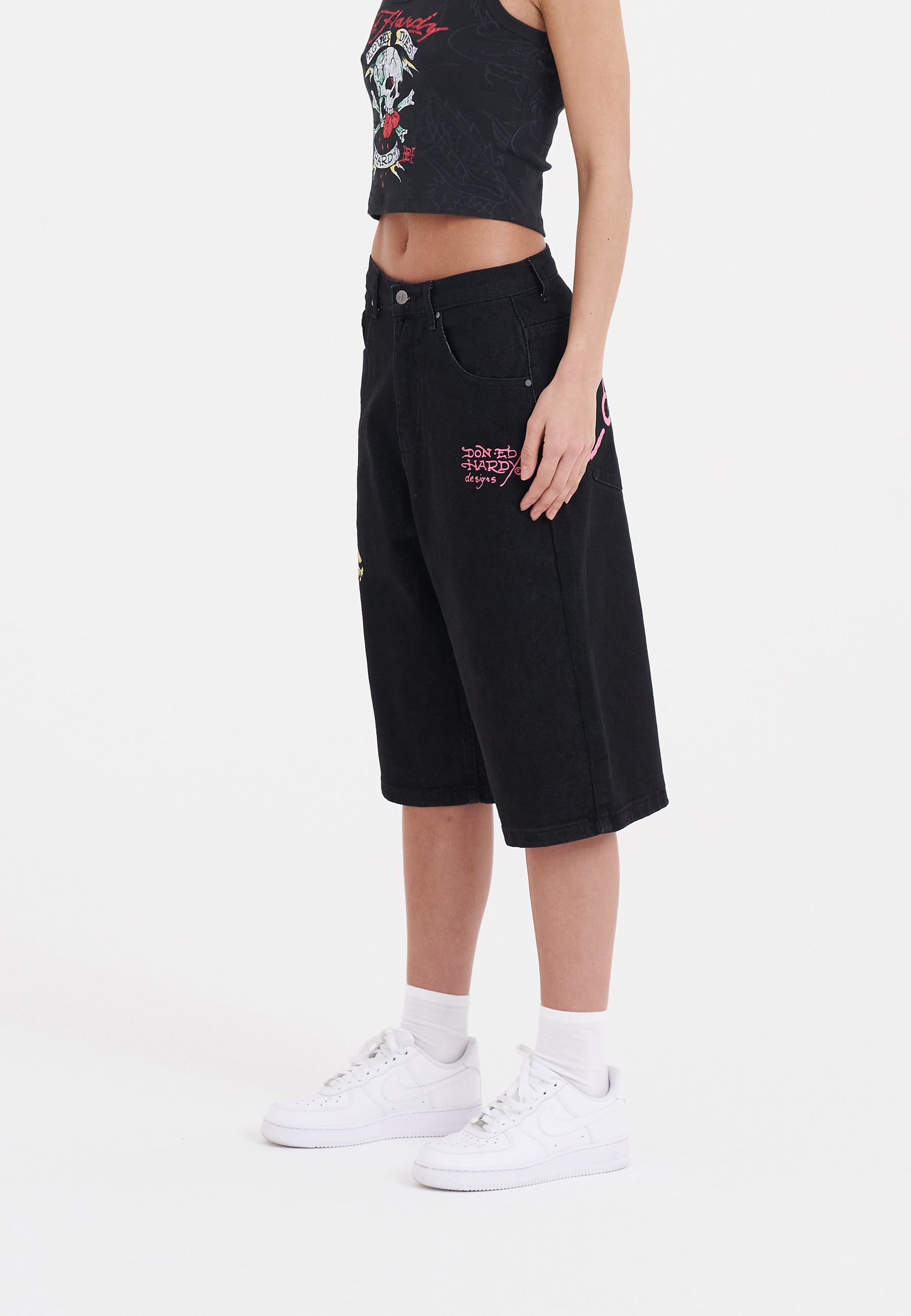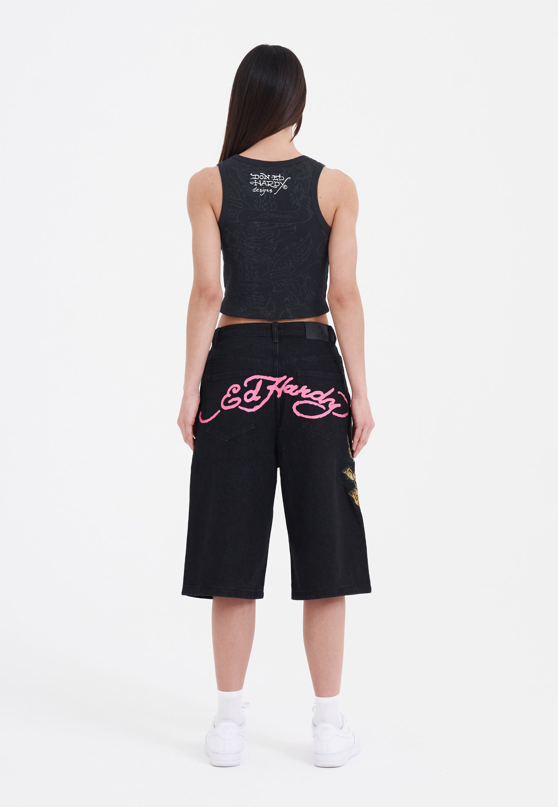 The Panther Crawl relaxed short in black, 100% cotton denim features an eye-catching full-colour embroidered illustration and the Ed Hardy logo across the rear in pink.