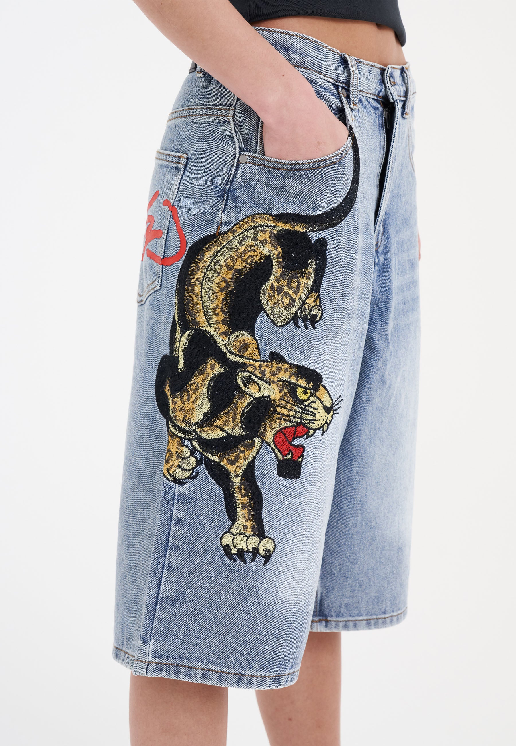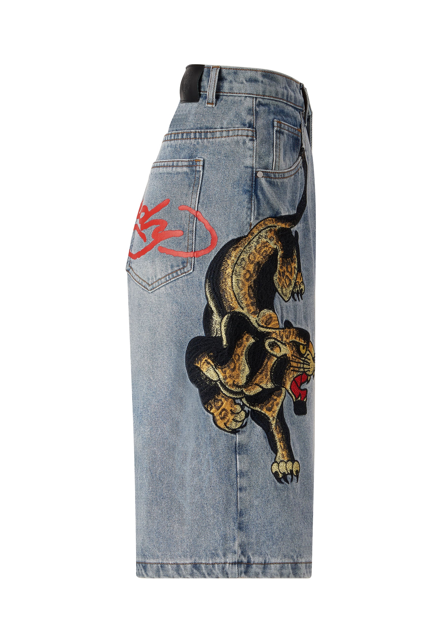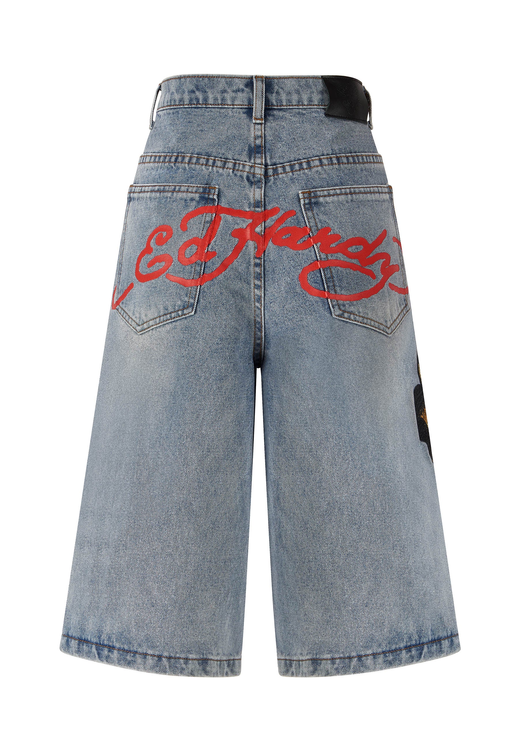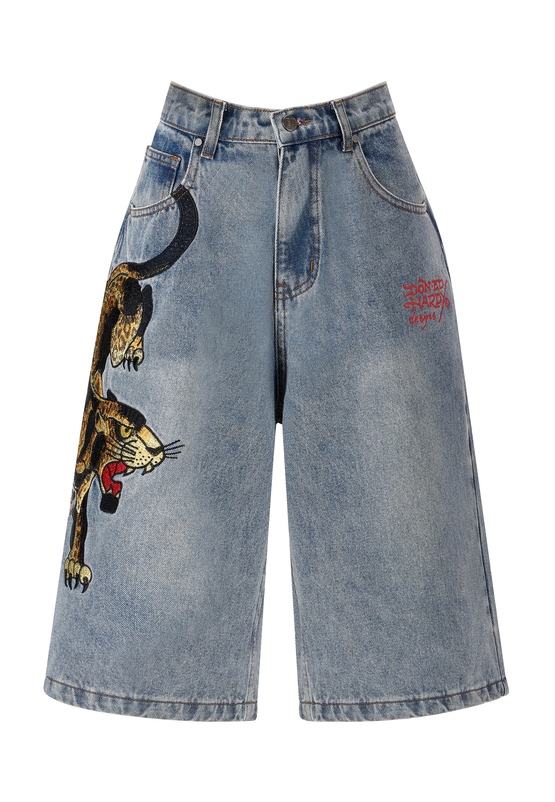 A vicious prowling panther is embroidered in high-definition colour down the left thigh, and the iconic Ed Hardy signature is splashed across the back pockets.