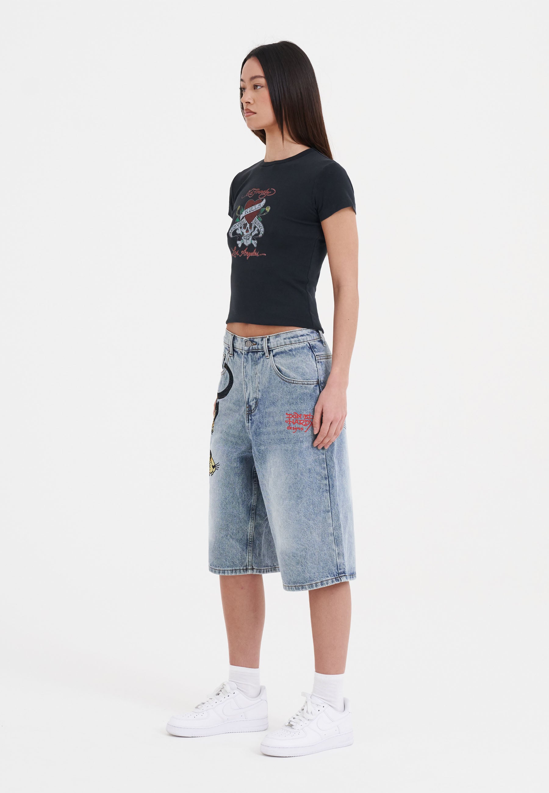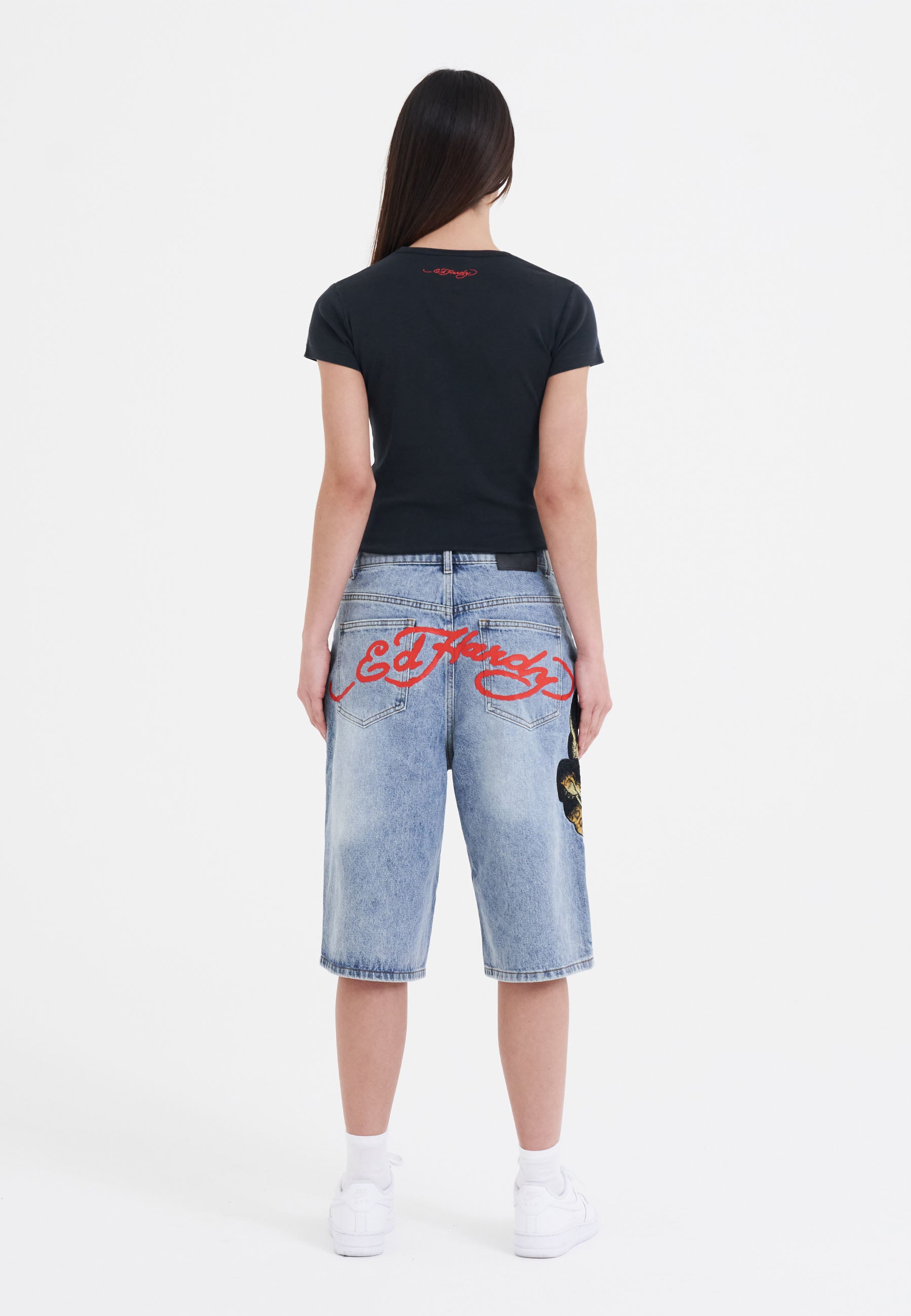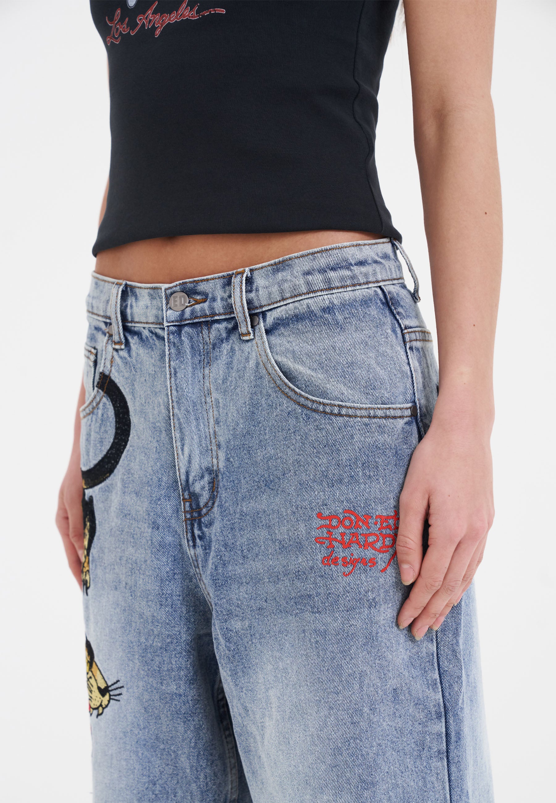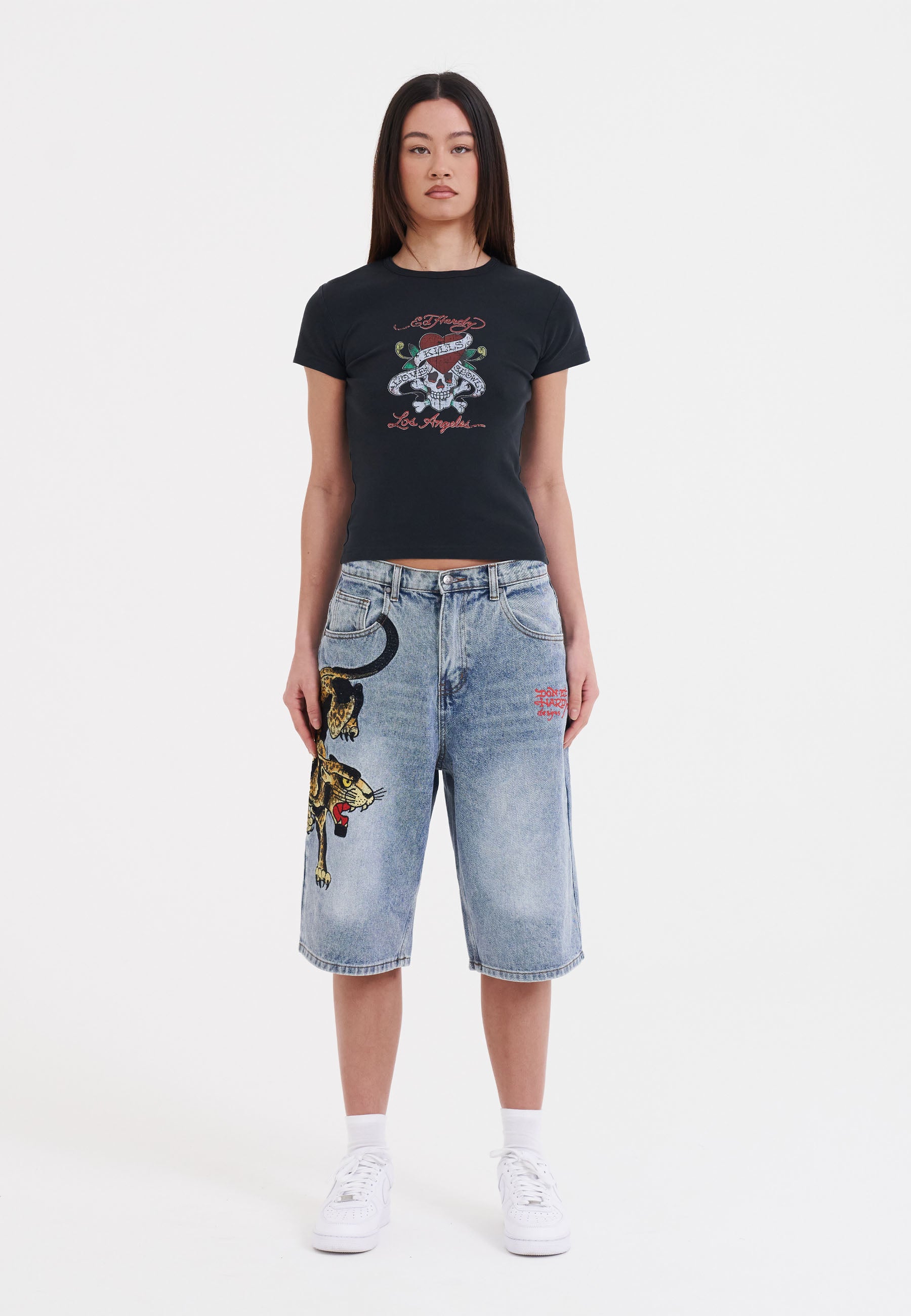 A vicious prowling panther is embroidered in high-definition colour down the left thigh, and the iconic Ed Hardy signature is splashed across the back pockets.
