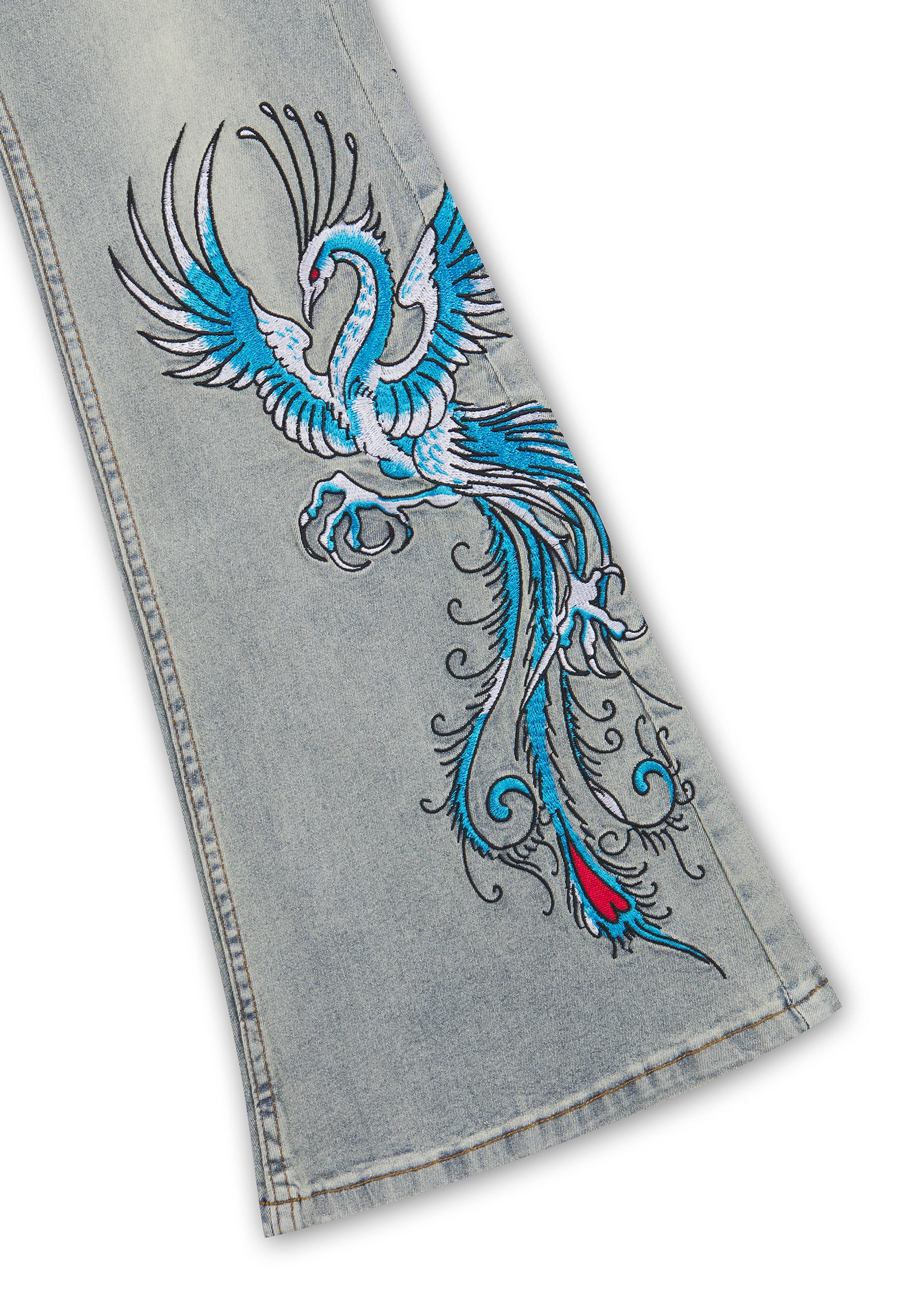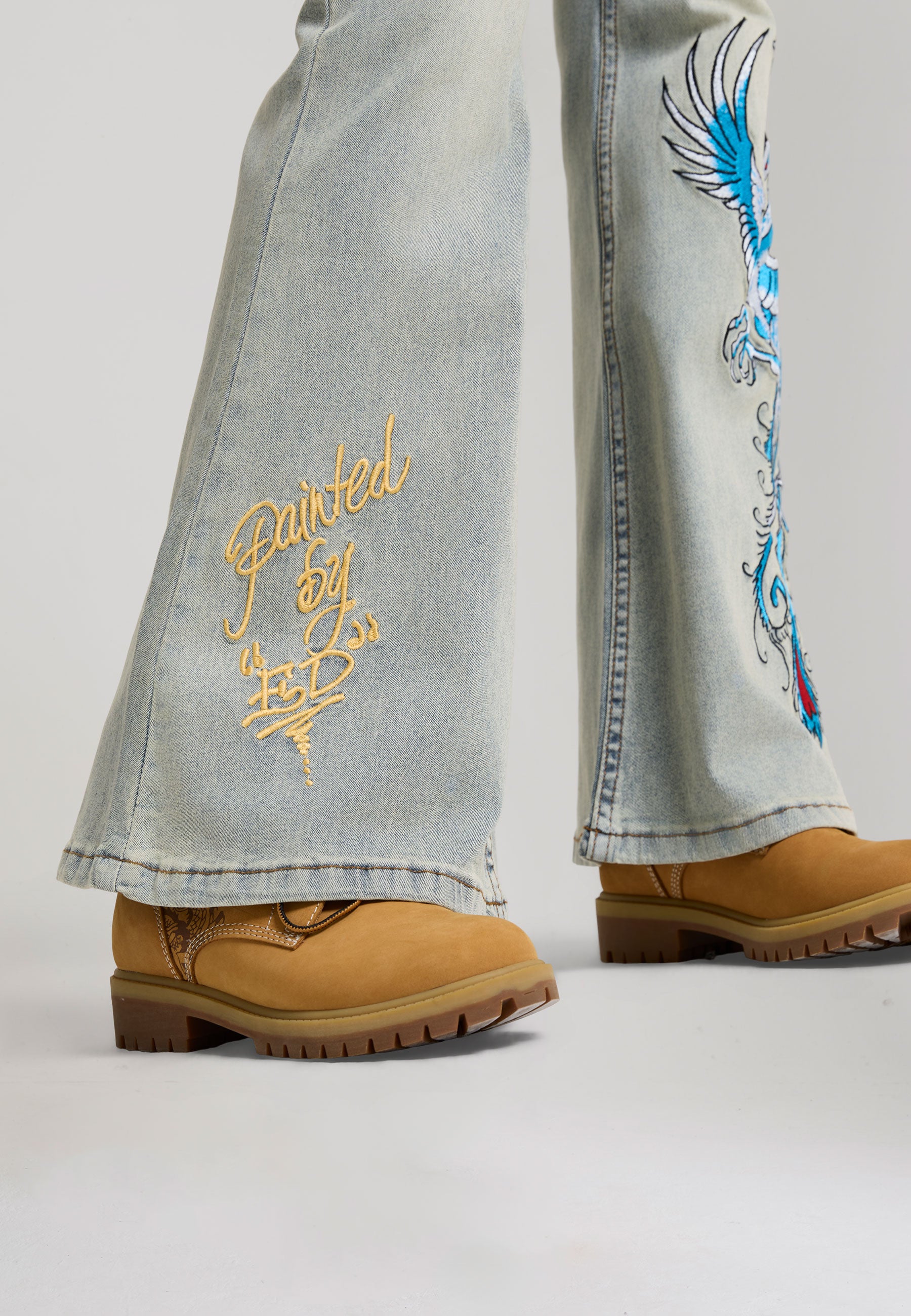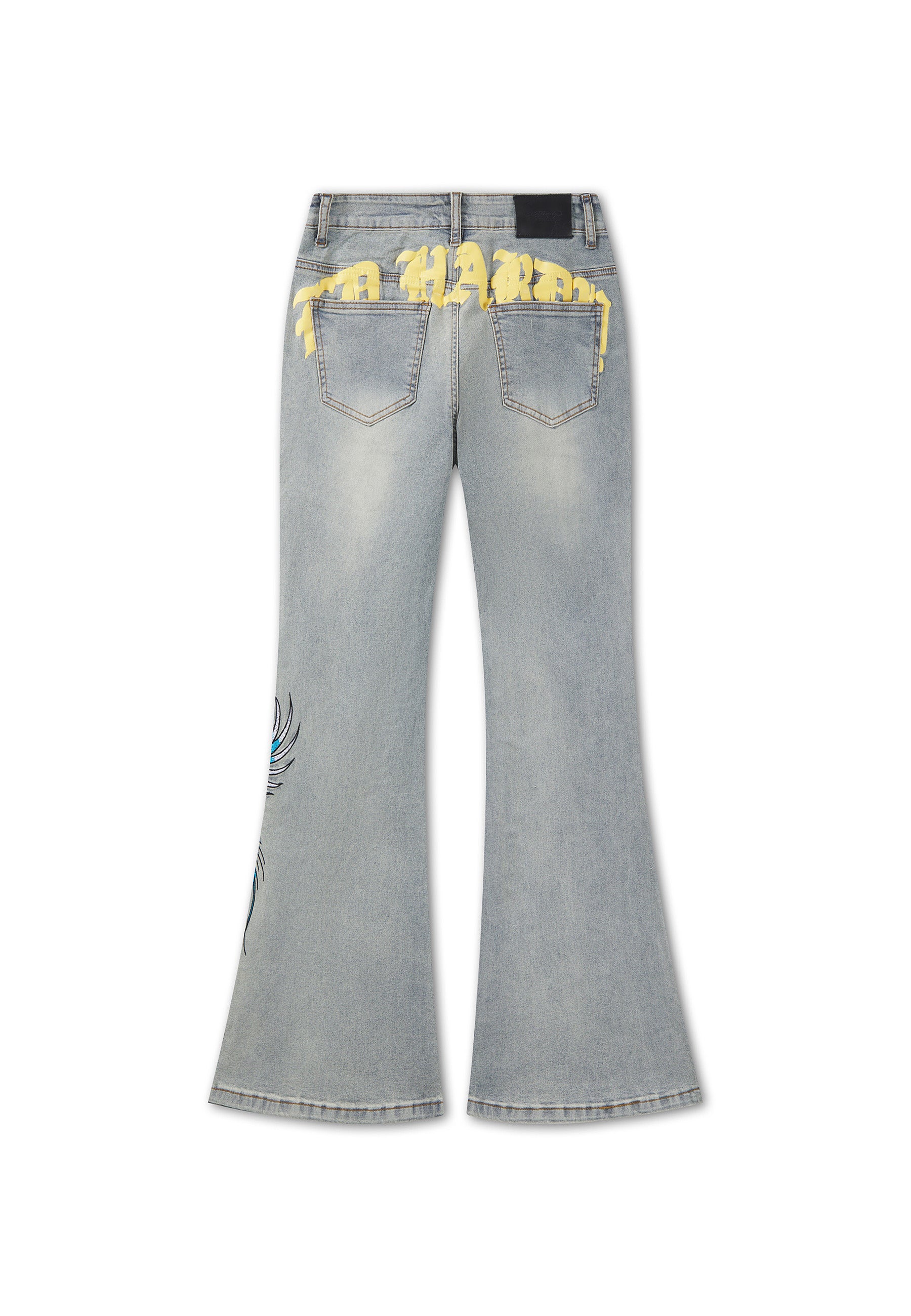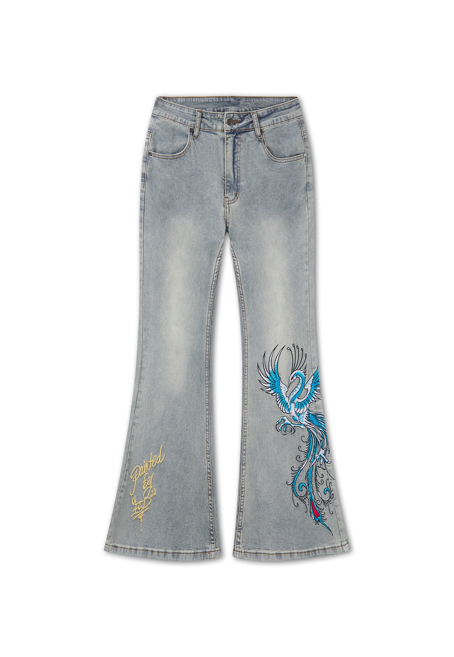 FLARED FIT VINTAGE WASH 100% COTTON DENIM GOTHIC ED HARDY PLASTEROL PRINT BEHIND BACK POCKETS RISING PHOENIX EMBROIDERY TO FRONT LEFT LEG PAINTED BY ED EMBROIDERY TO FRONT RIGHT LEG