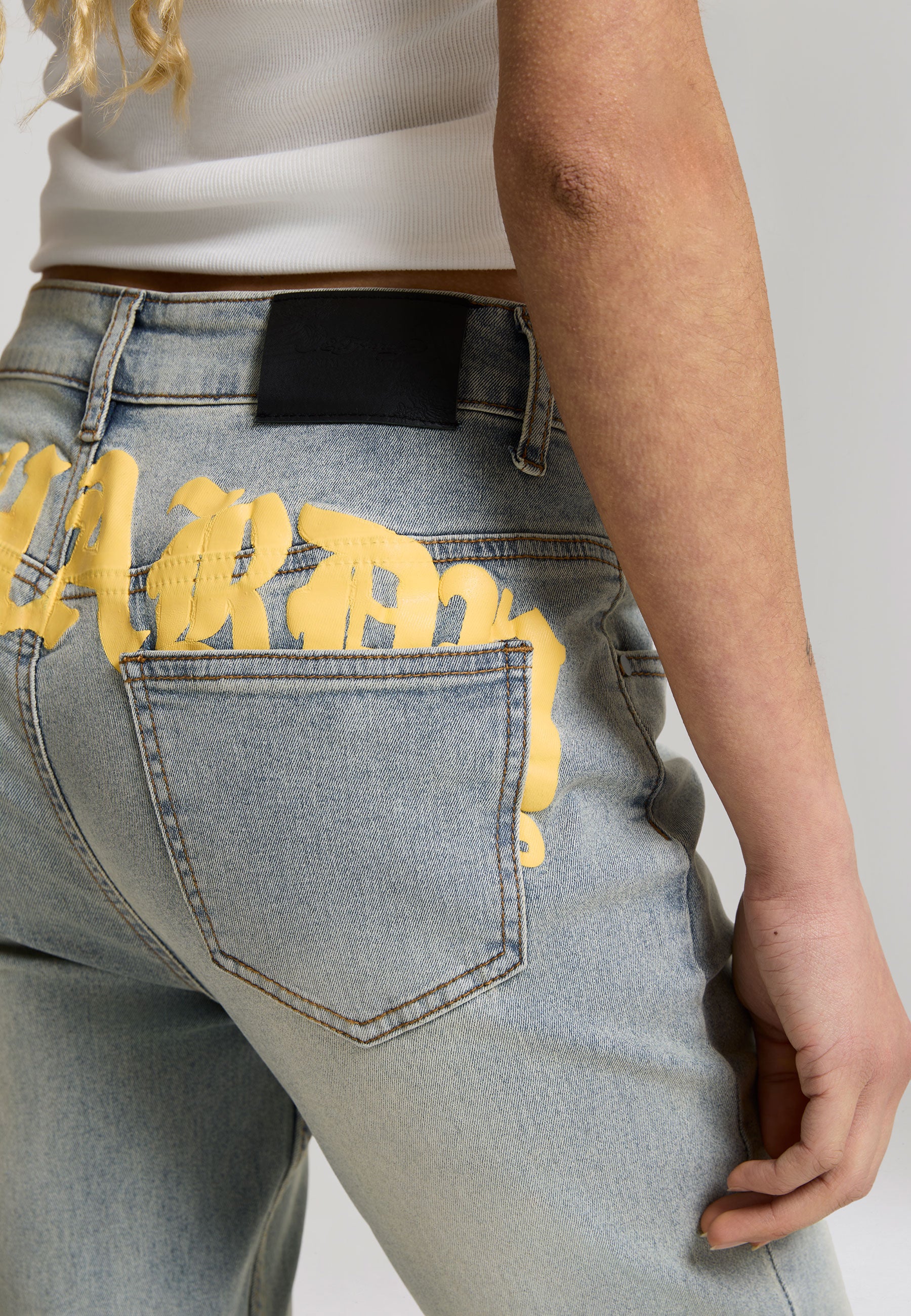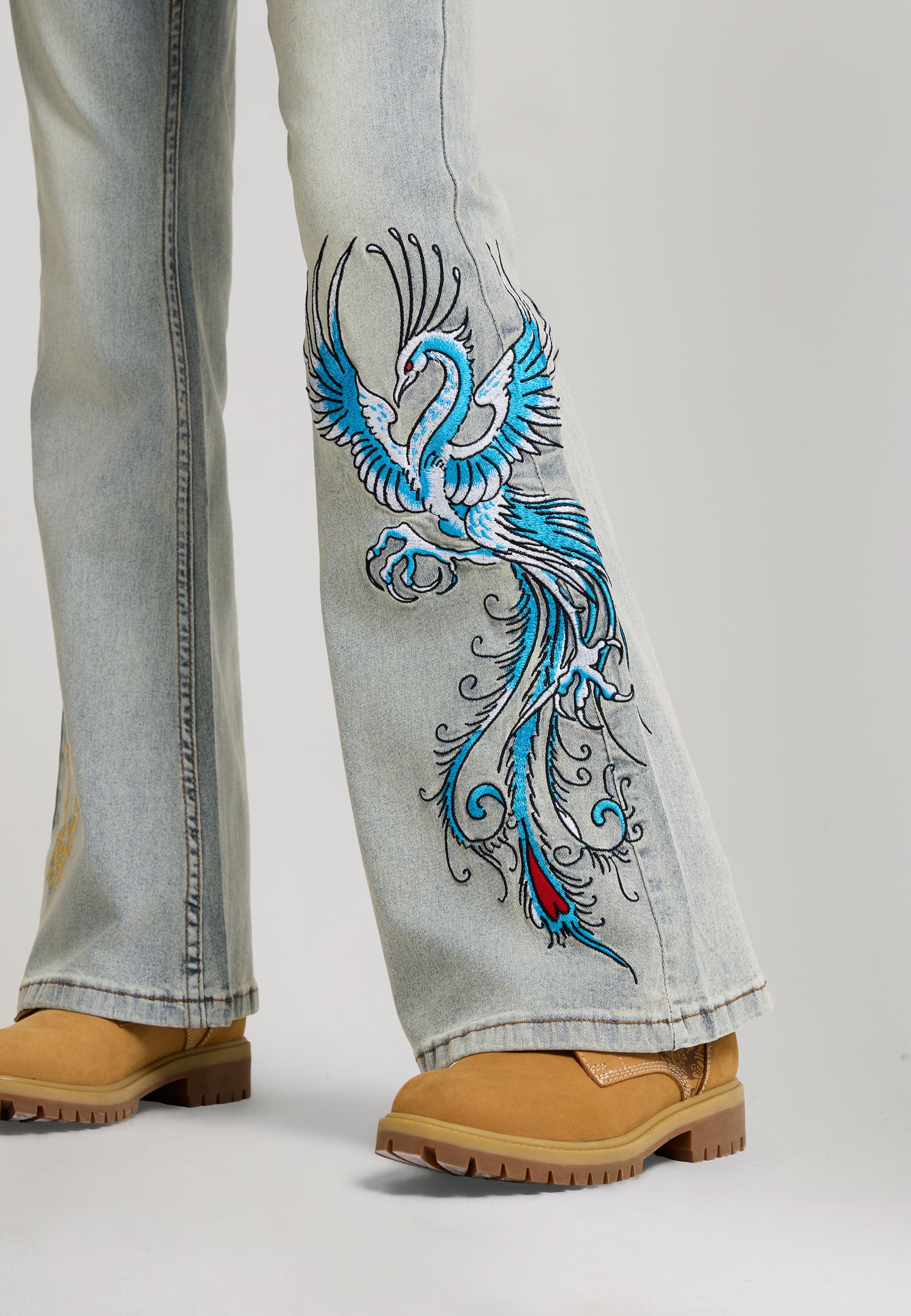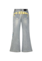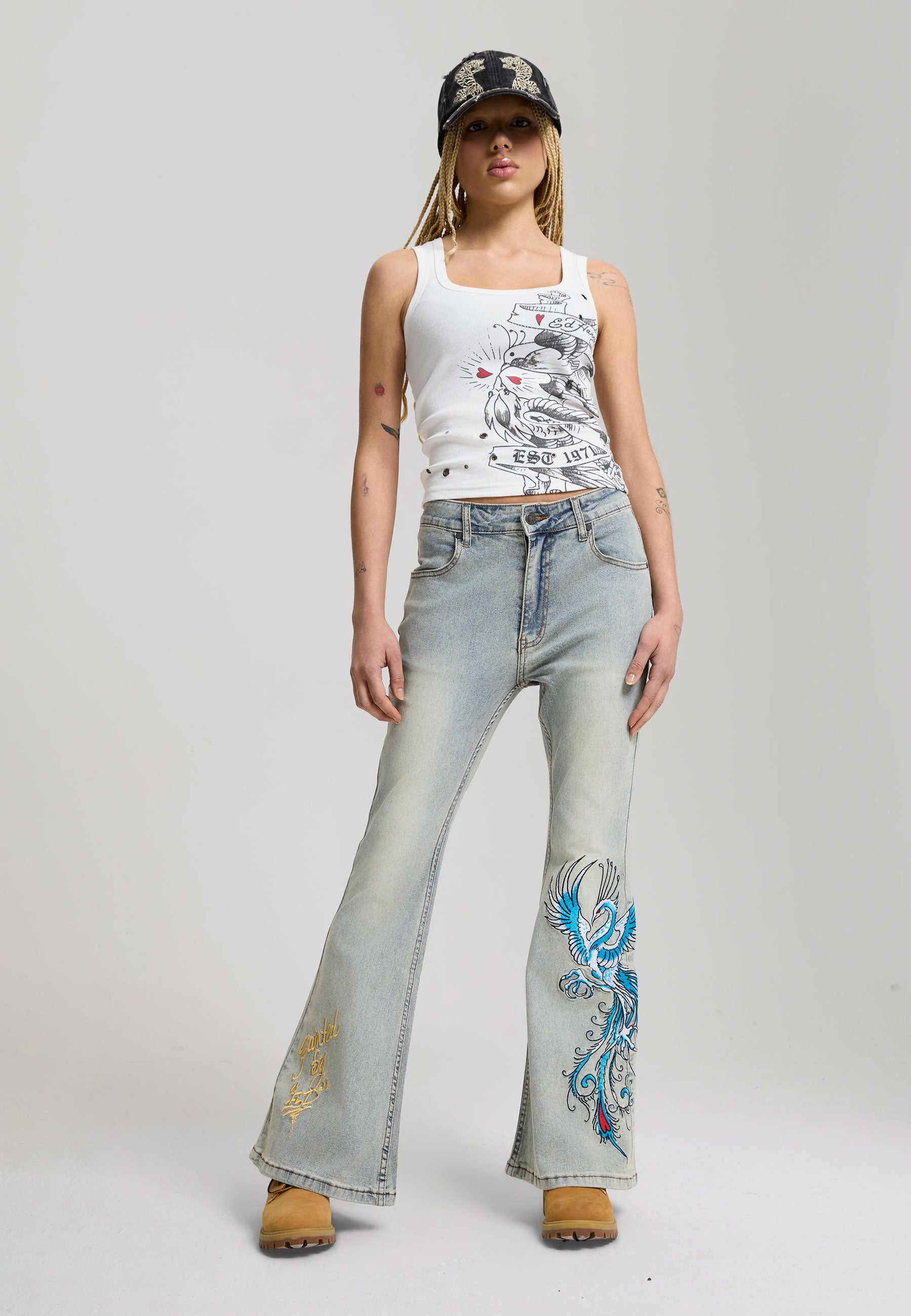 FLARED FIT VINTAGE WASH 100% COTTON DENIM GOTHIC ED HARDY PLASTEROL PRINT BEHIND BACK POCKETS RISING PHOENIX EMBROIDERY TO FRONT LEFT LEG PAINTED BY ED EMBROIDERY TO FRONT RIGHT LEG