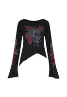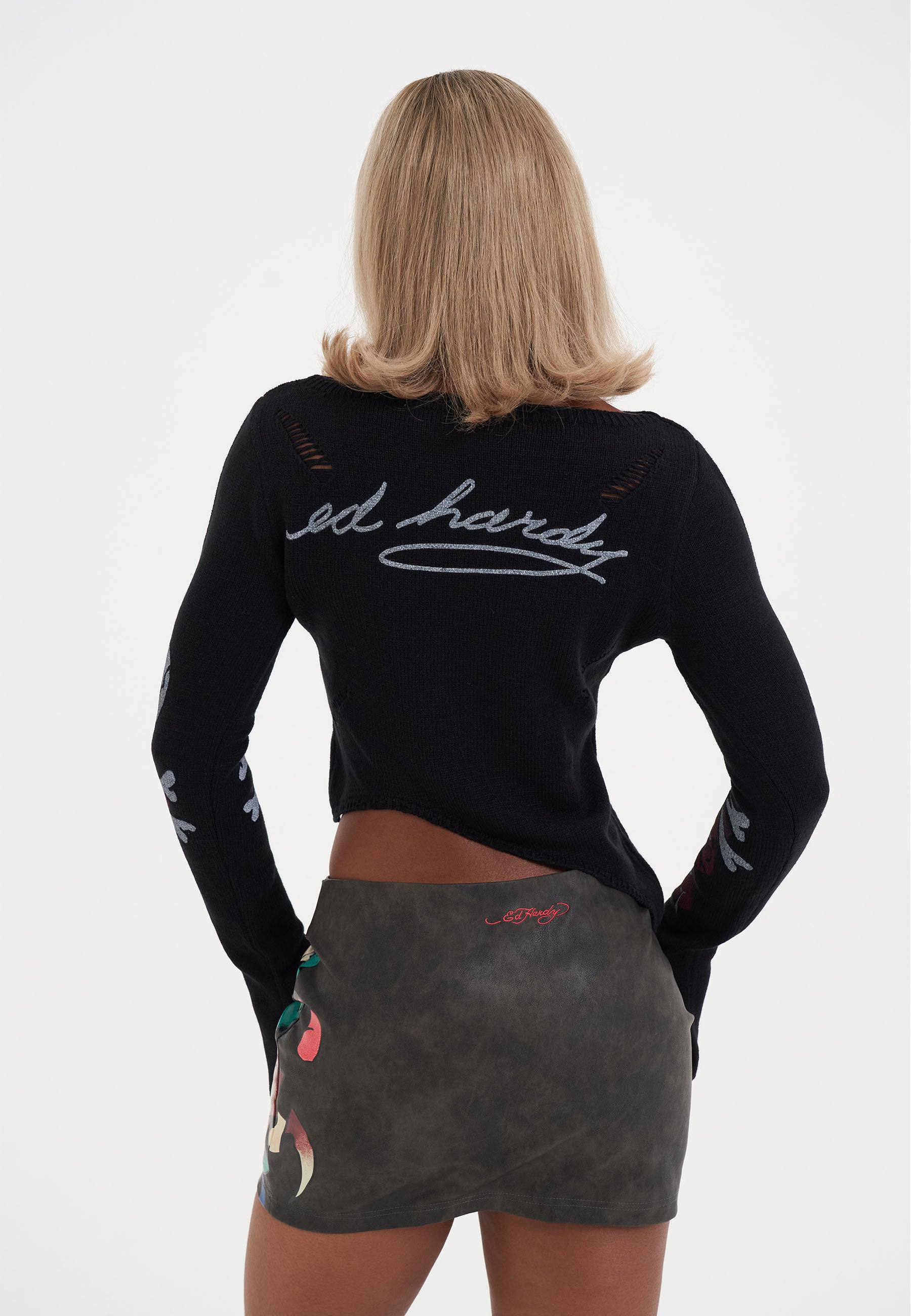Womens Skull And Roses Distressed Knitted Jumper - Black