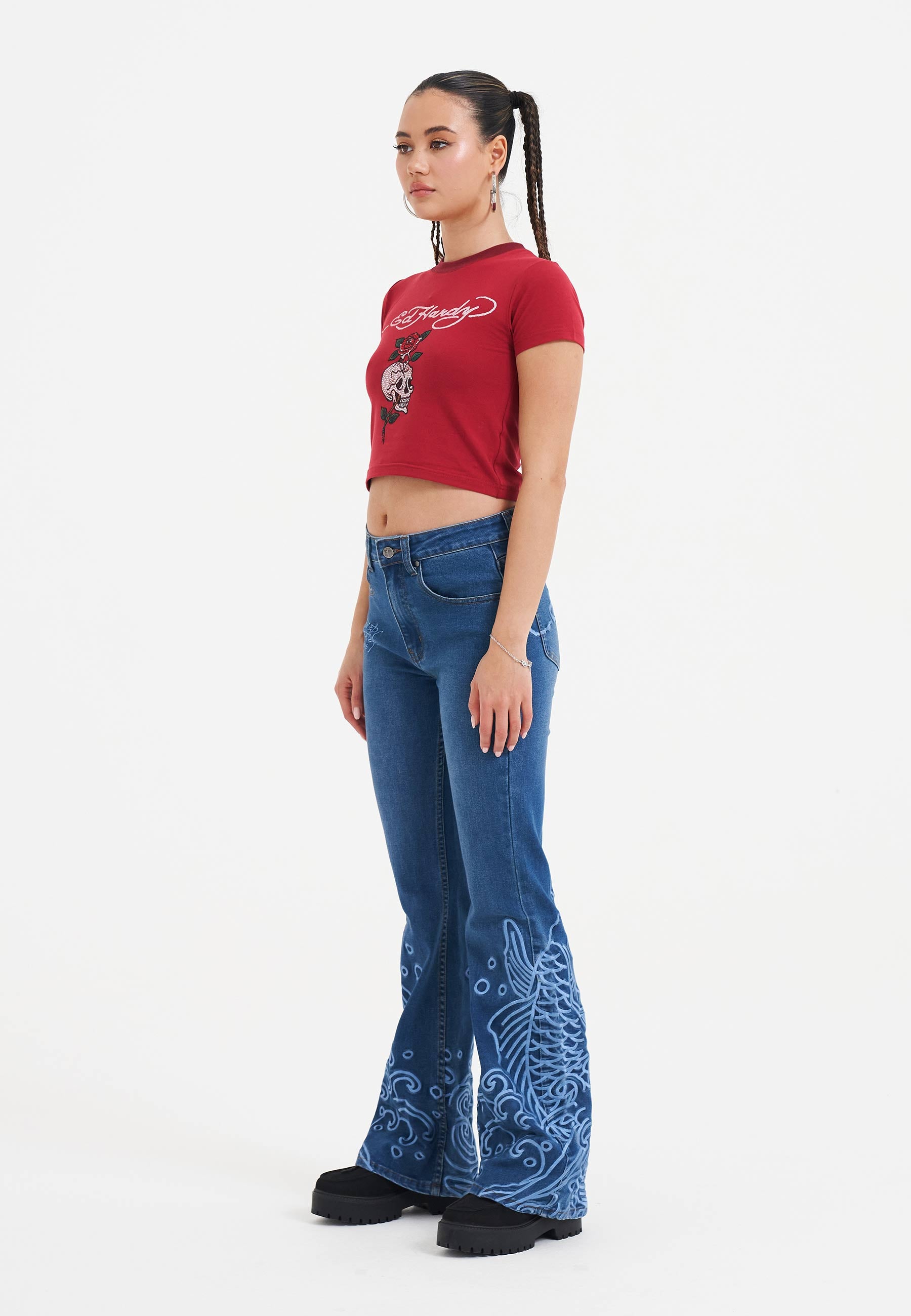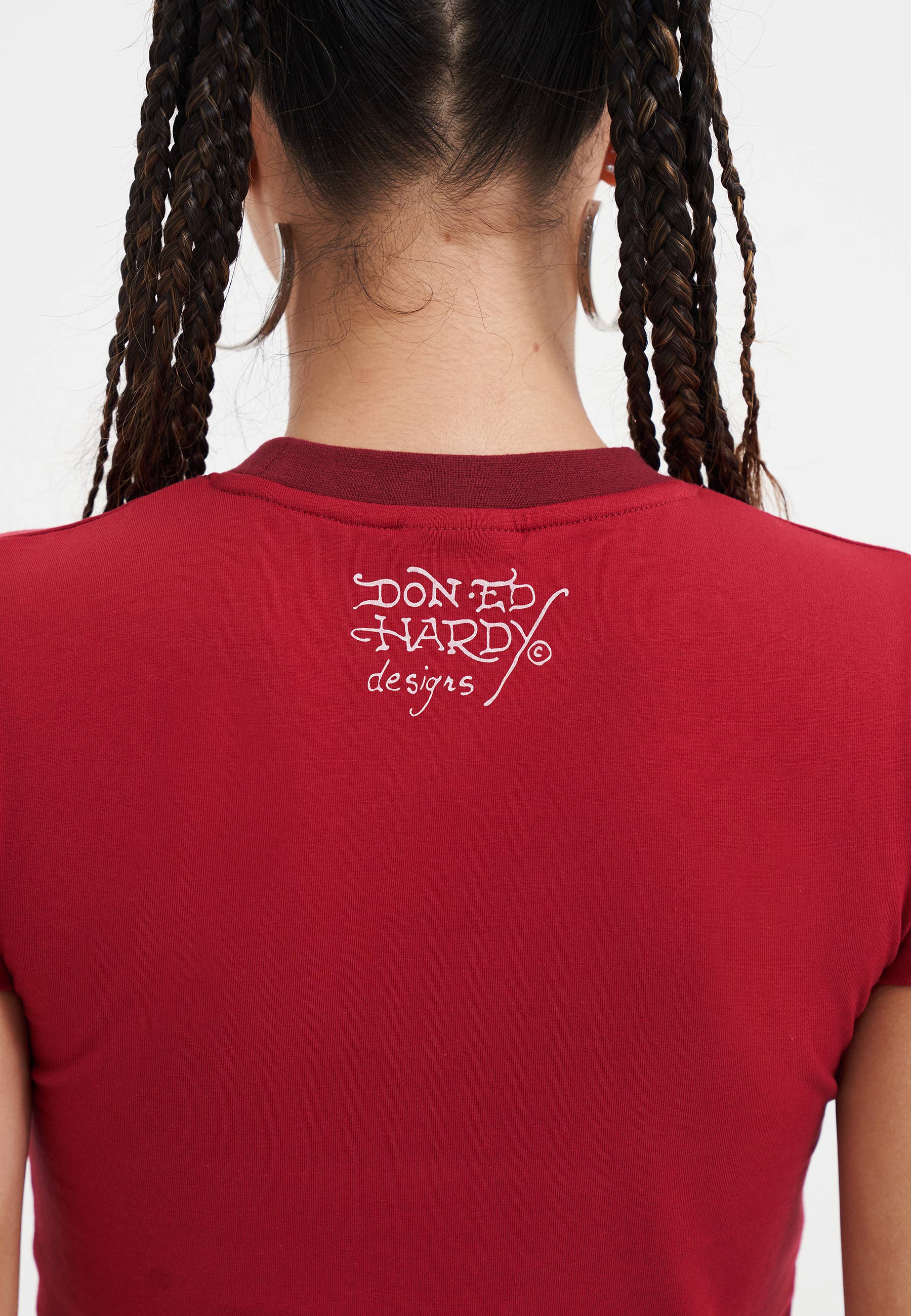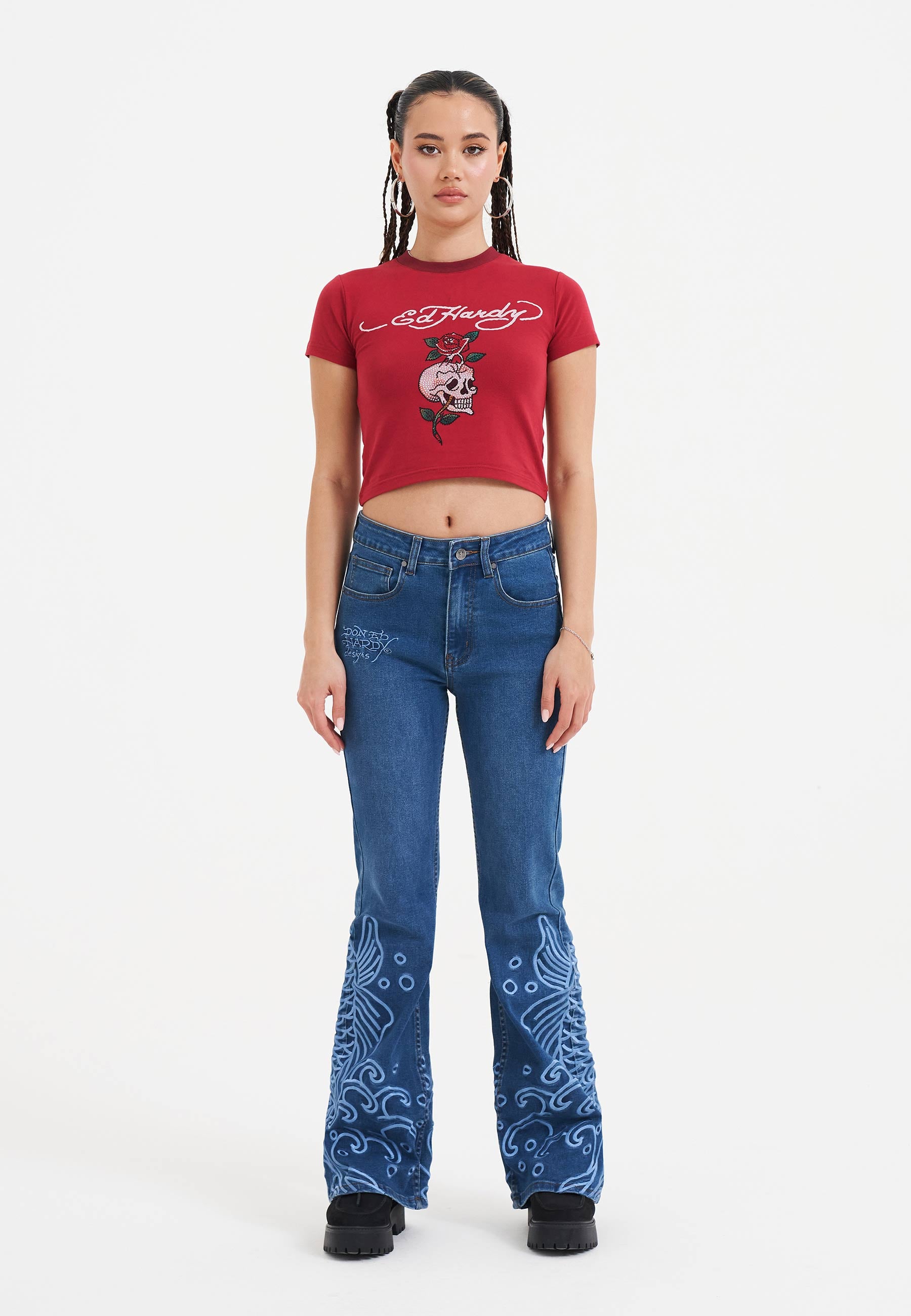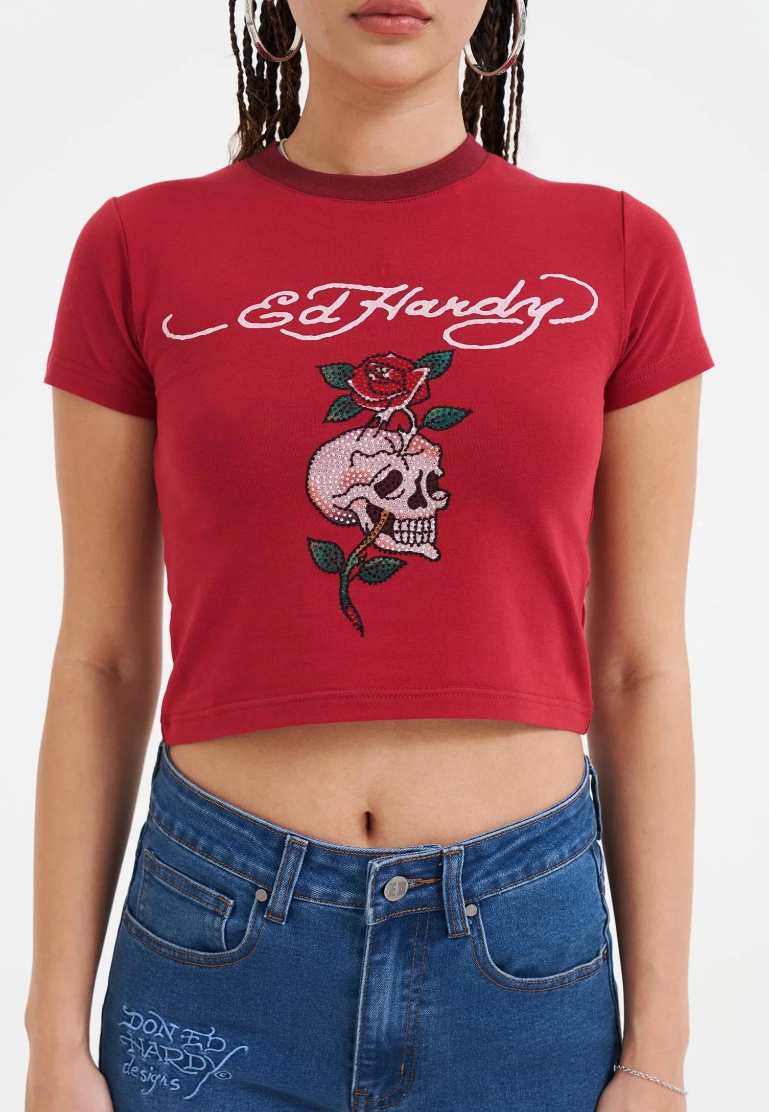 Womens Skull Rose Diamante Baby T-Shirt Top - Red
