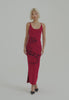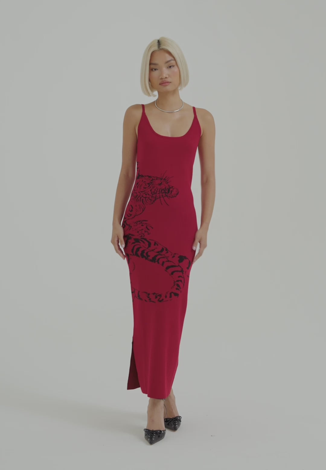 In a striking samba red, this tight-fit maxi dress features an all-over knitted tiger graphic that embodies Ed Hardy's bold tattoo design ethos. Crafted from an ultra-fine, compact knit, it offers adjustable spaghetti straps for a custom fit and a side split for added movement. The back neckline is finished with a metal Ed Hardy embossed tab, adding a signature touch to this standout piece.