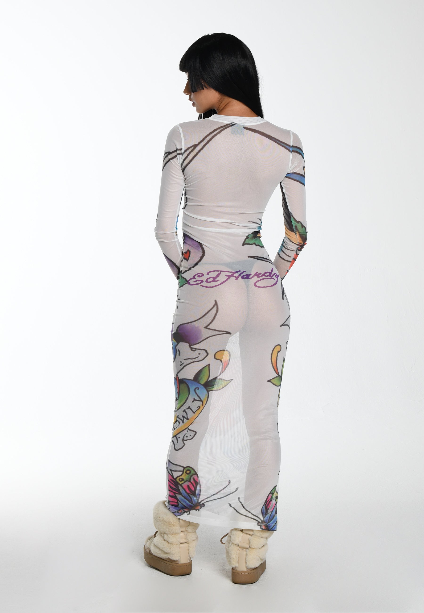 Womens Tattoo Collage Mesh Long Sleeve Dress - White