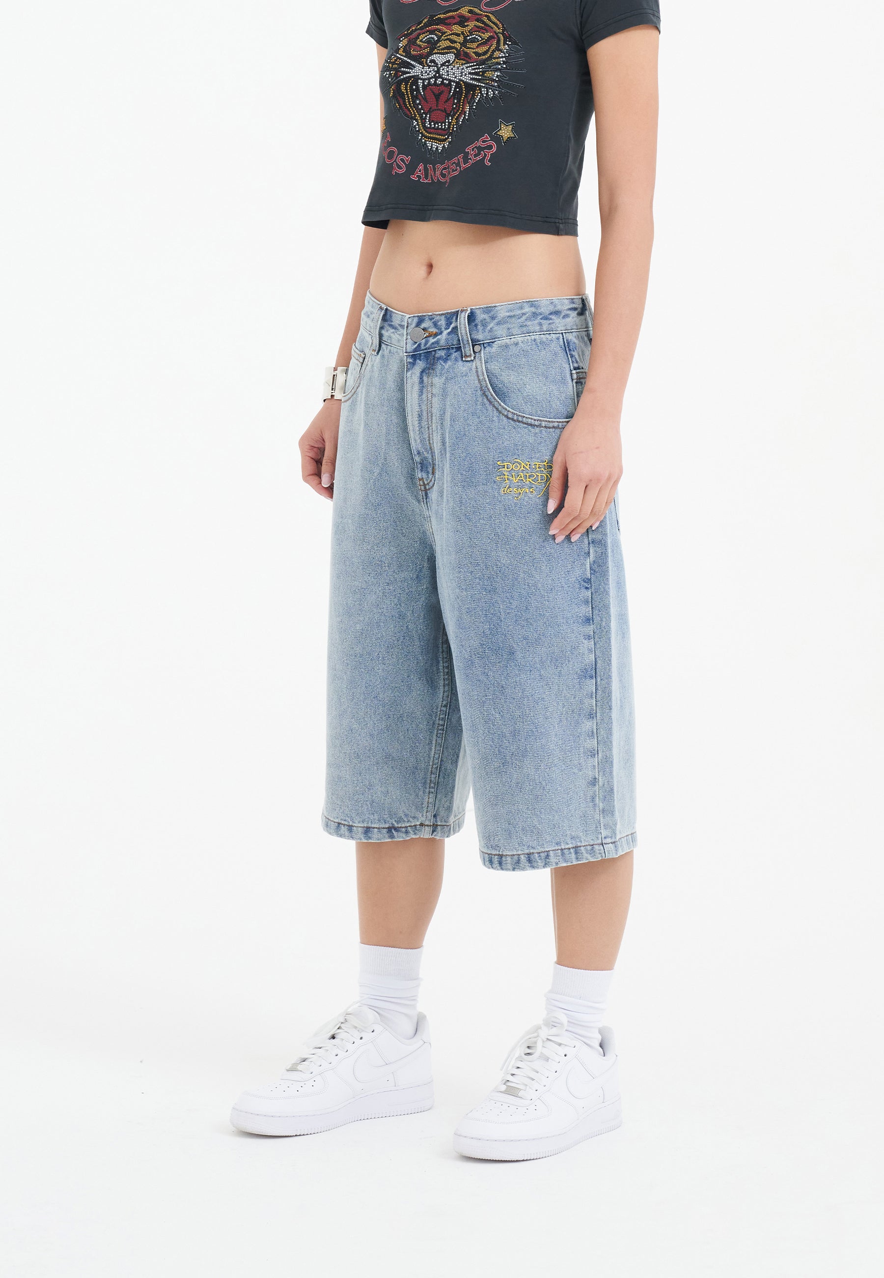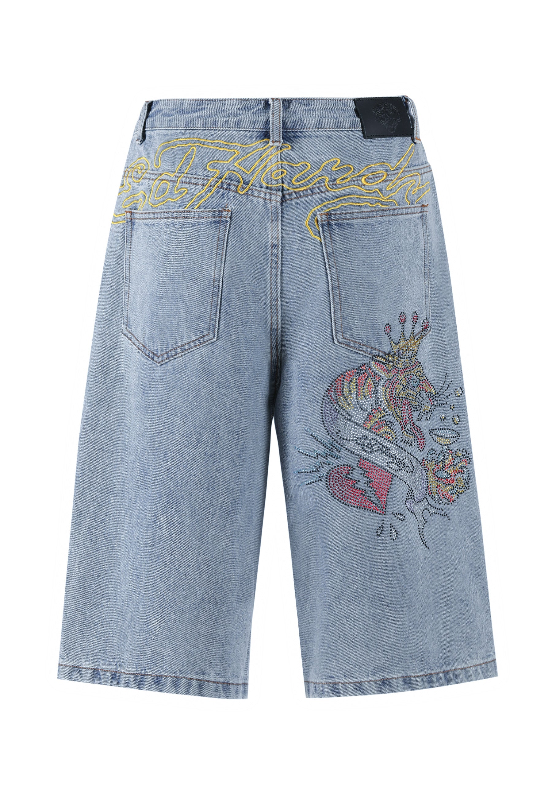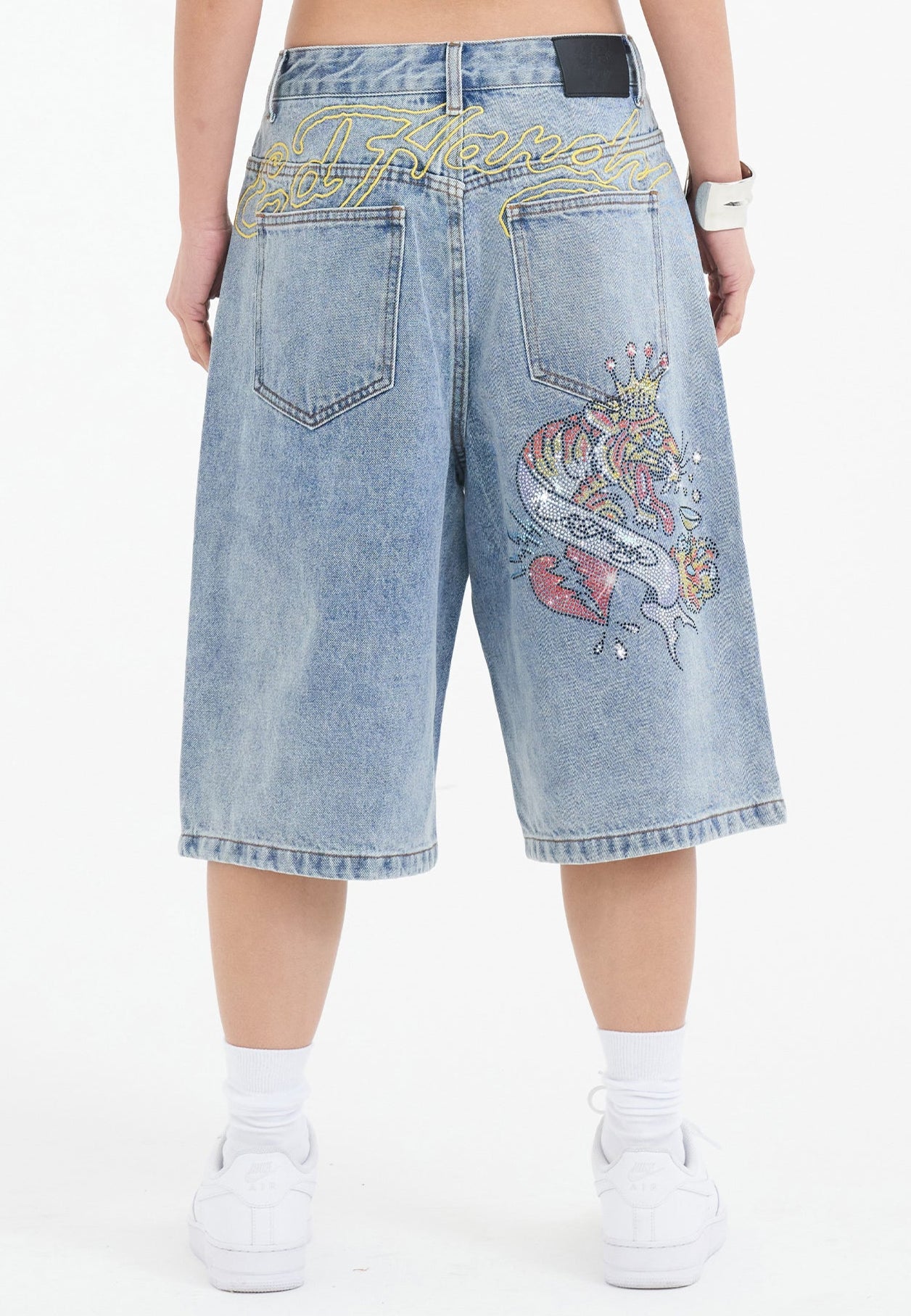 Womens Tiger King Diamante Denim Jorts Shorts - Bleach