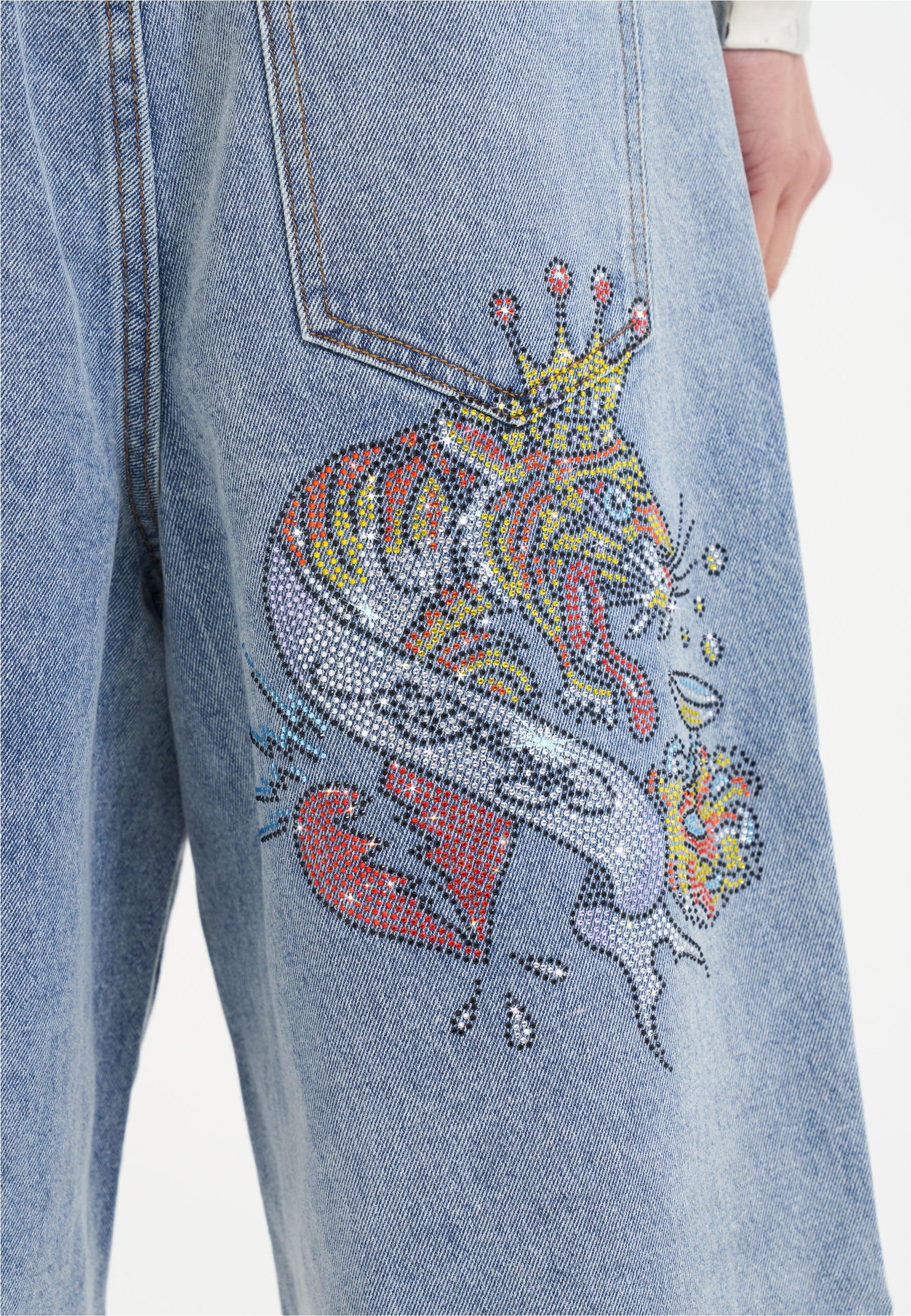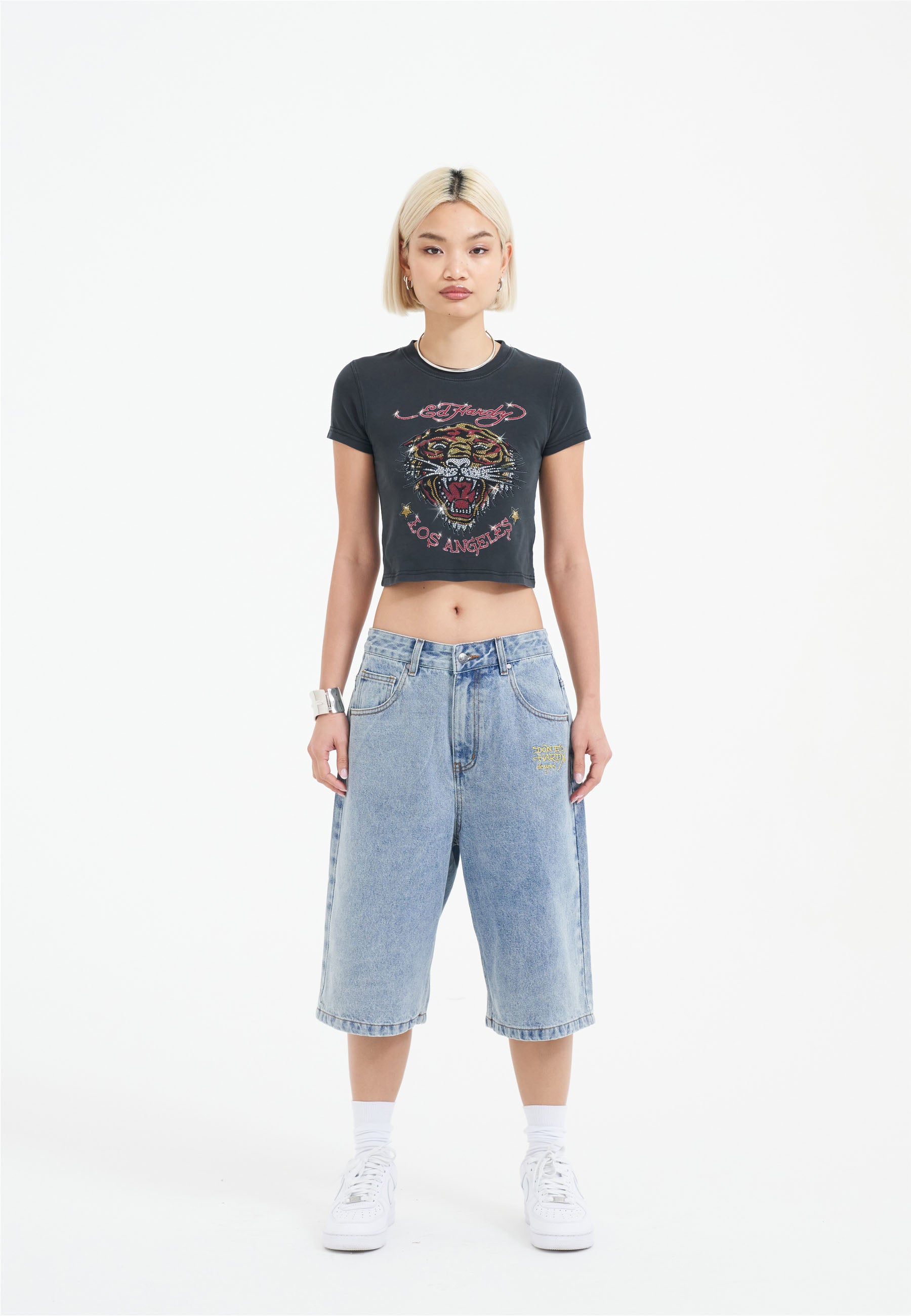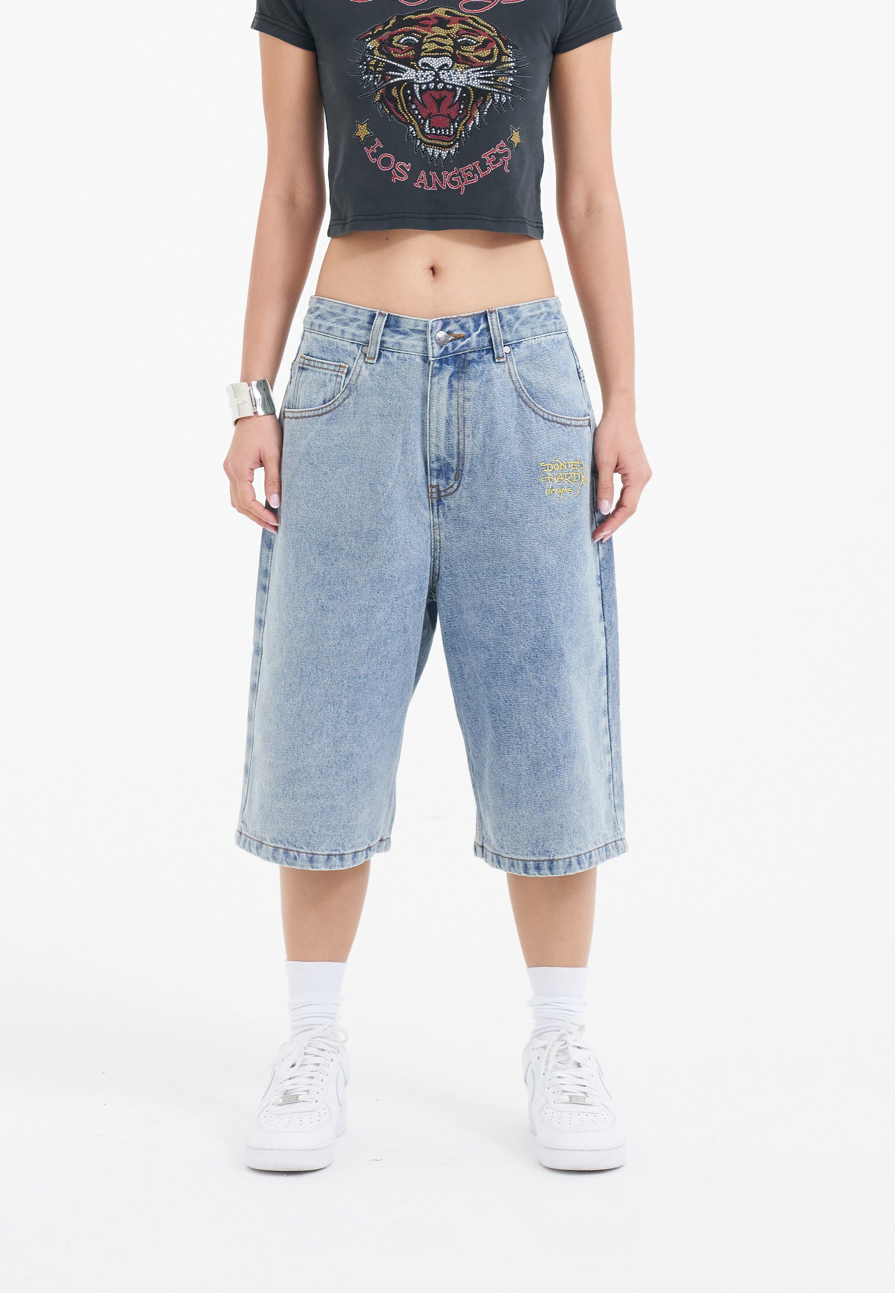 Womens Tiger King Diamante Denim Jorts Shorts - Bleach