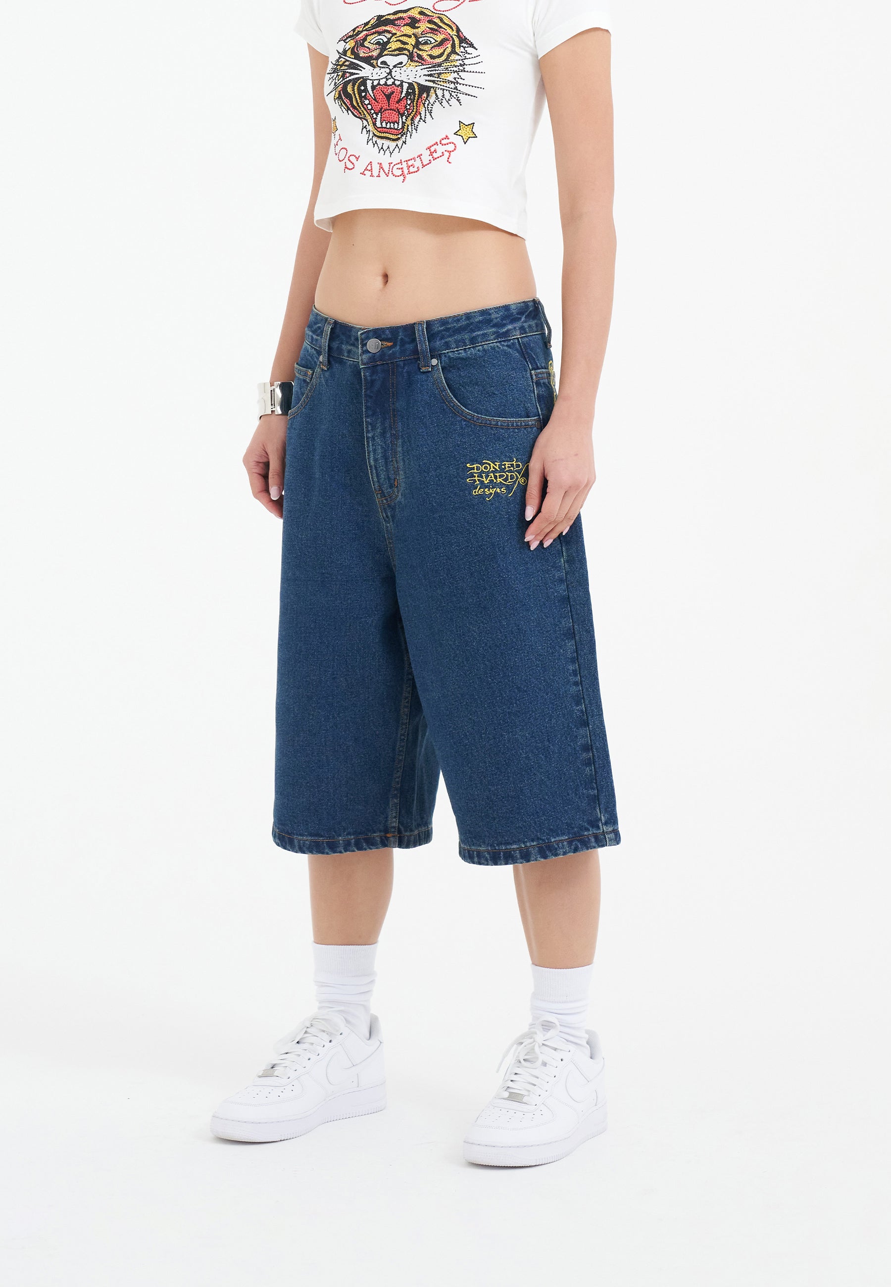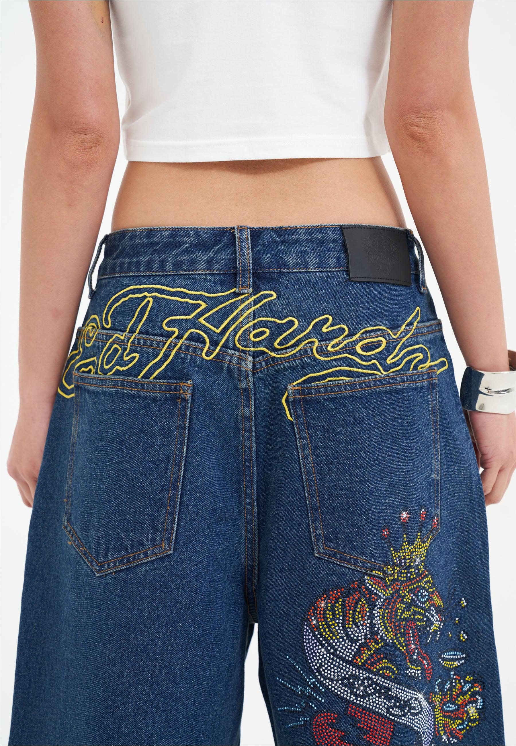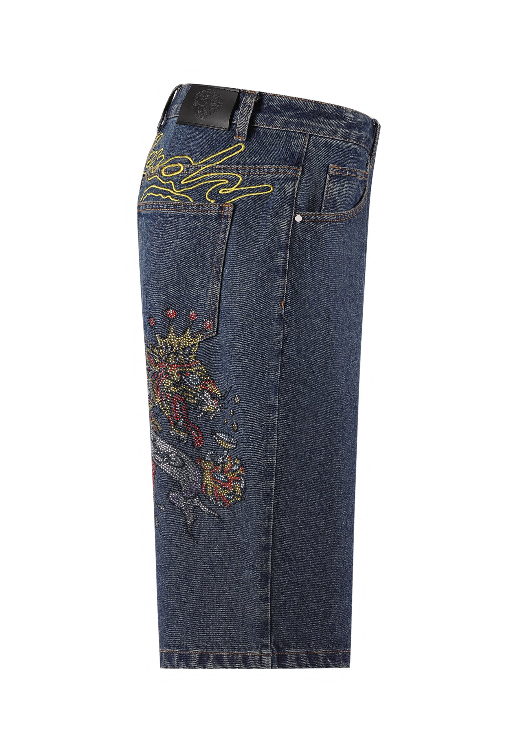 Womens Tiger King Diamante Denim Jorts Shorts - Indigo