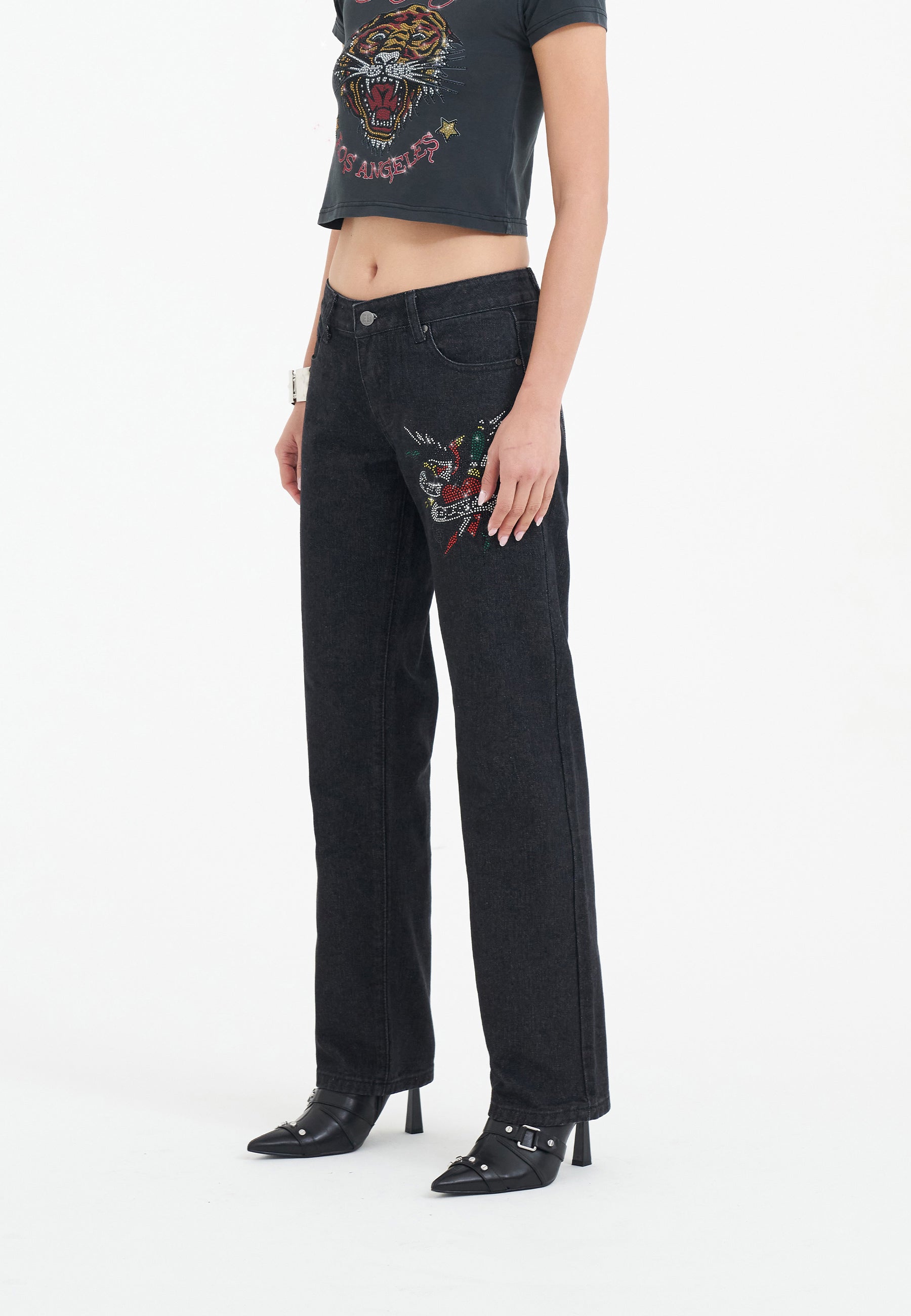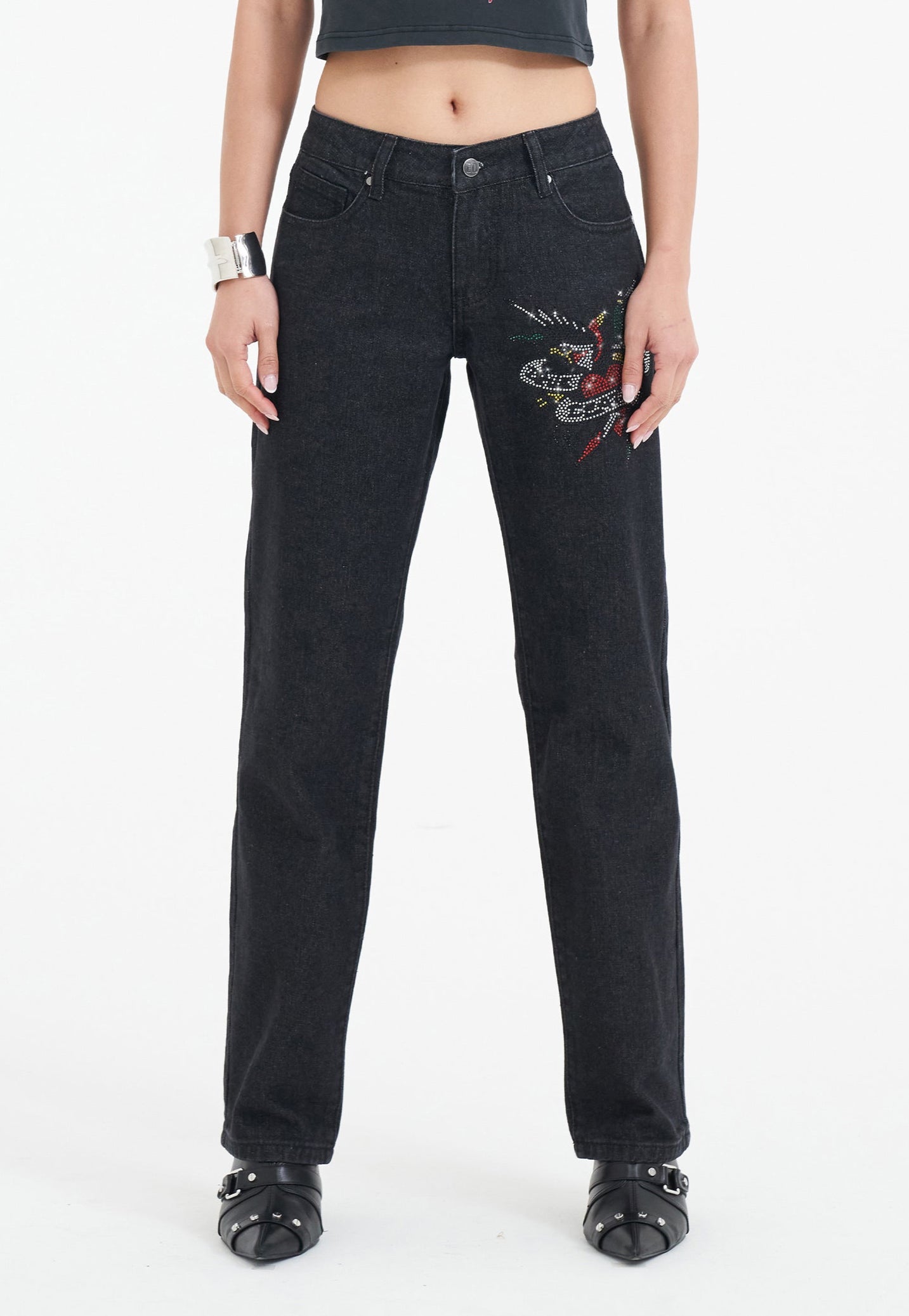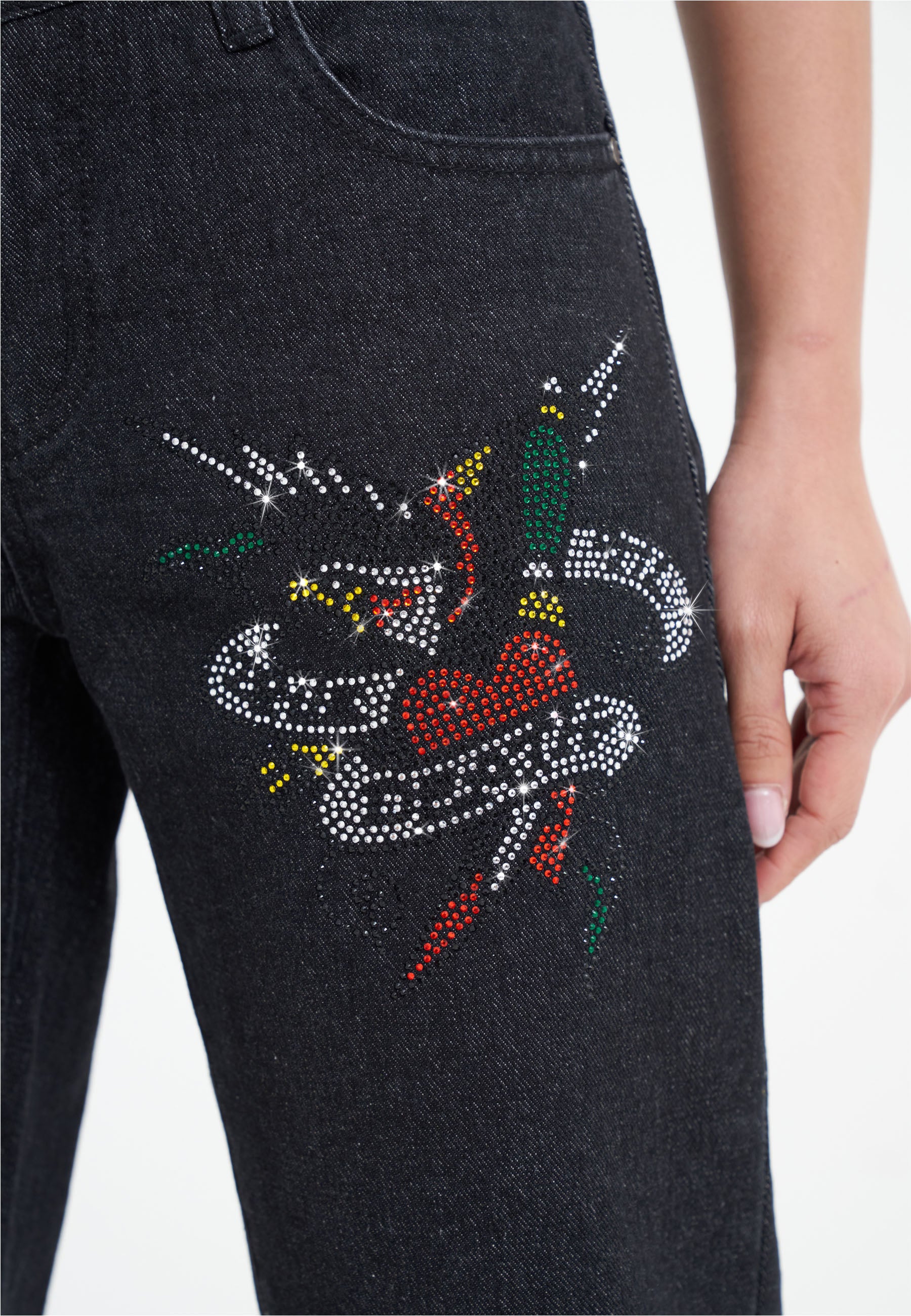 Womens True Death Diamante Straight Denim Trousers Jeans - Black