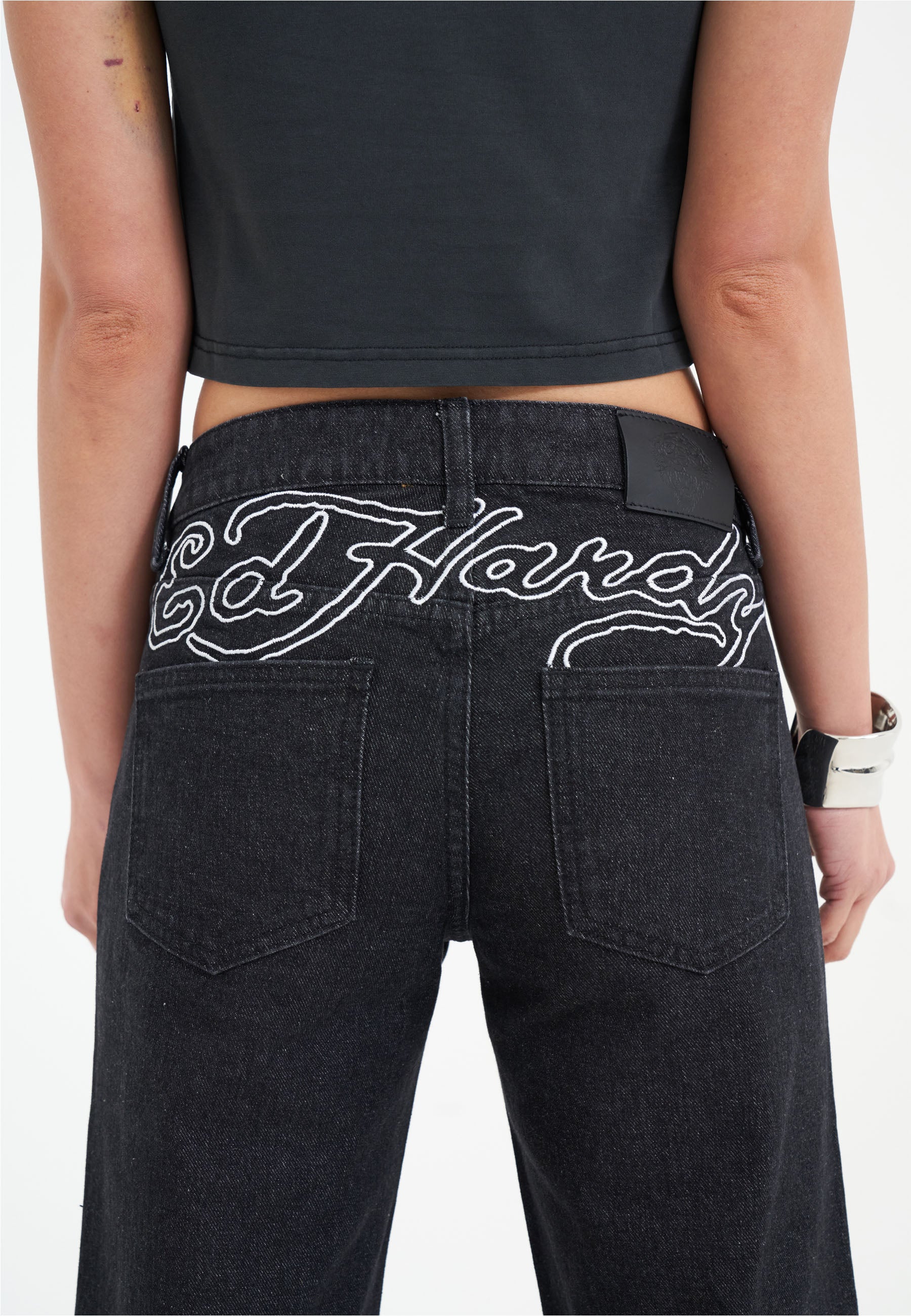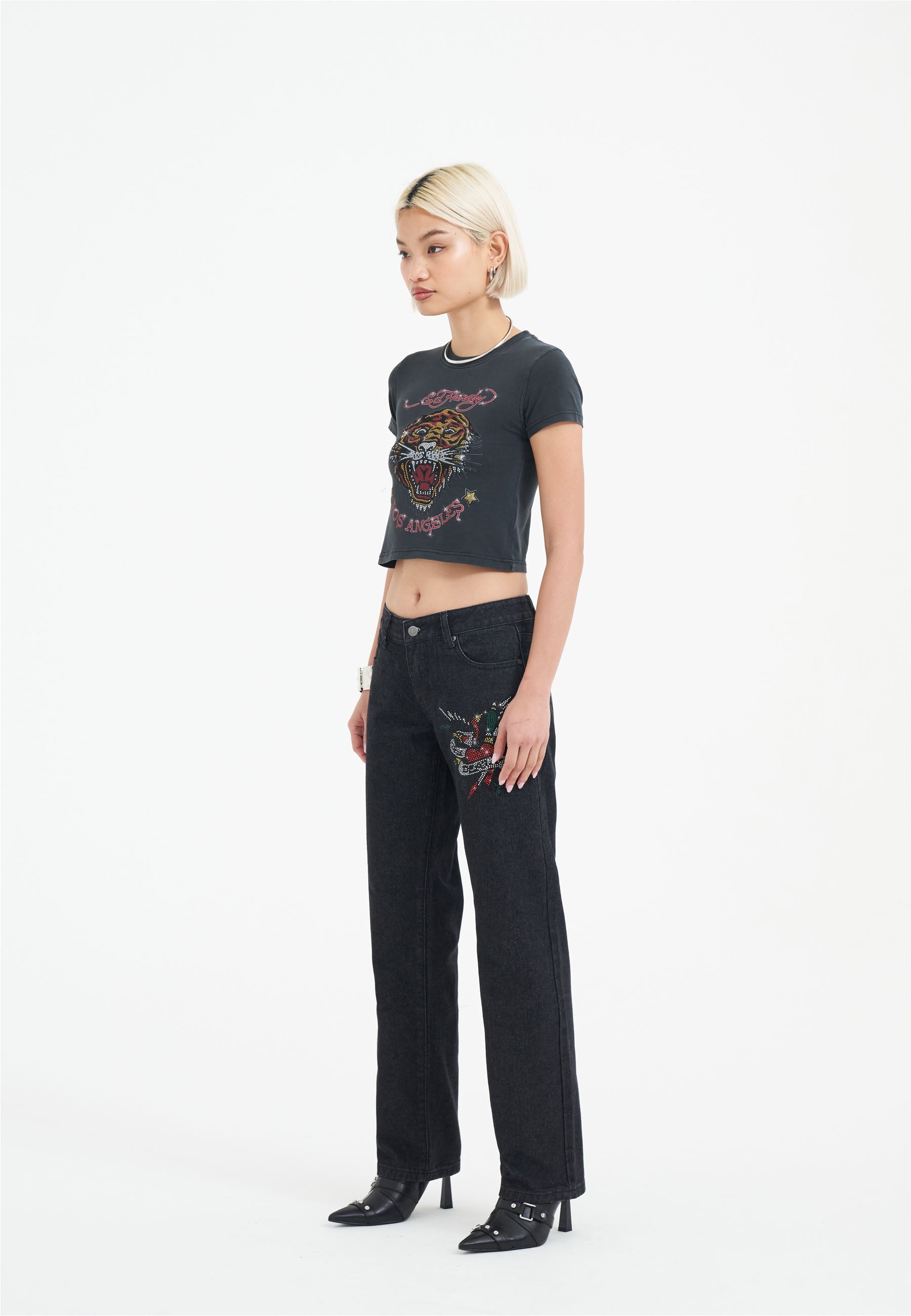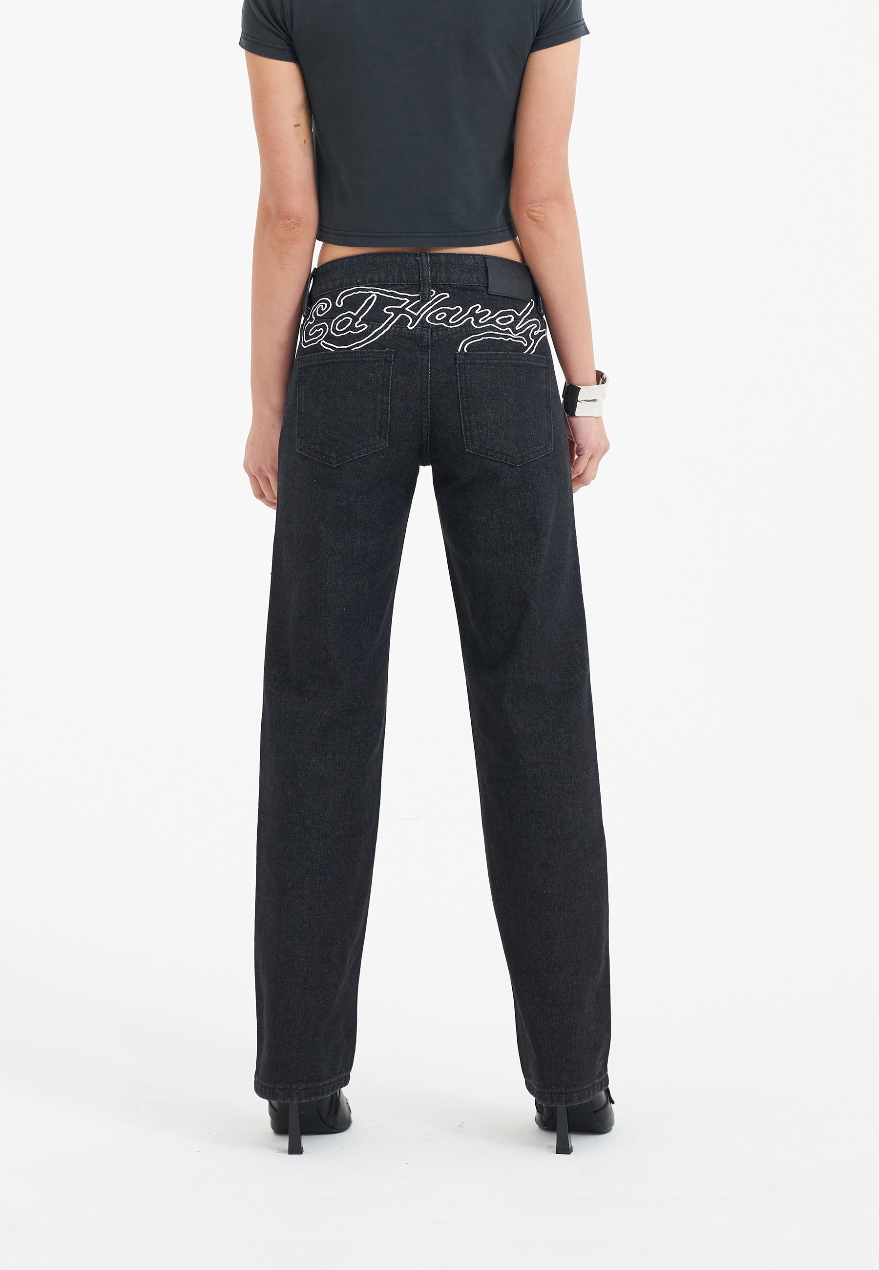 Womens True Death Diamante Straight Denim Trousers Jeans - Black
