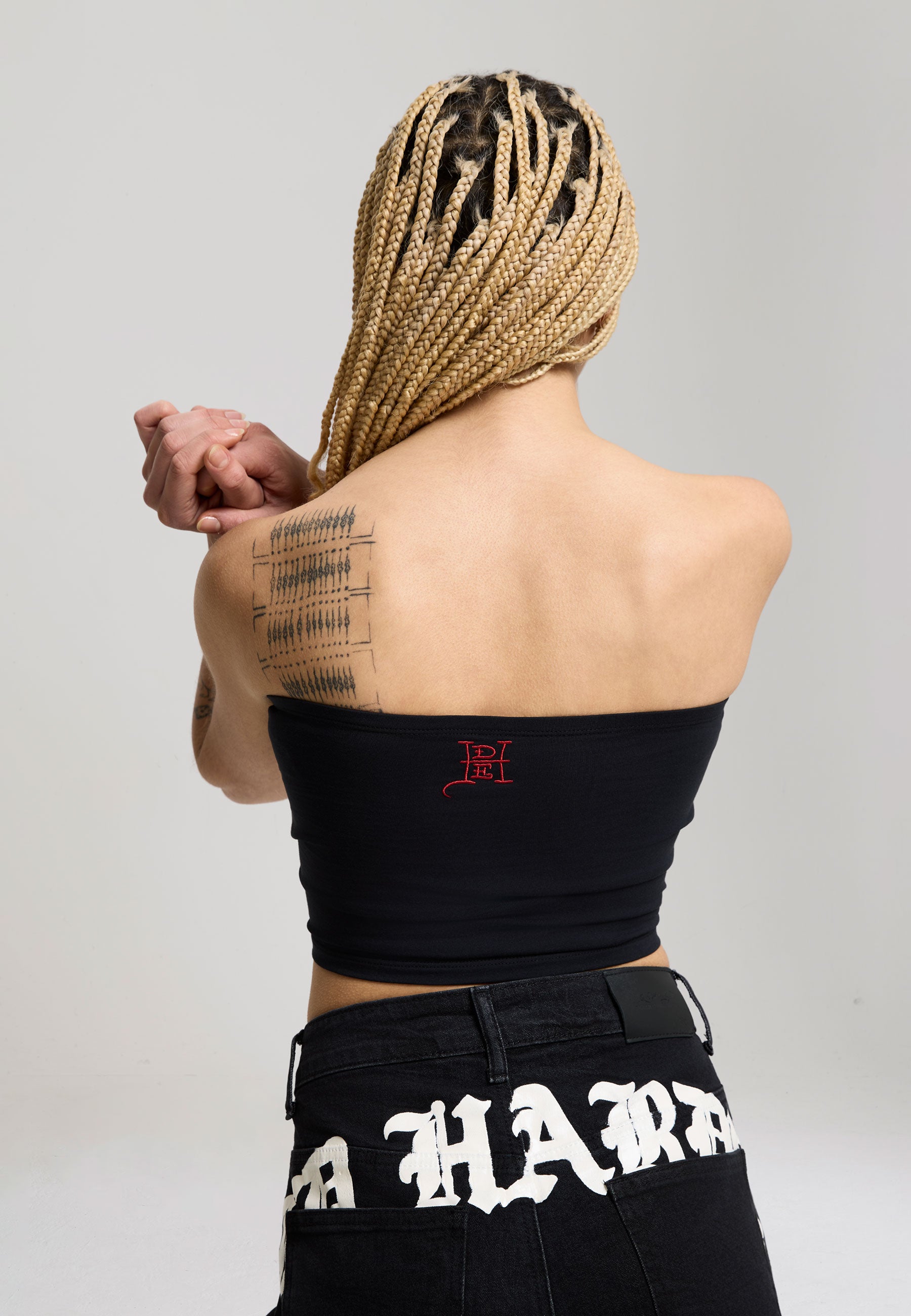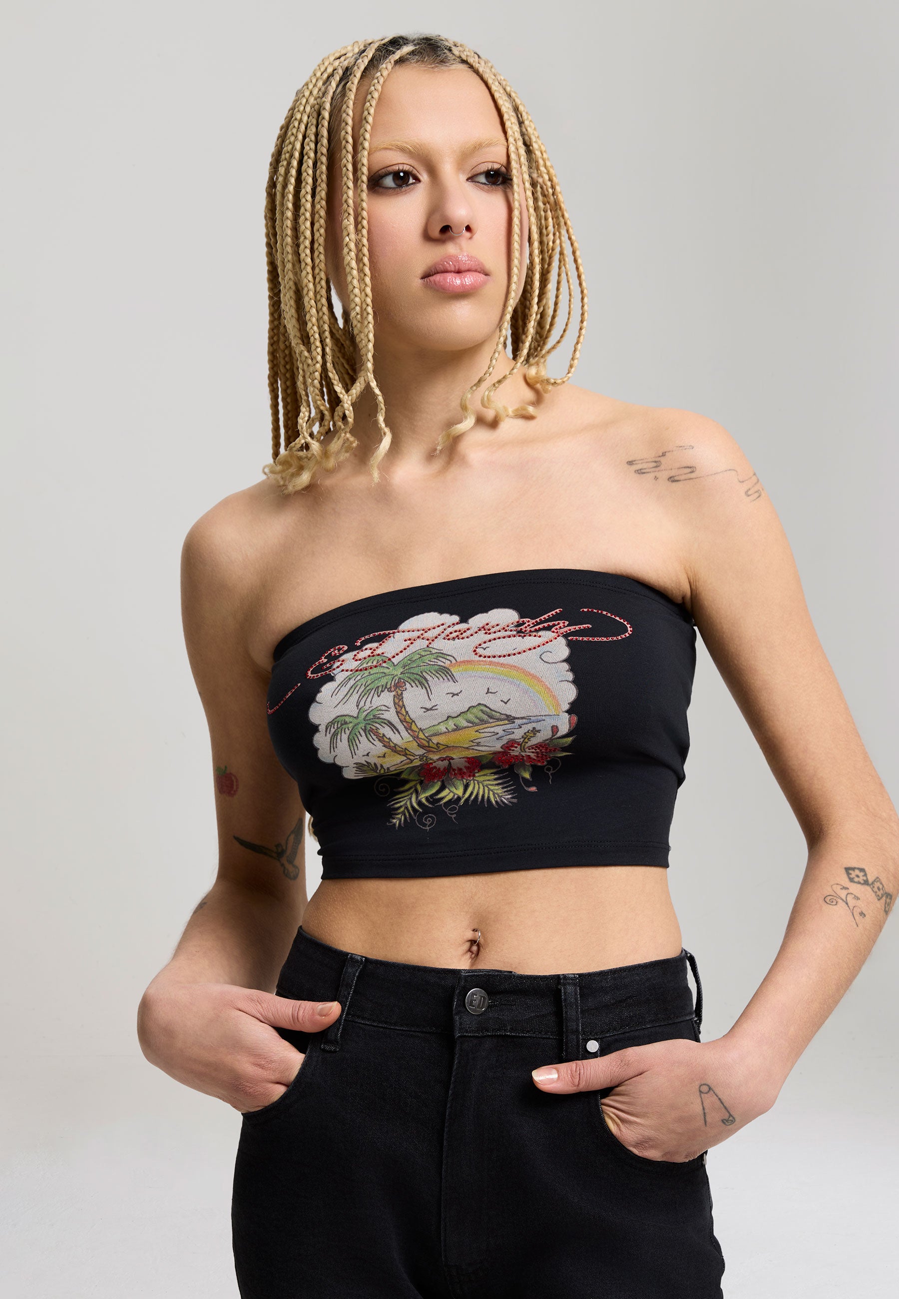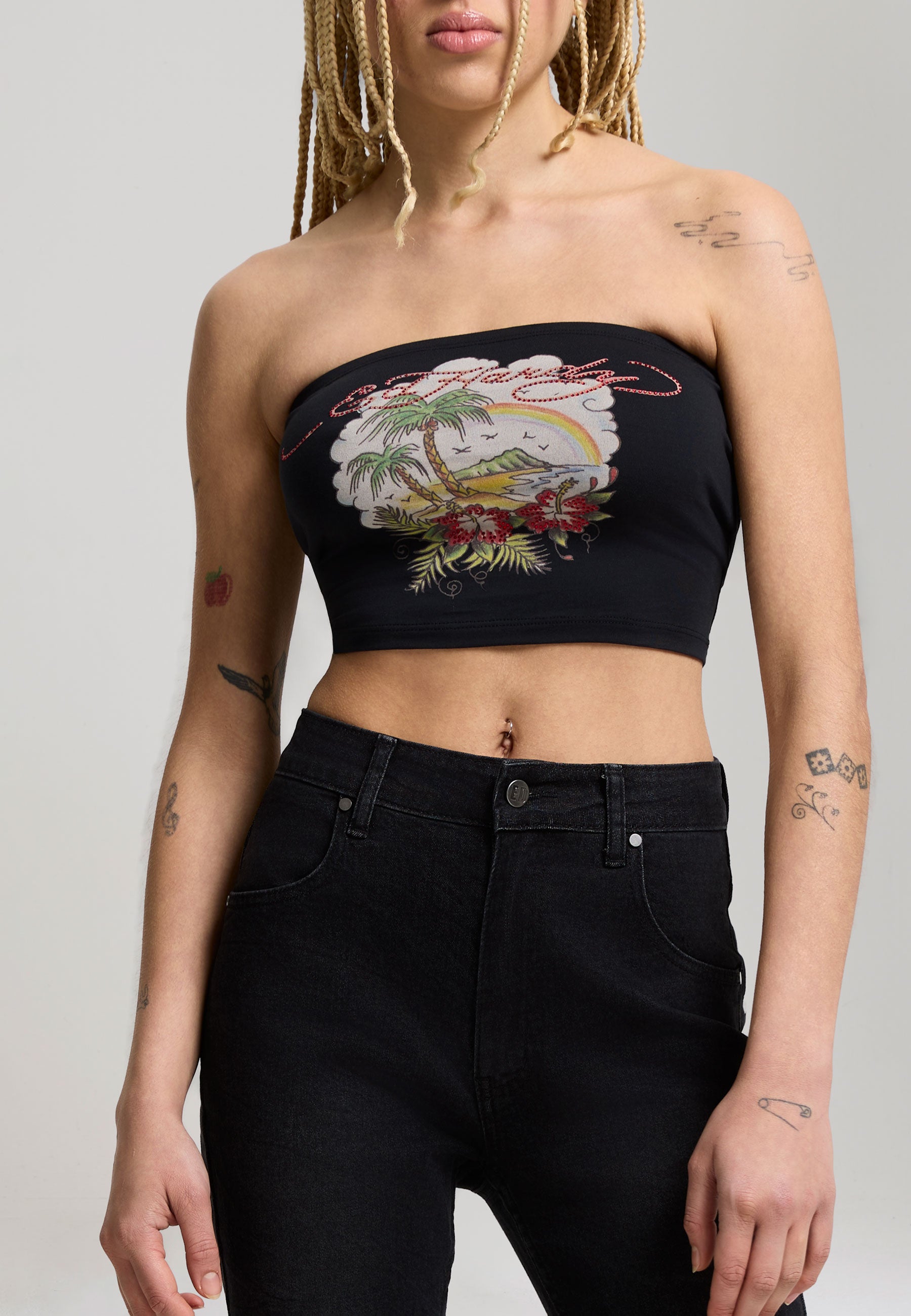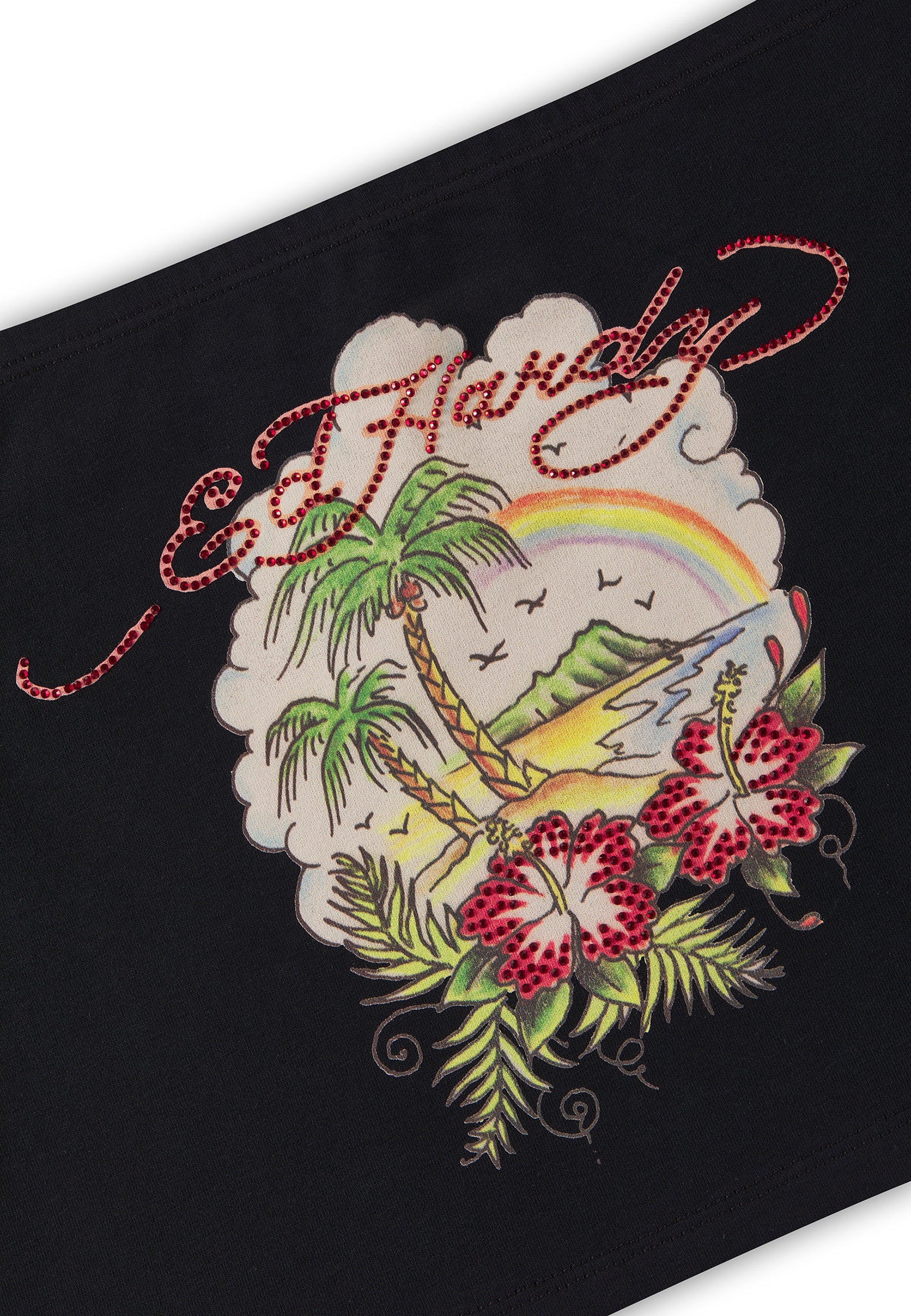 FITTED BANDEAU NO WASH 95% COTTON 5% ELASTANE JERSEY 180GSM ED HARDY SIGNATURE IN HOT FIX CRYSTAL DIAMANTE TO FRONT TATTOO GRAPHIC PRINT TO FRONT WITH HOT FIX CRYSTAL DIAMANTE PLACEMENT E.D.H LOGO EMBROIDERY TO BACK