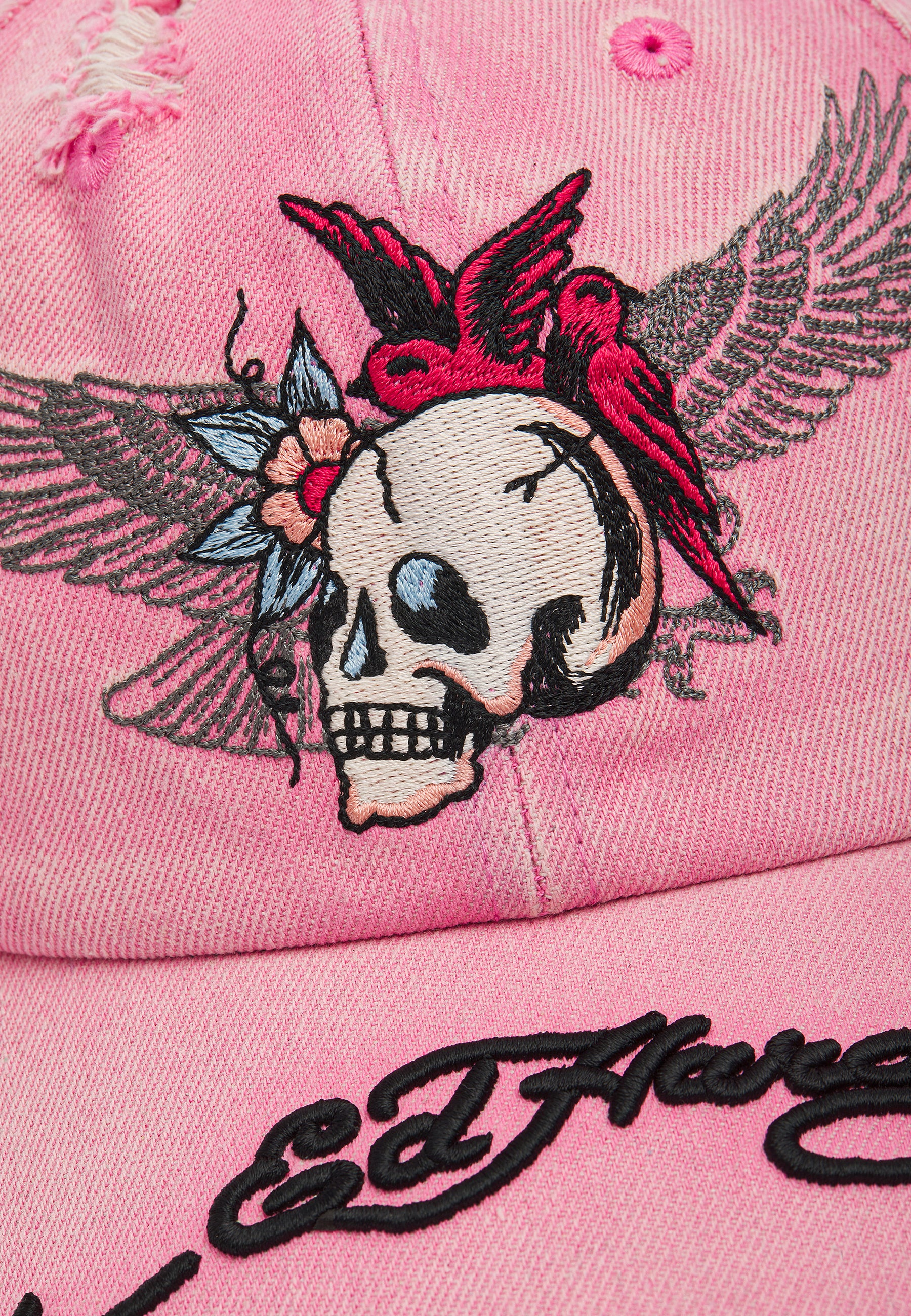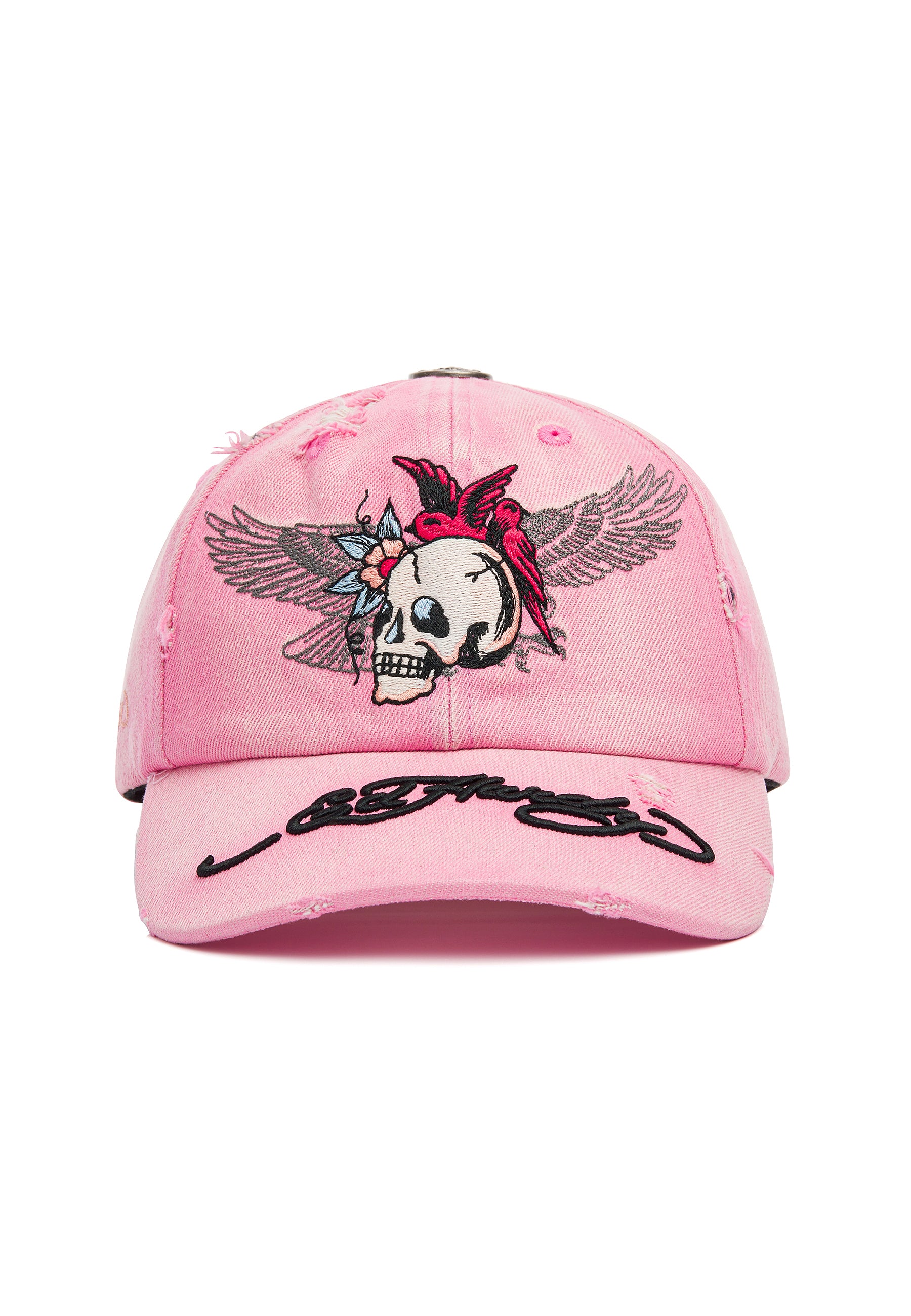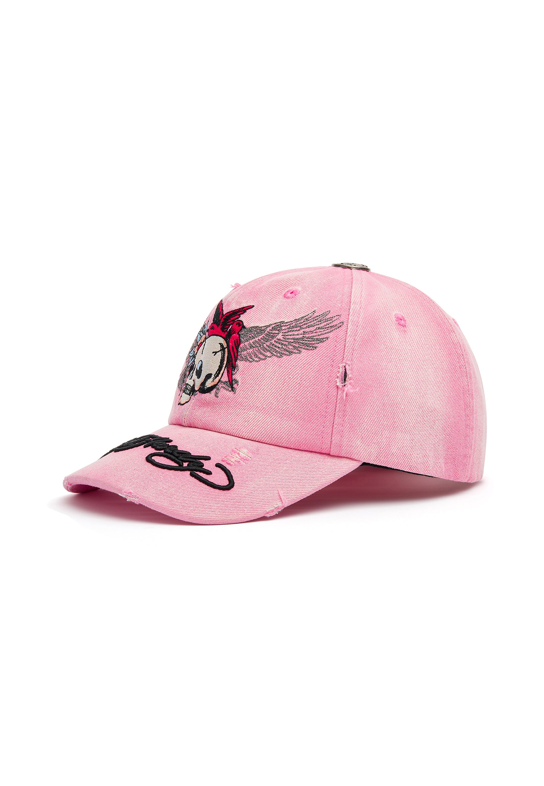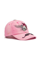 Unisex Flying Skull Distressed Washed 6 Panel Cap - Pink