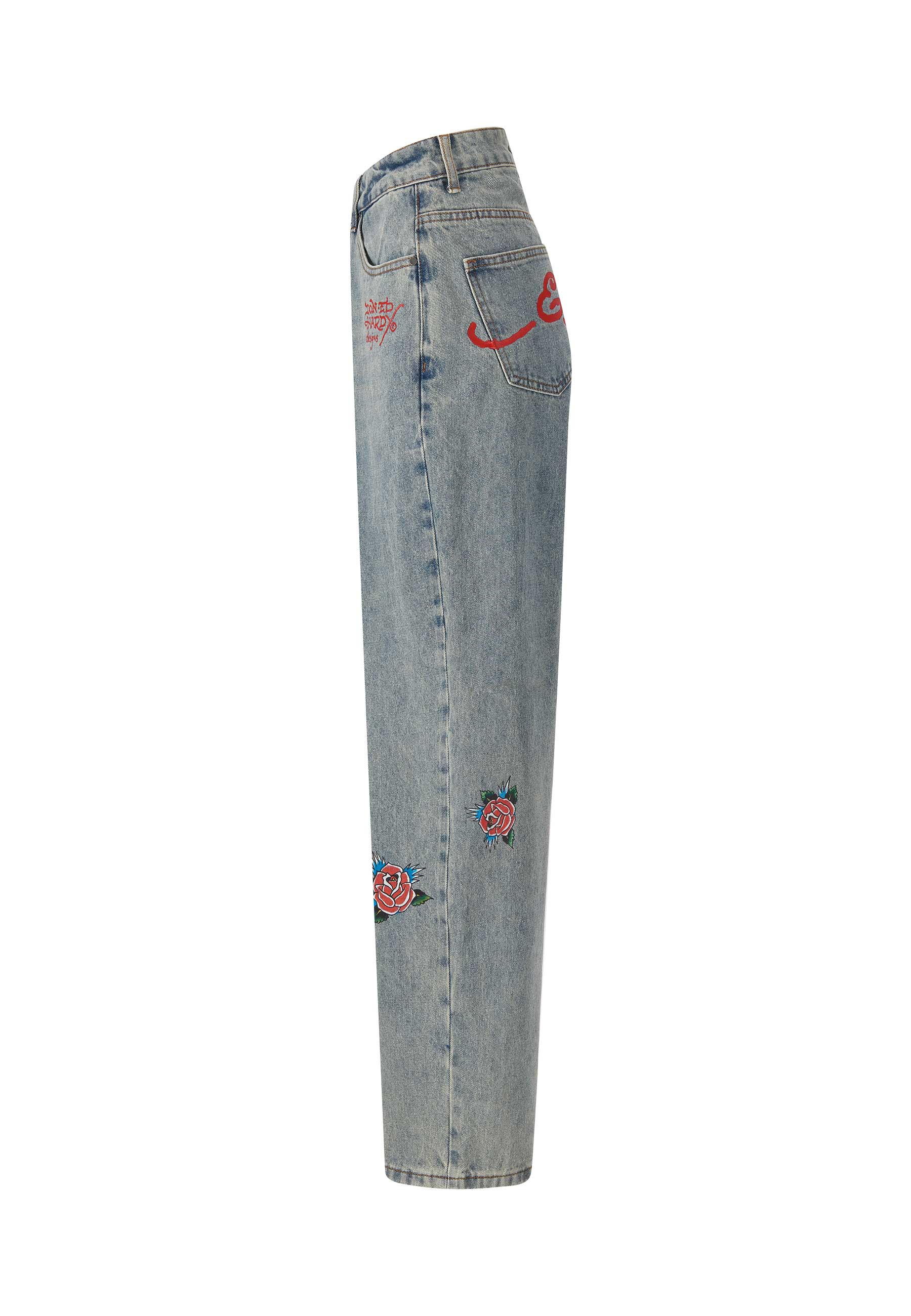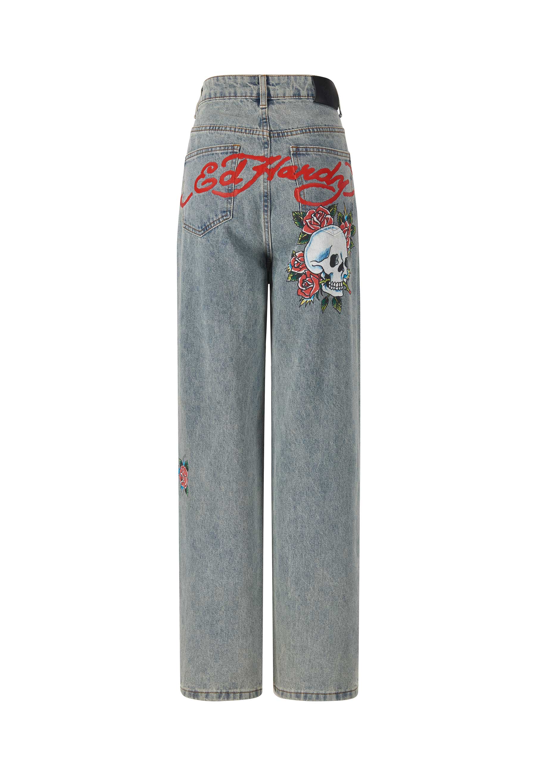 The Women's Blooming Death Relaxed Jeans reinterpret Ed's original drawings into timeless designs. The Relaxed-Fit leg showcases intricate full-colour embroidery, featuring Ed Hardy's iconic Blooming Skull and original Rose graphics from his sketchbook.