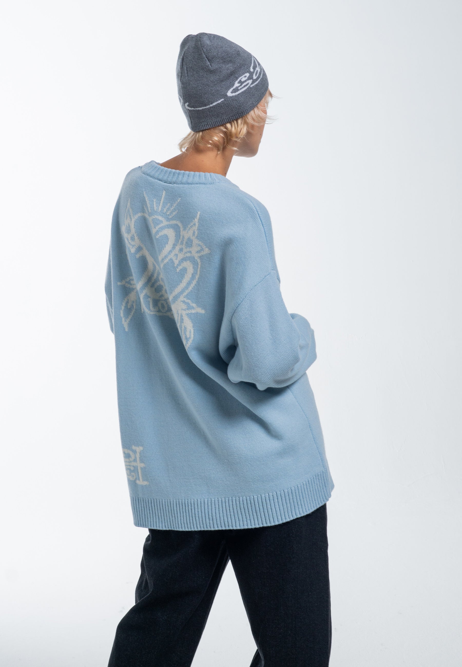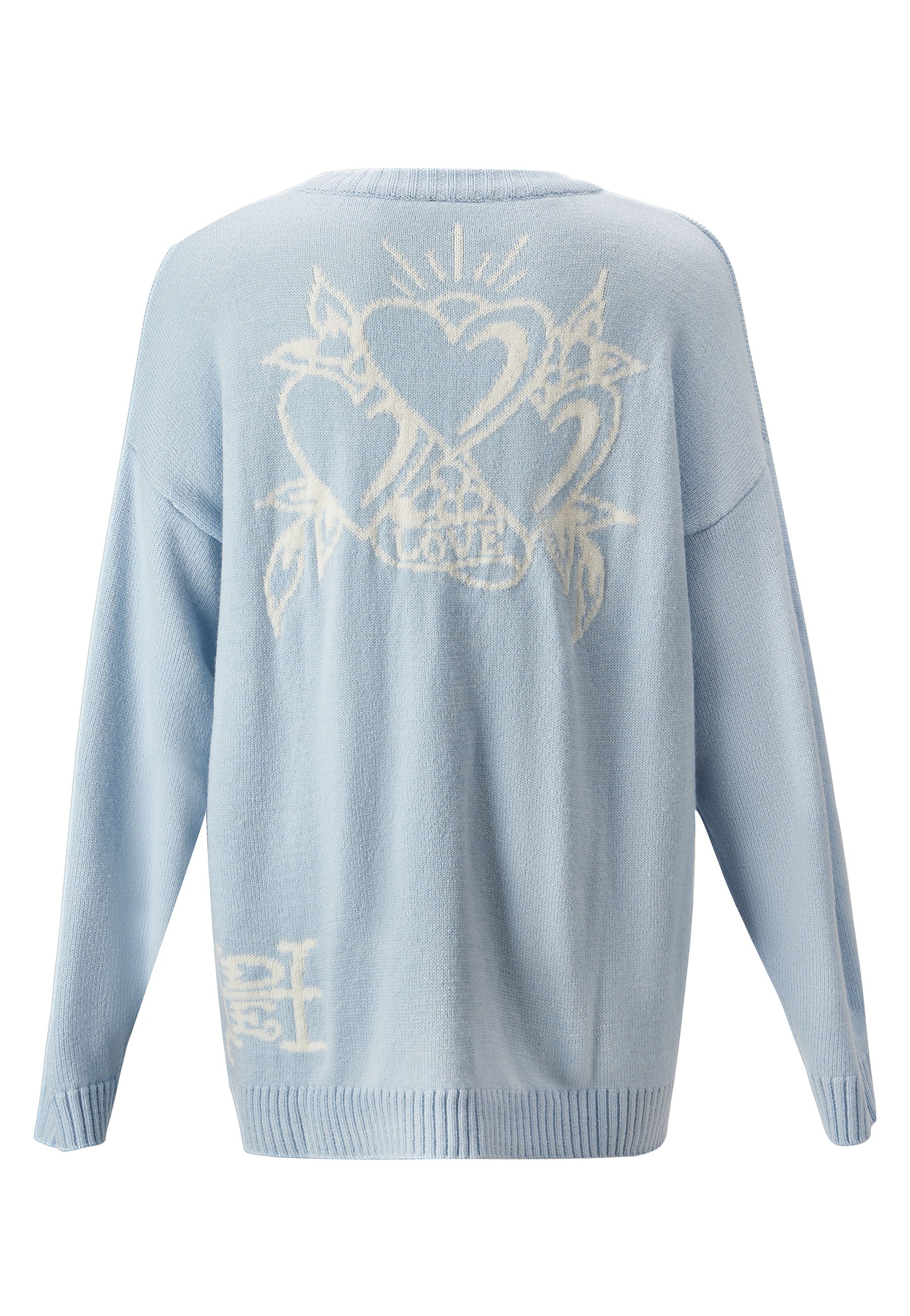This precision-crafted piece in pastel blue and white jaquard graphic placements, presents an exciting new palette for AW23, core to the evolution of the new collection and Ed's vision for the brand.