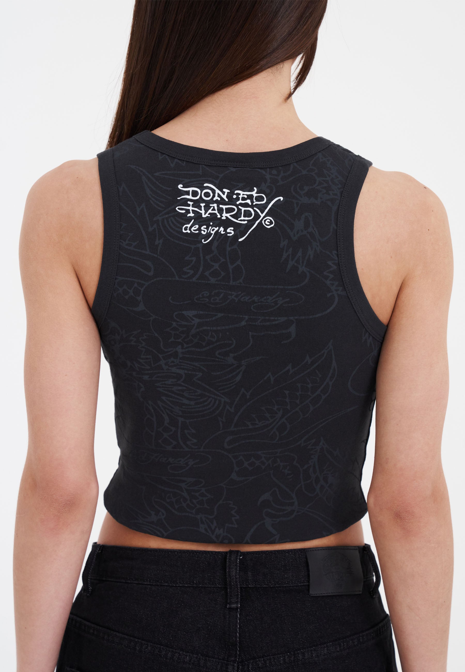A classic charcoal vest gets the Ed Hardy treatment: a tattoo-inspired “Love Dies Hard” skull and bleeding heart graphic, light grey shadow print all over, and the Don’s signature in logo in blood red across the chest and upper back.