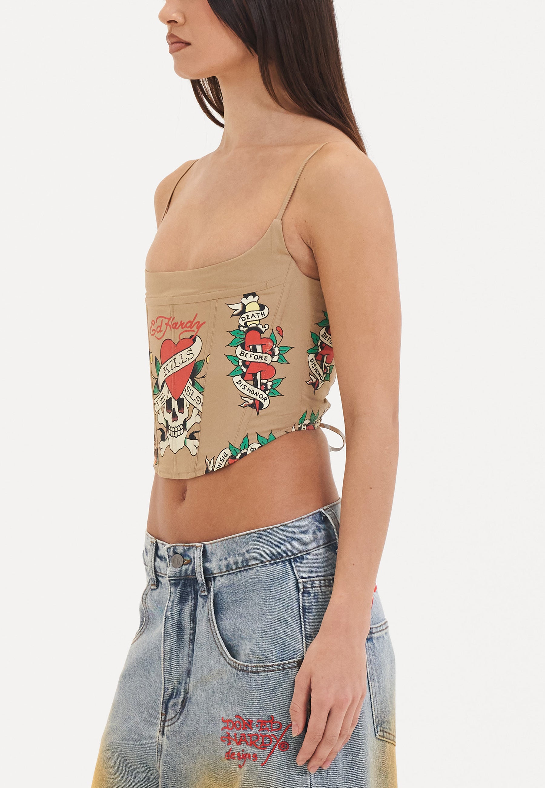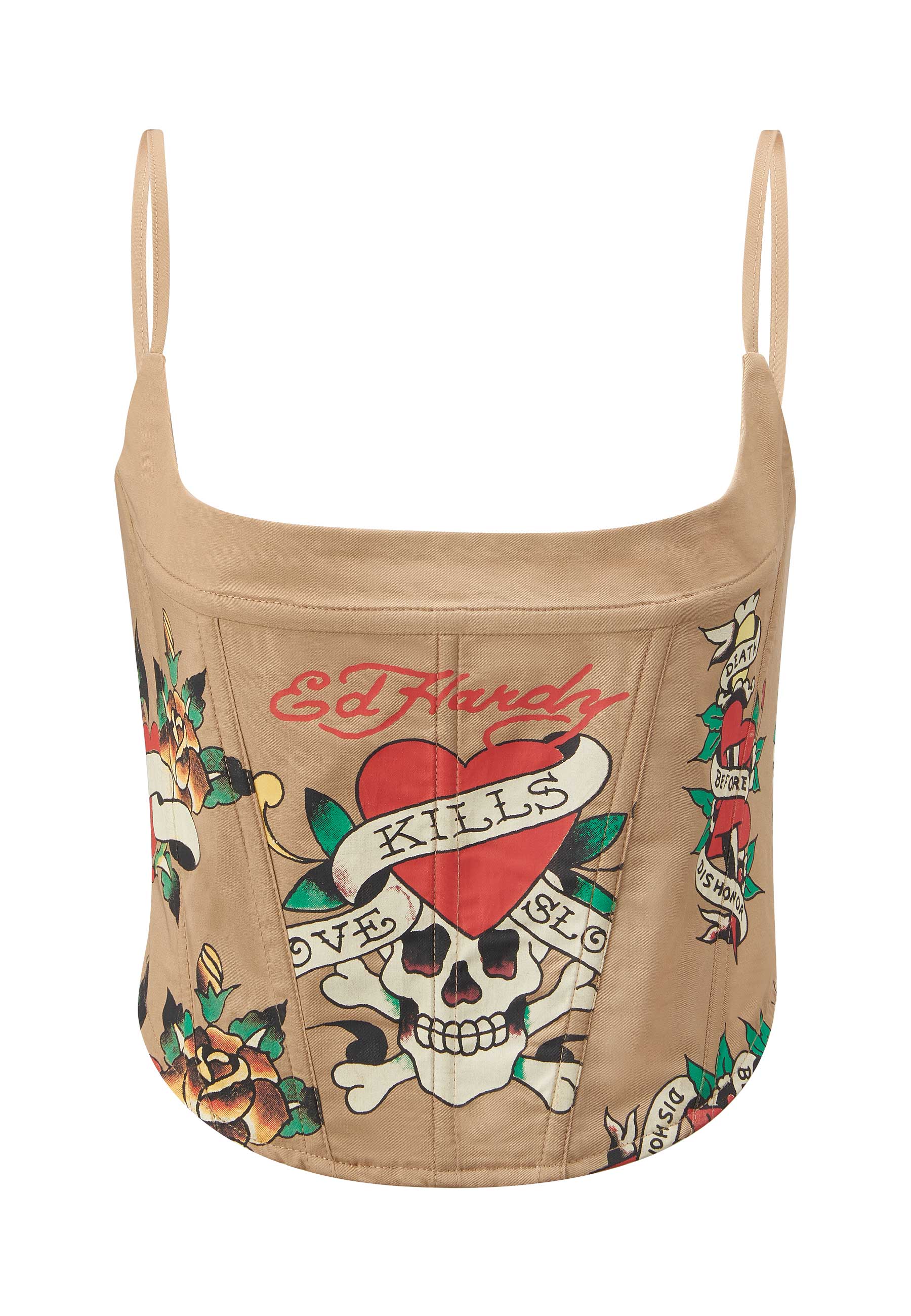 The Love Kills Corset top features layers of Ed's full-colour graphics capturing his legendary creative rebellion.