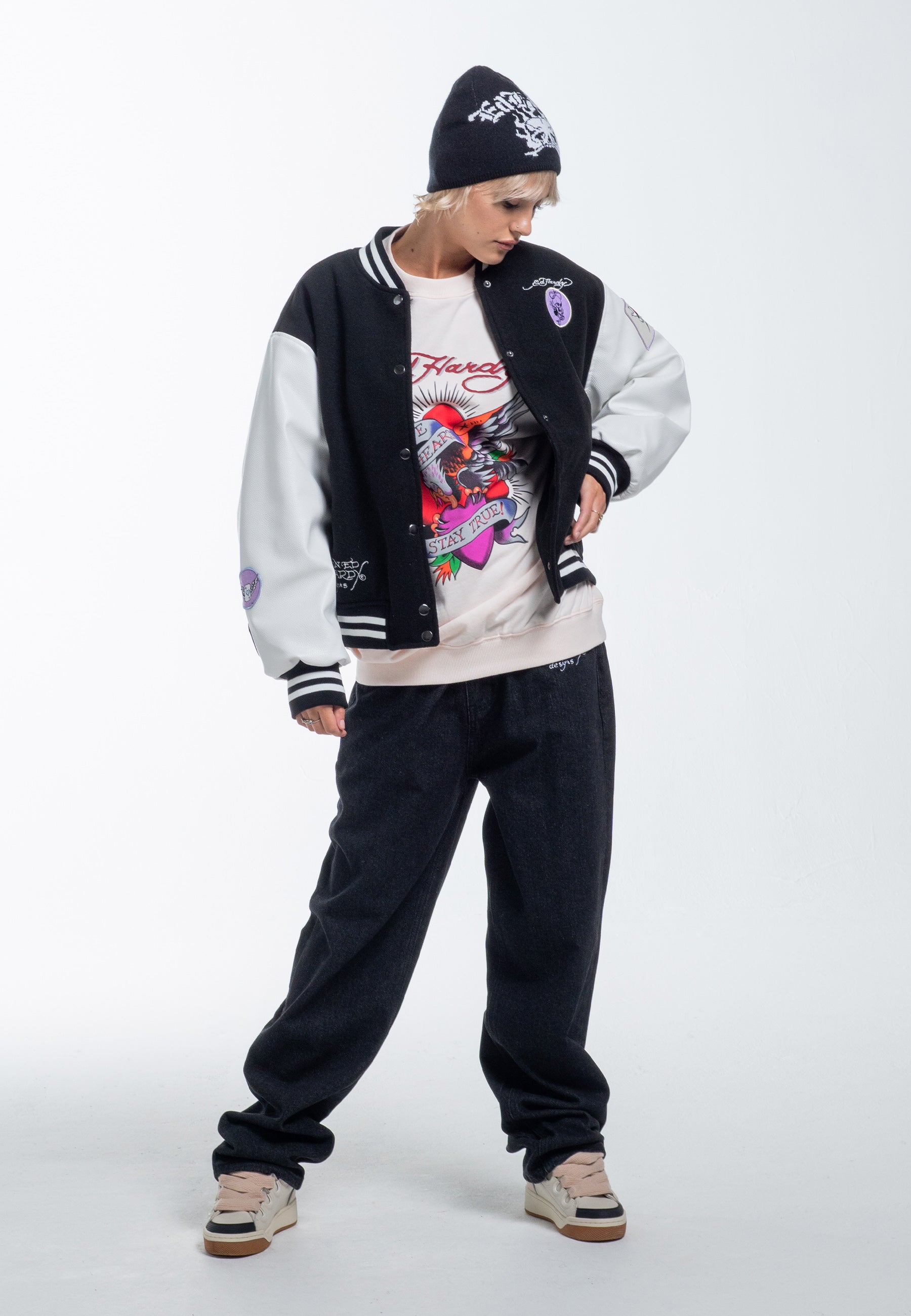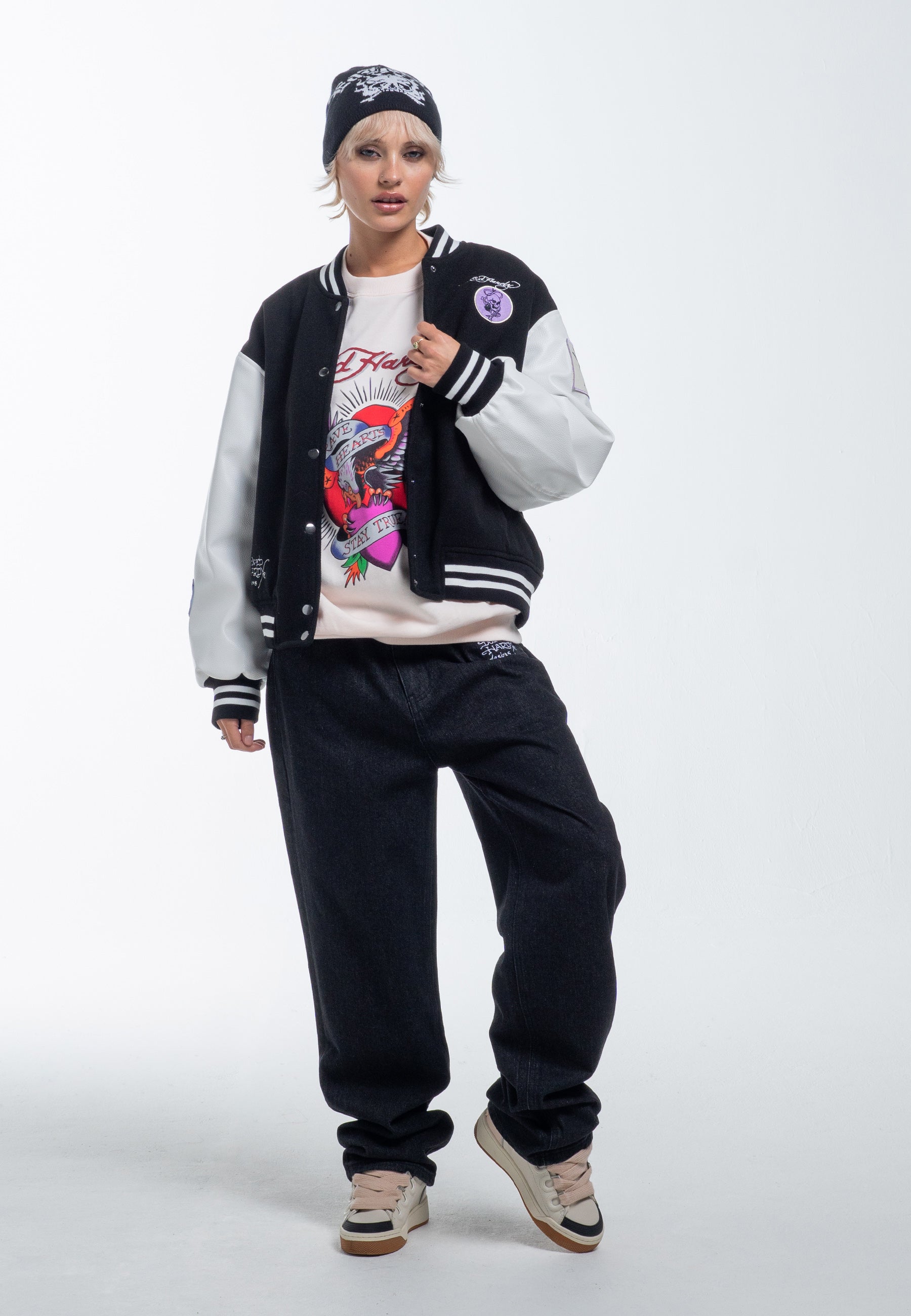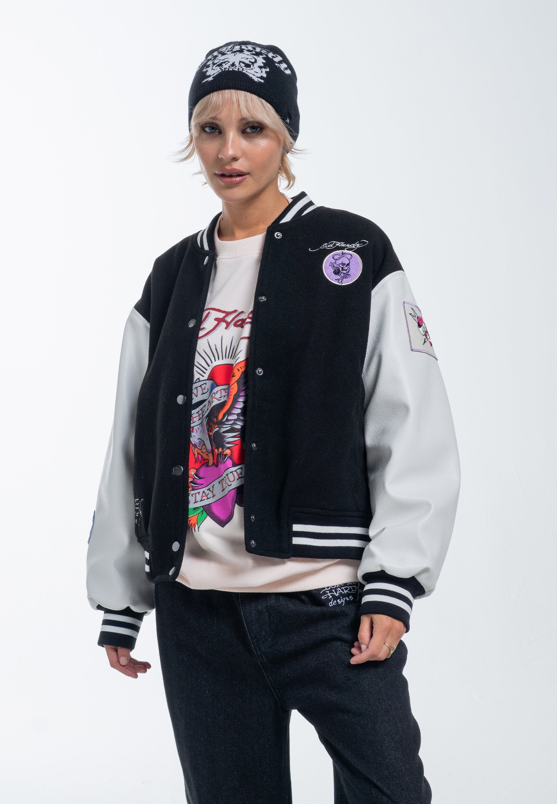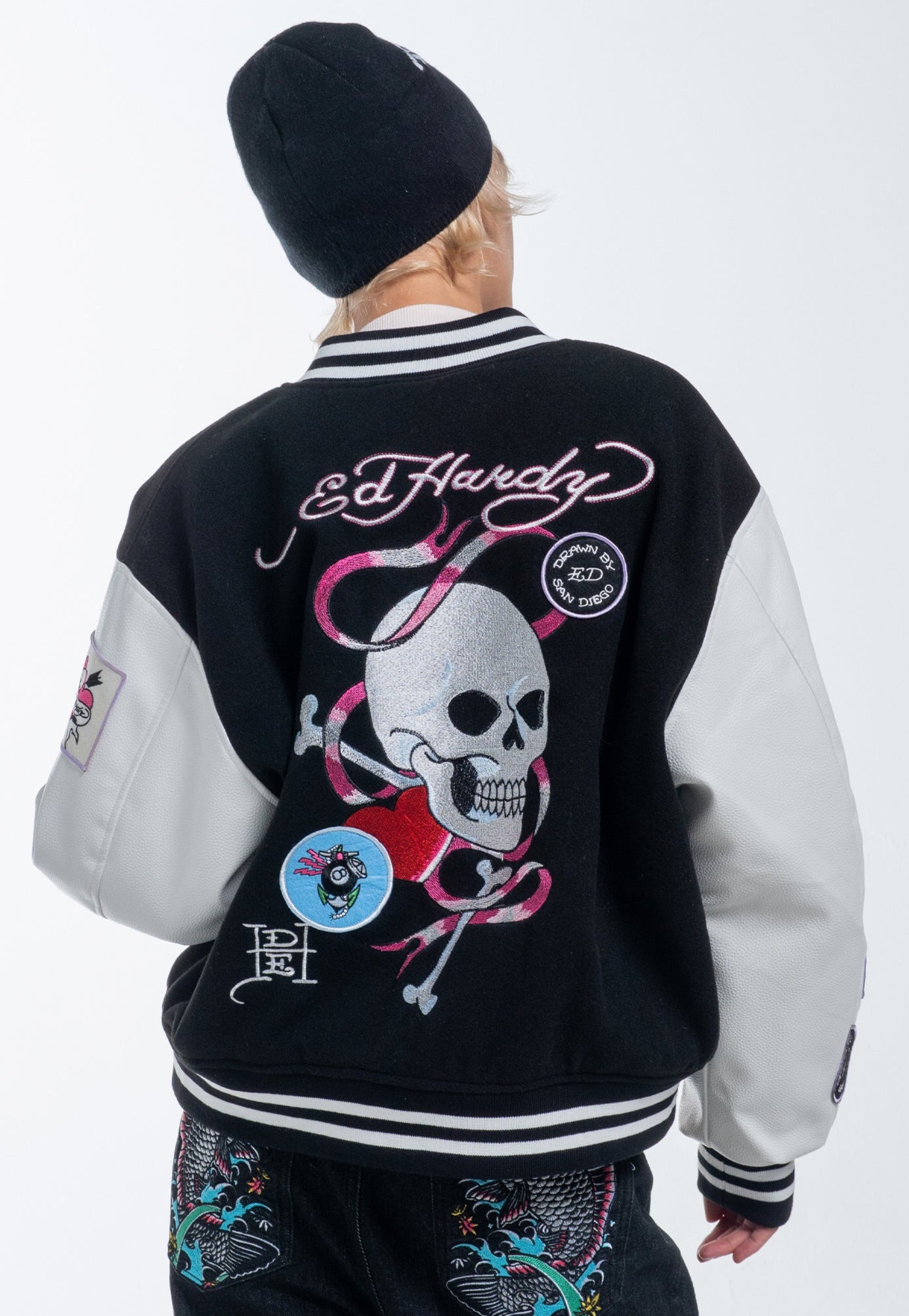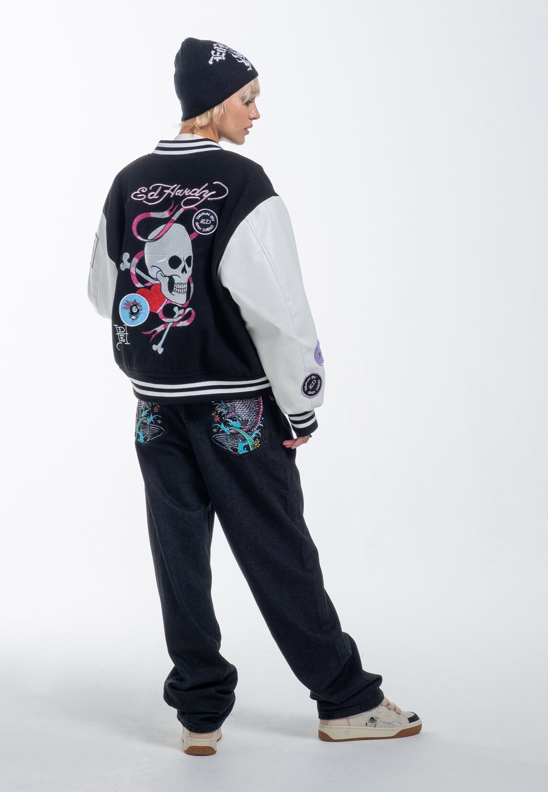 Featuring a primary embroidered design of skull and bones, it's adorned with additional appliqué badges showcasing a selection of Ed's signature designs. This jacket blends exceptional artistry with timeless style. Embrace Ed Hardy's legacy with every wear.