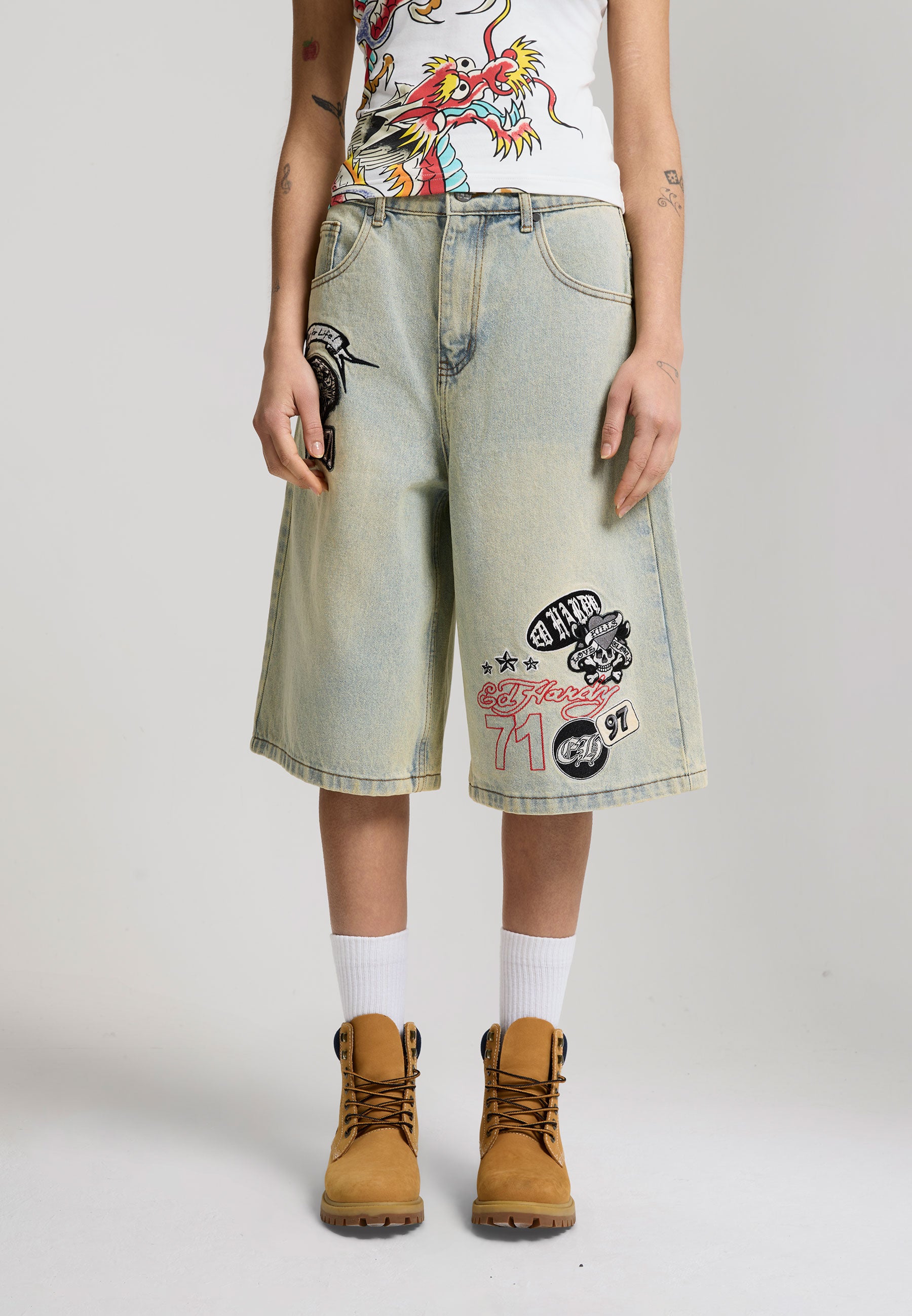 Womens Multi Badge Tattoo Denim Relaxed Jort - Bleach Denim