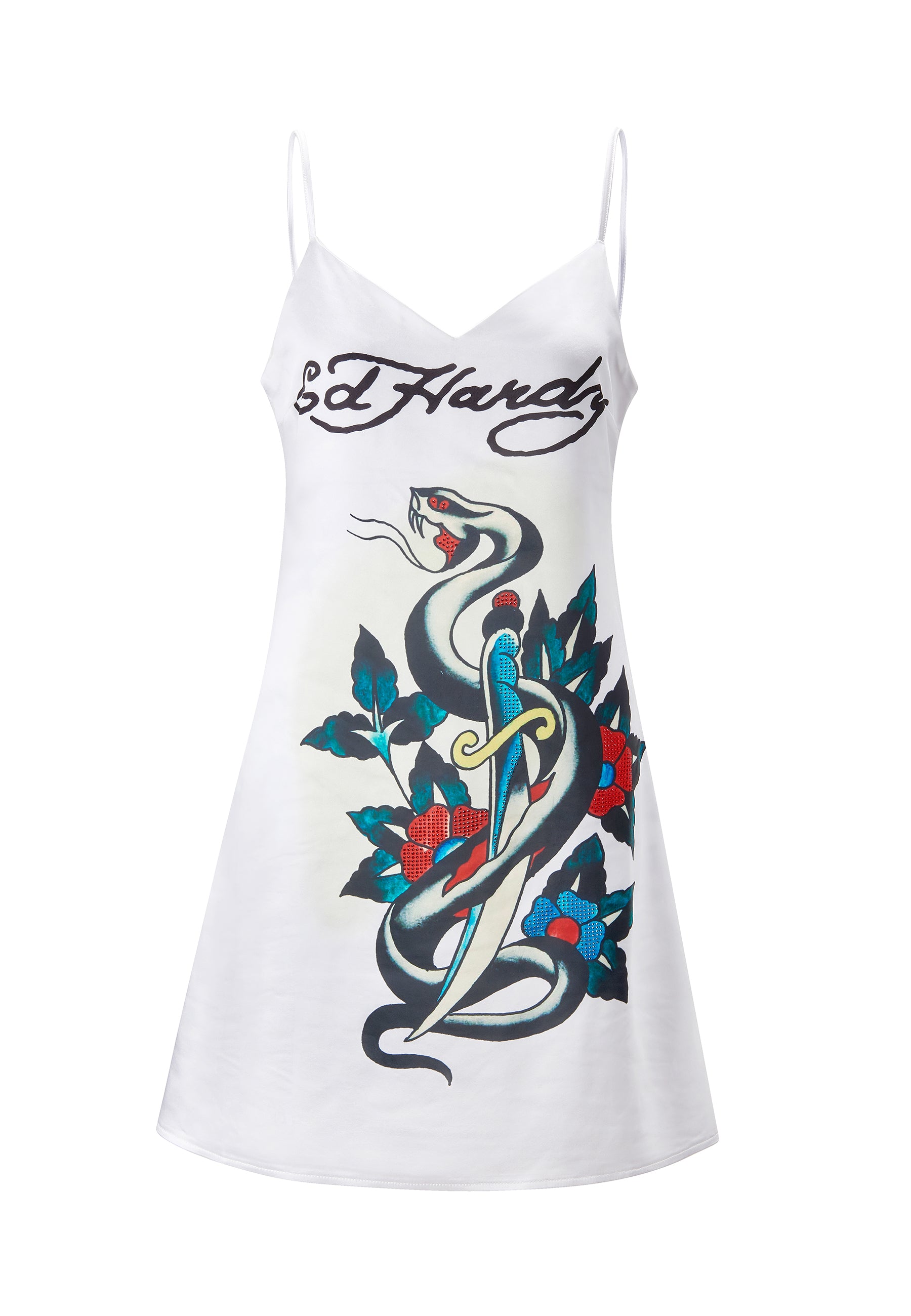 The Snake & Dagger Strappy Mini Dress seamlessly fuses influences from art, fashion, and music subcultures making it the mini dress of the season. It boasts vibrant full-colour digital graphics and contrasting diamante placement, celebrating every inch of Ed's design ethos.