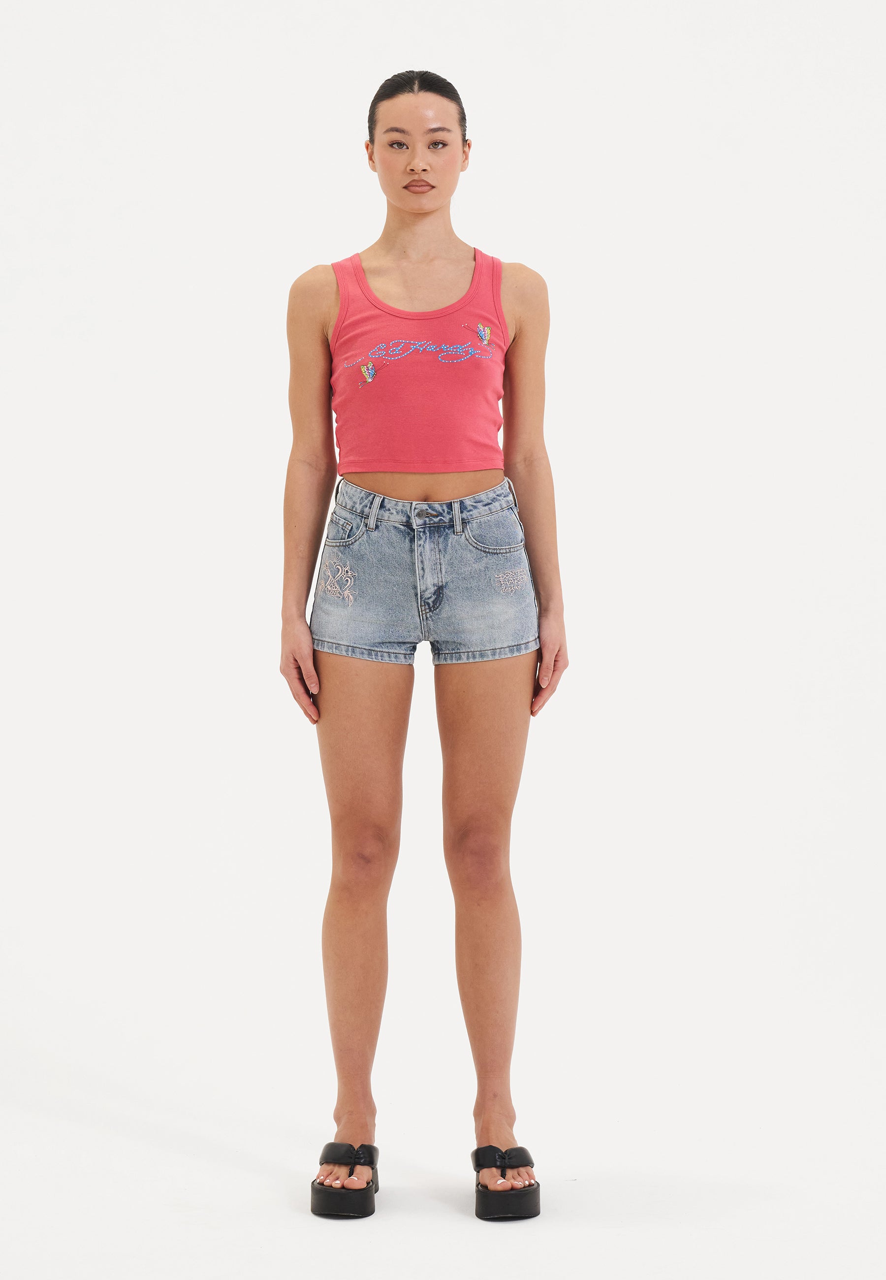 Designed with Summer Festivals in focus, this easy-bleached pair features tonal graphic embroidery, offering a versatile and essential addition to your Ed Hardy collection.