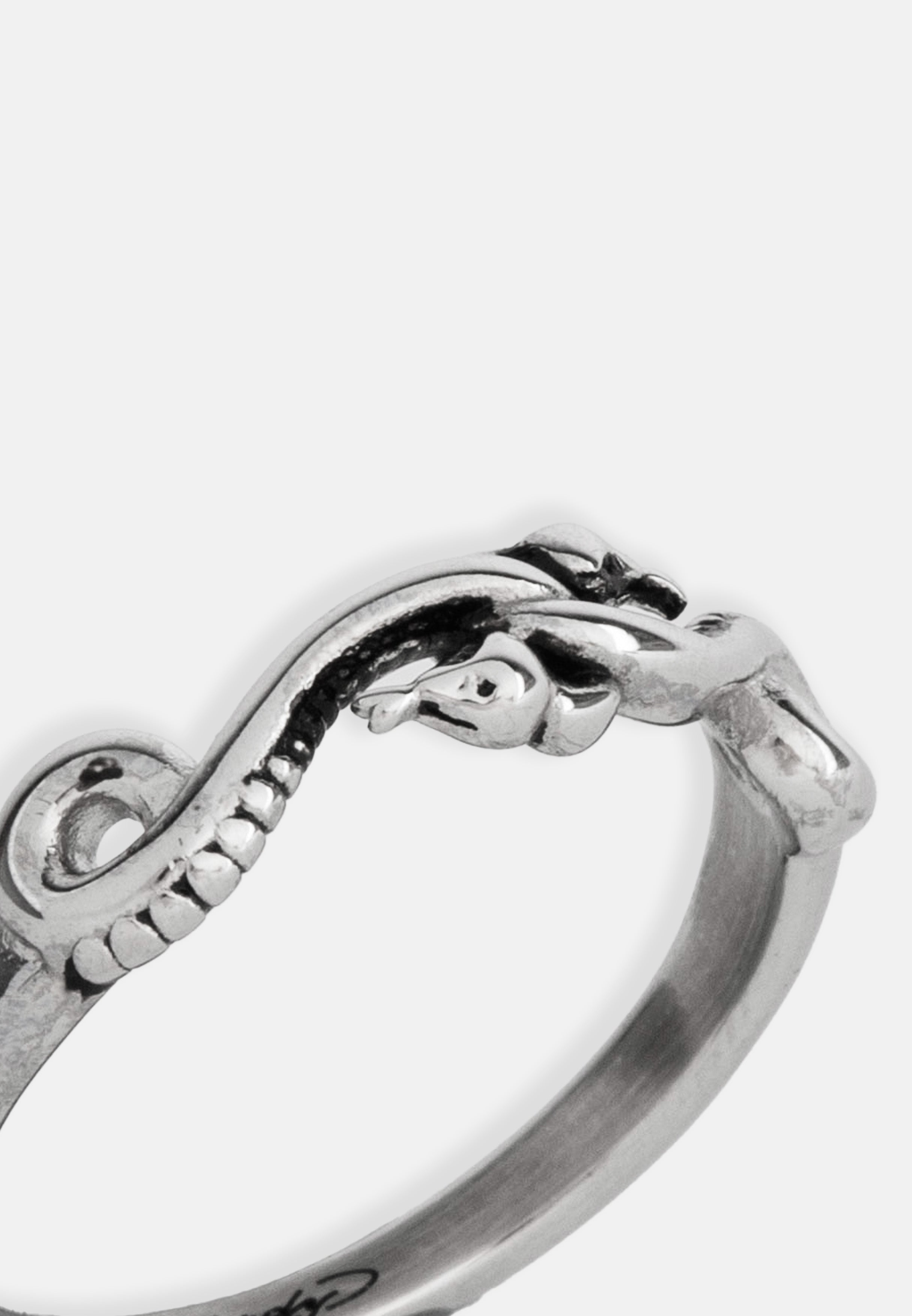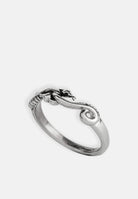 Fine stainless steel band ring with crossed Snake intricate design in a silver finish.