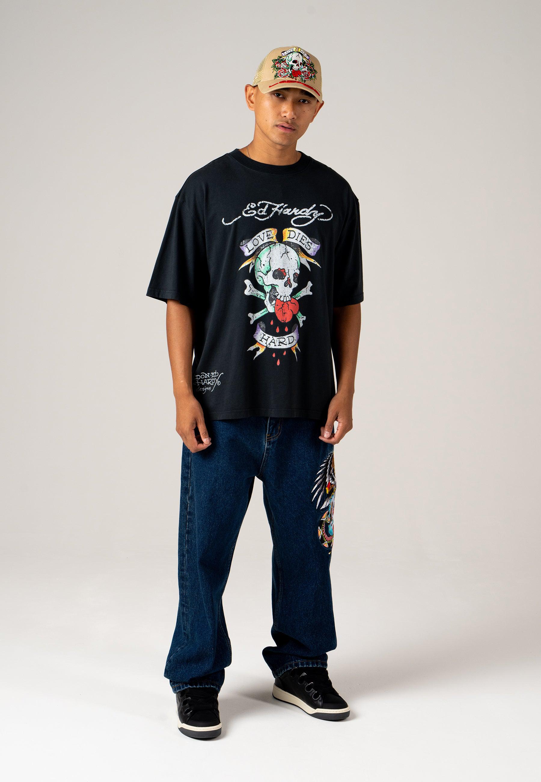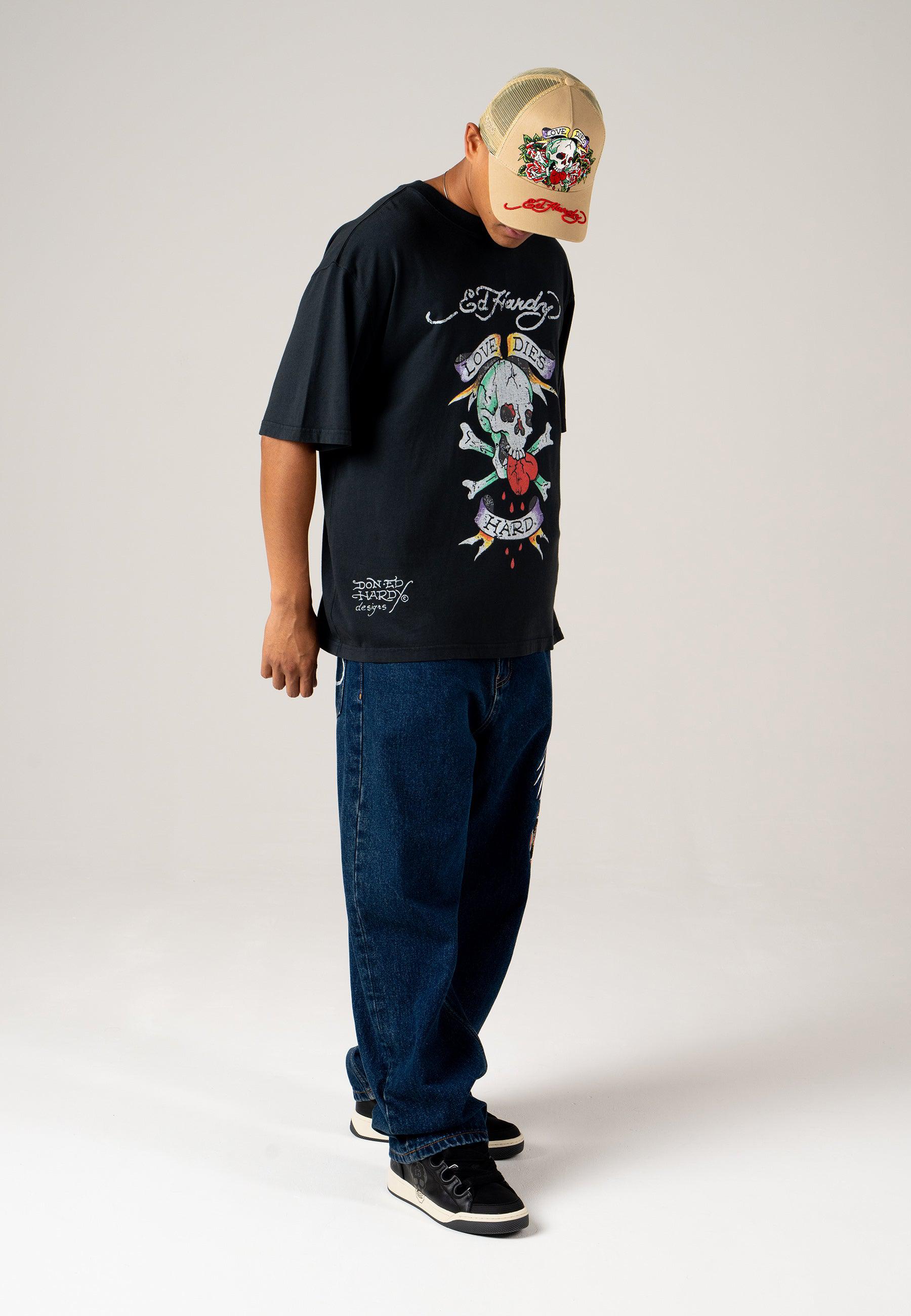 This T-shirt’s washed black colouration and distressed “LOVE DIES HARD” print of a bone-white skull crushing a heart make it vintage Ed Hardy through and through. With Ed Hardy’s iconic logo printed in white above the graphic and an oversized fit, this T-shirt is cool and comfortable. 100%Cotton Jersey 180GSM.