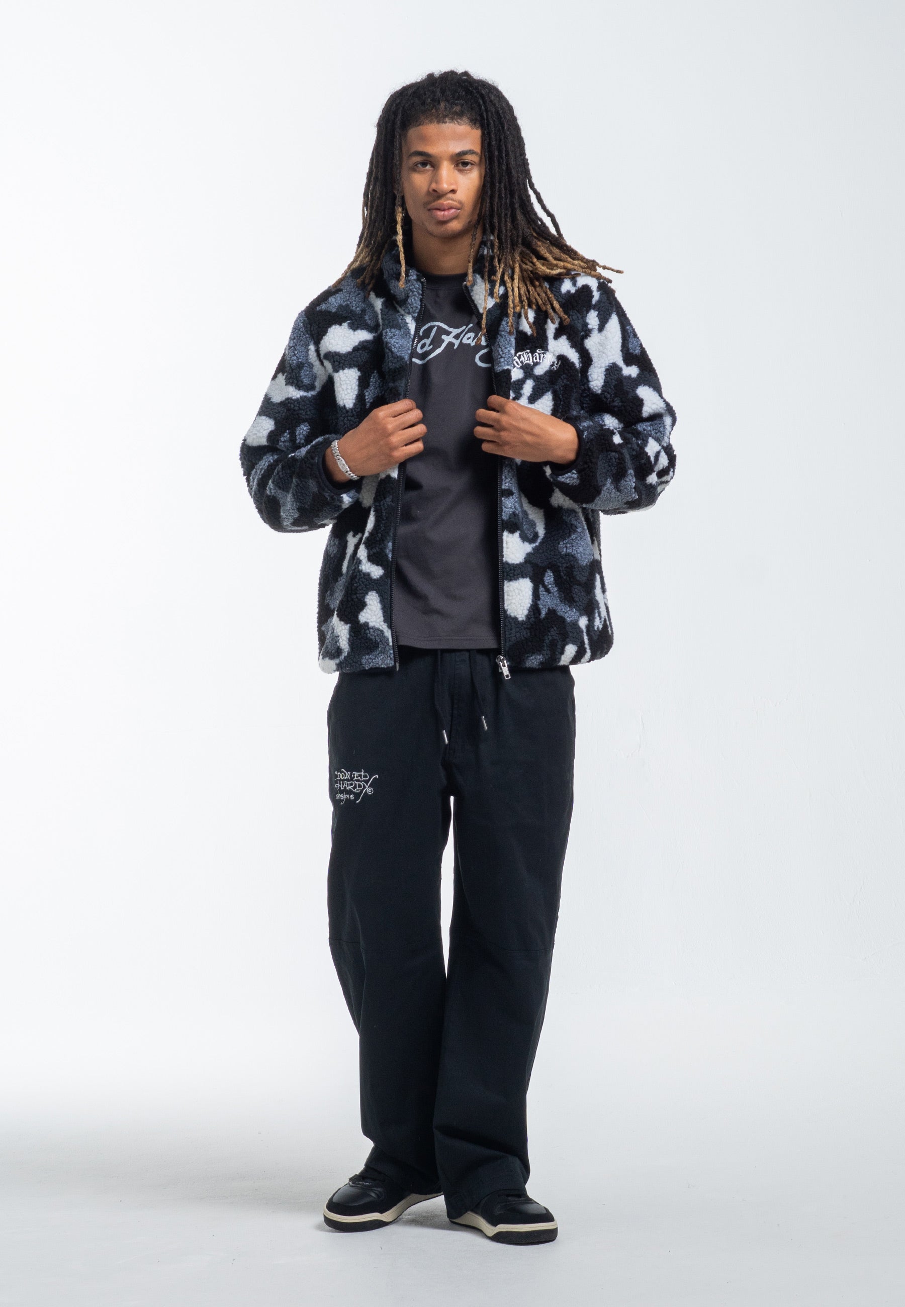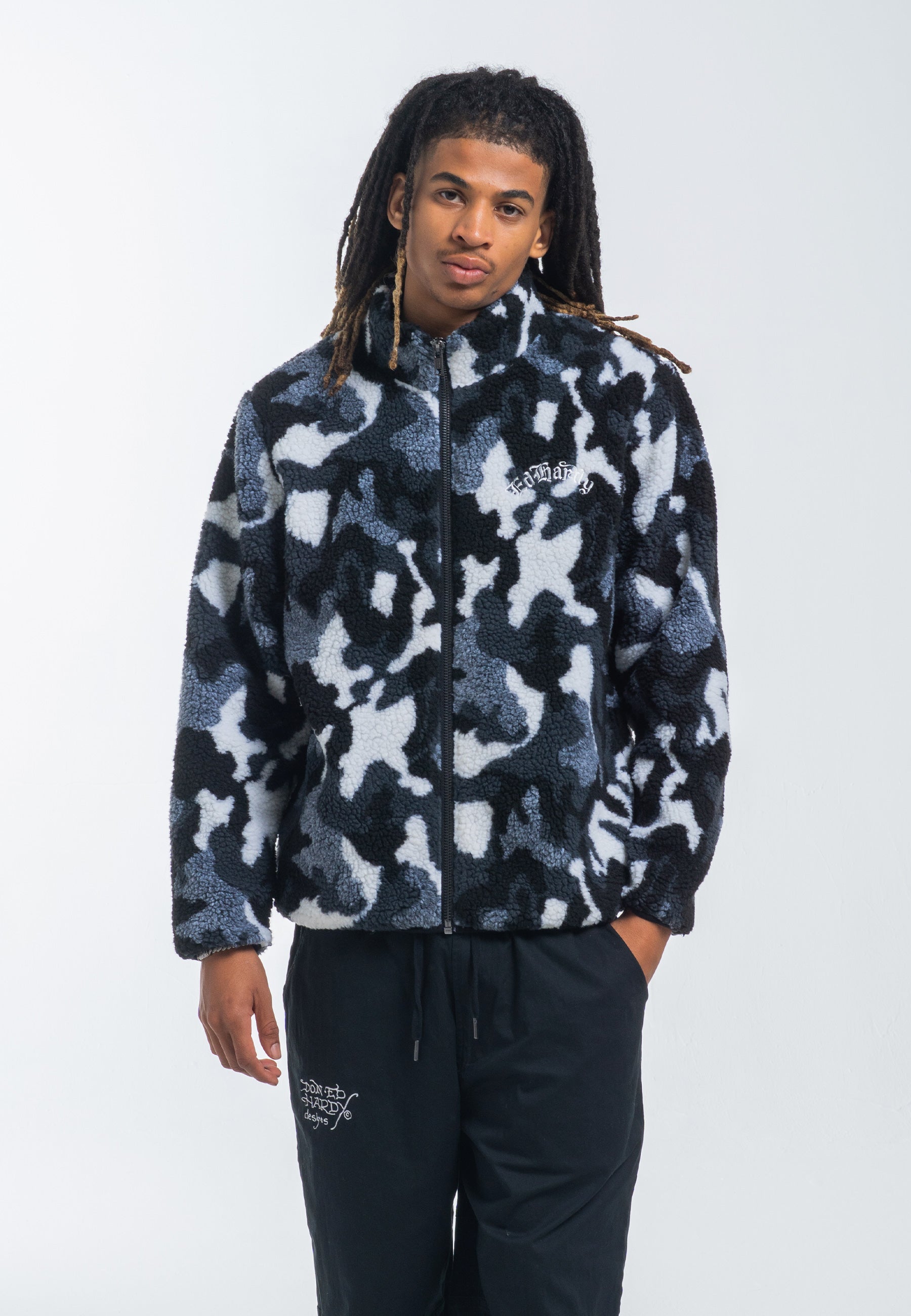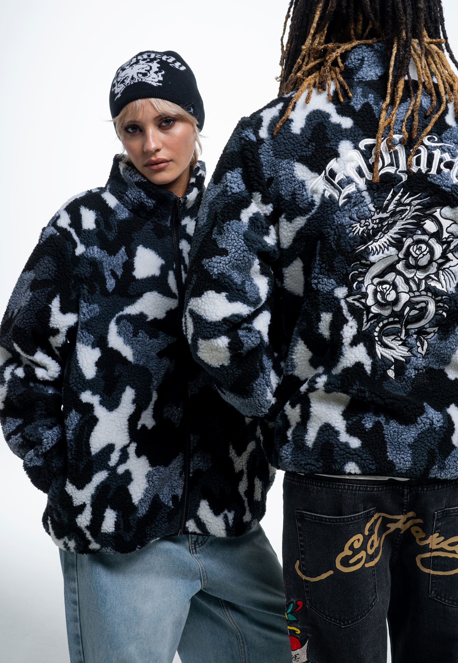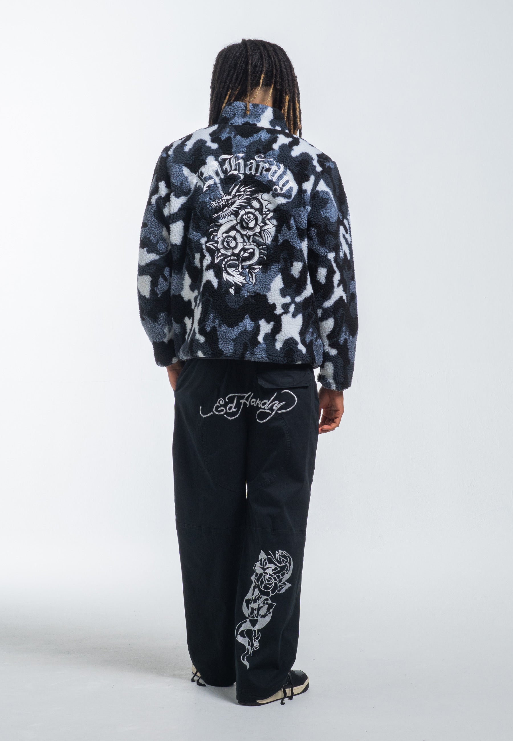Mens Dragon & Rose Camo Zip Thru Borg Fleece Jacket - Grey Camo