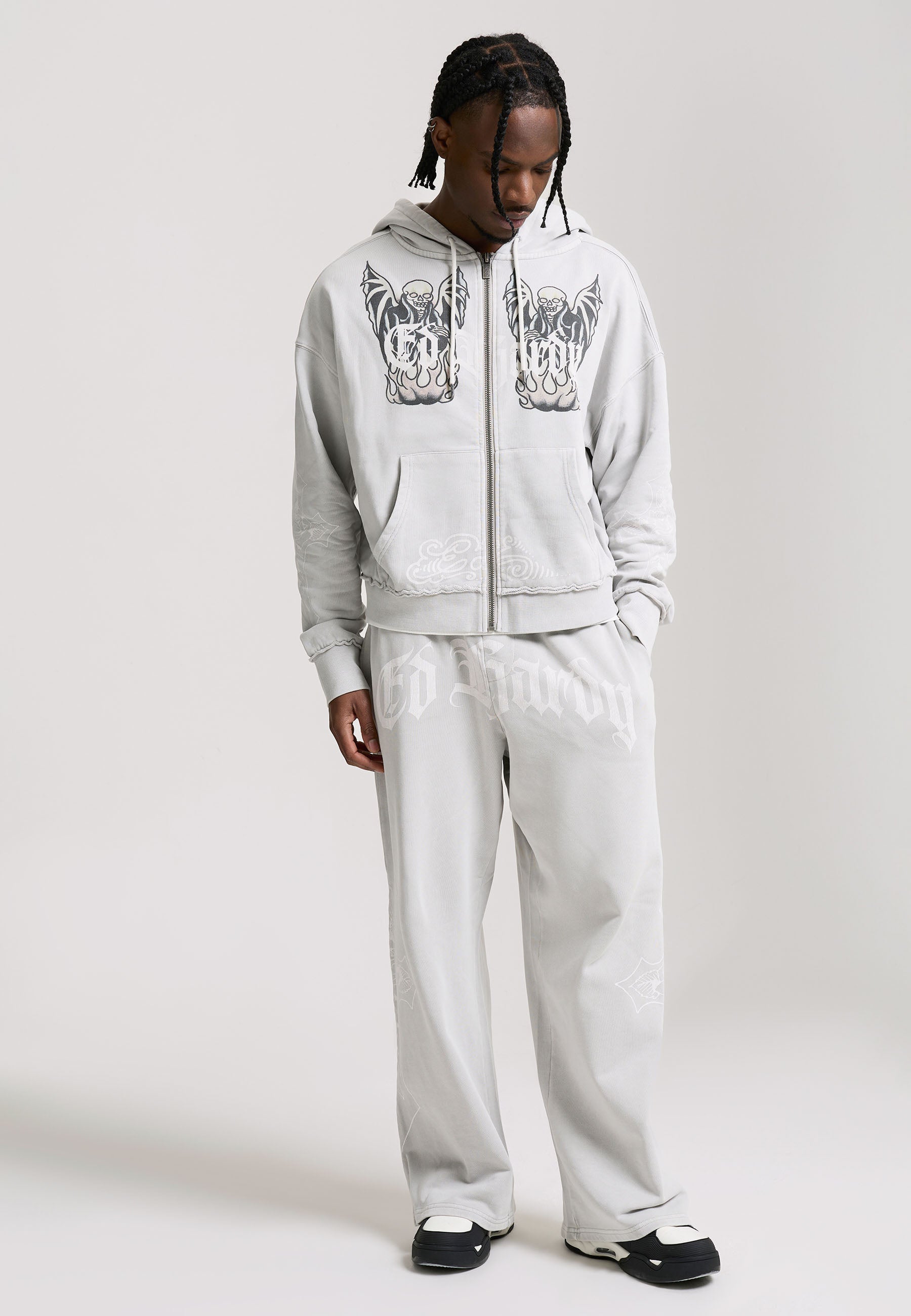 Mens Gothic Skull Boxy Zip Thru Hoodie - Grey