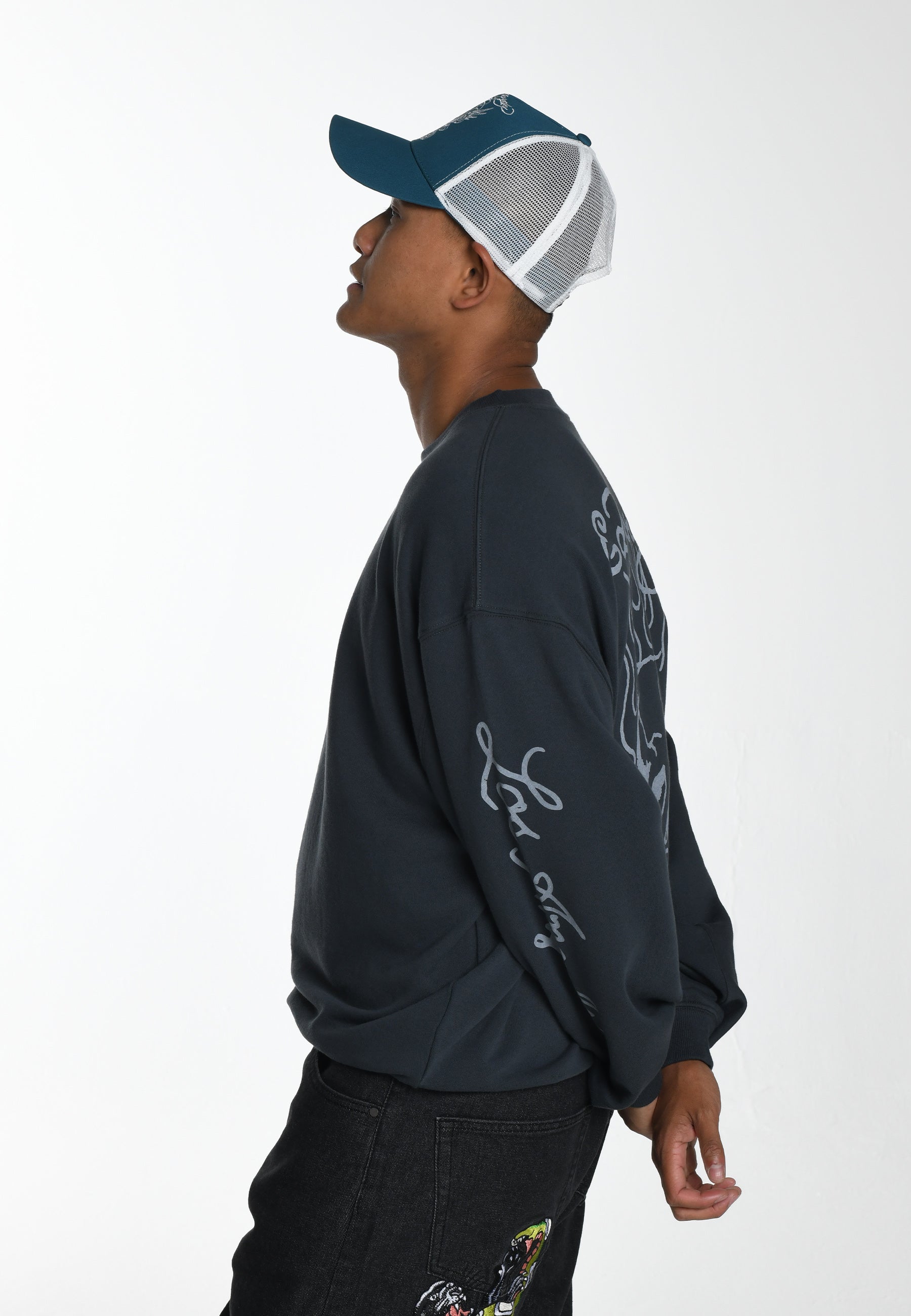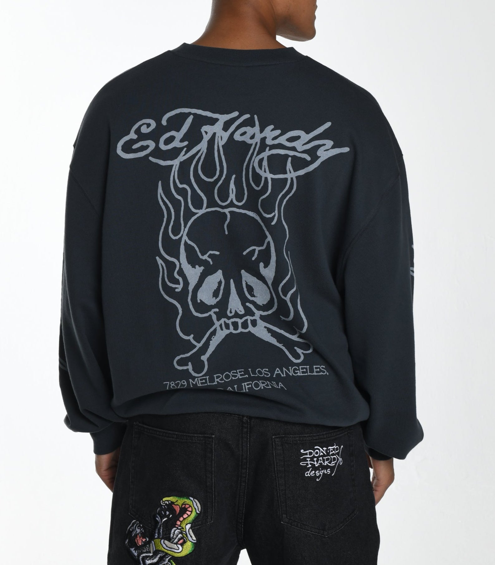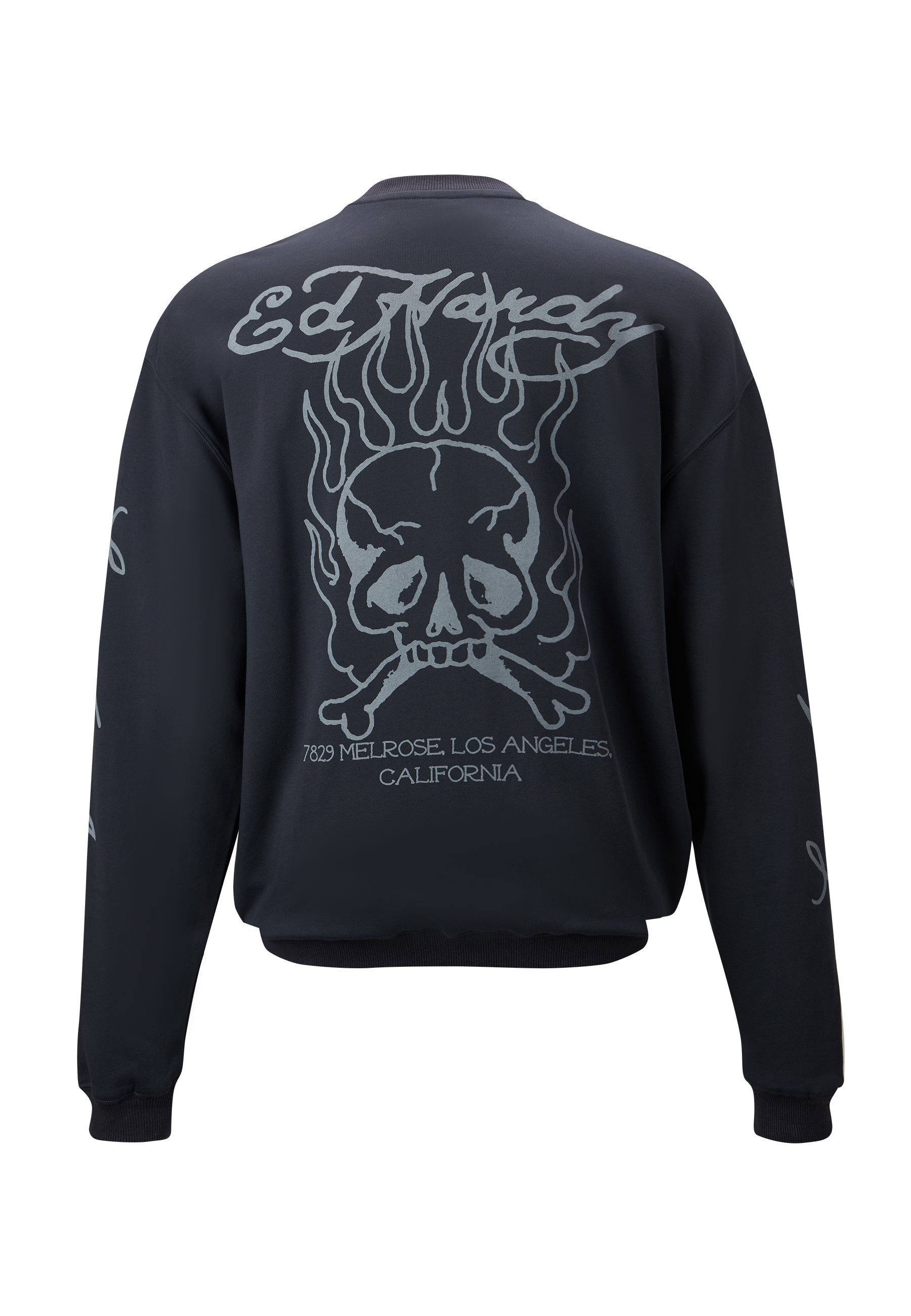The Flash Sheet Crew Neck Jumper draws from classic tattoo flash sheets reminiscent of Ed's former collections, refreshed in the monographic Flaming Skull illustration for a new generation.