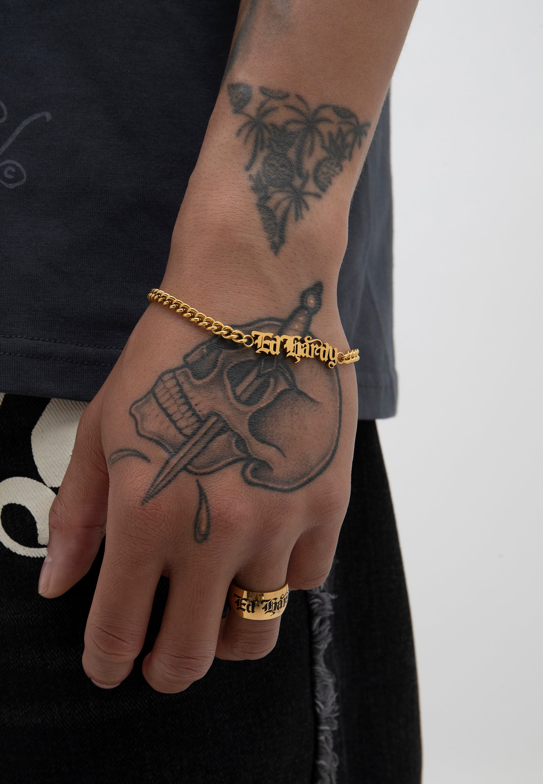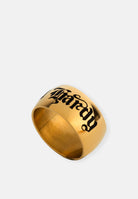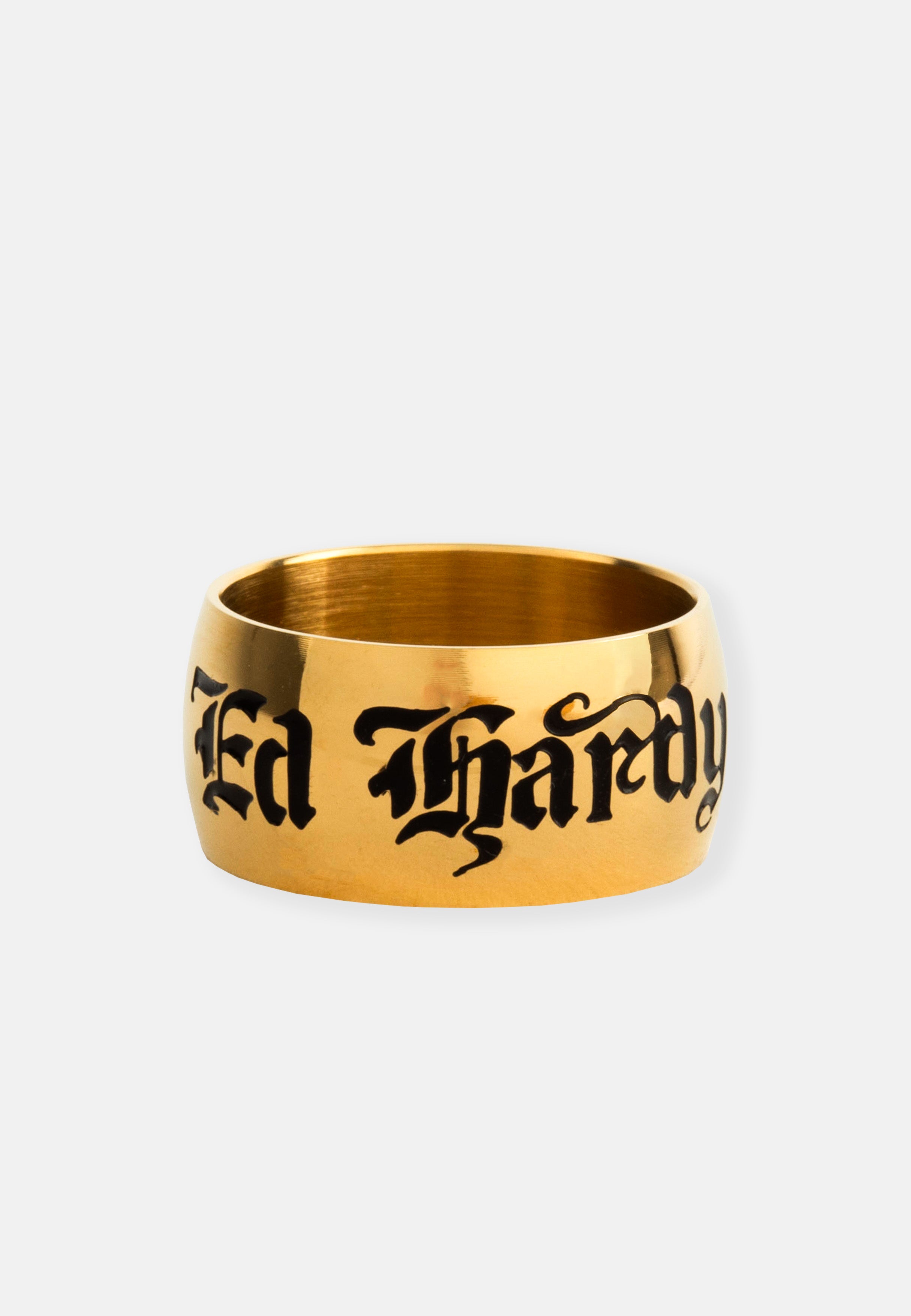 Stainless steel chunky band ring with gothic Ed Hardy engraved and antiqued logo in a gold finish.