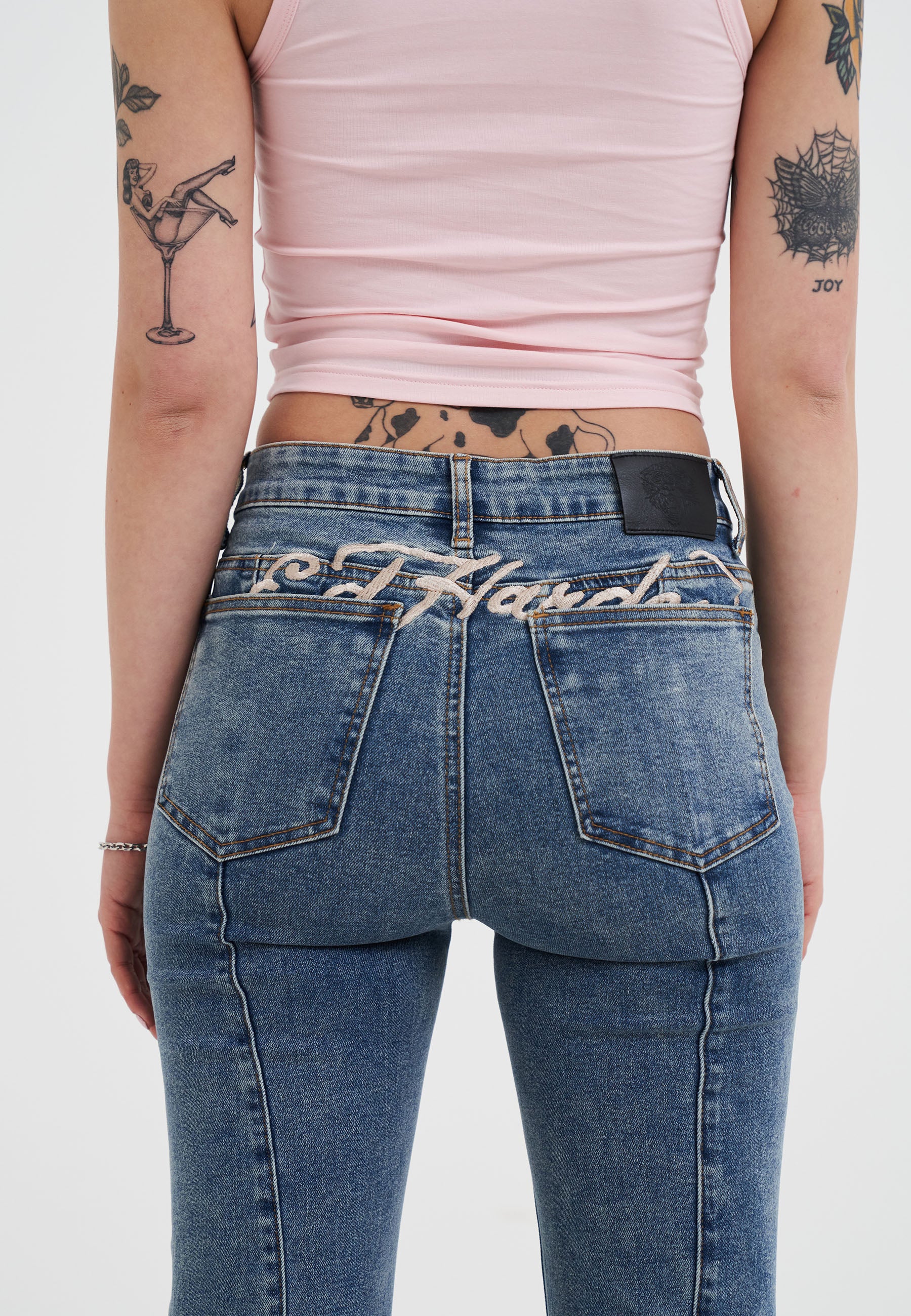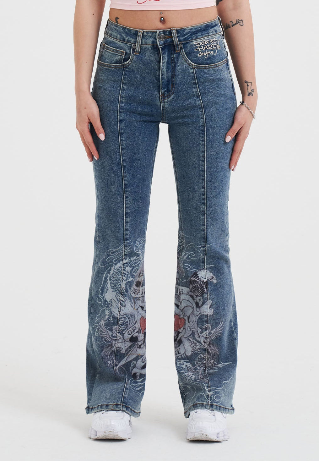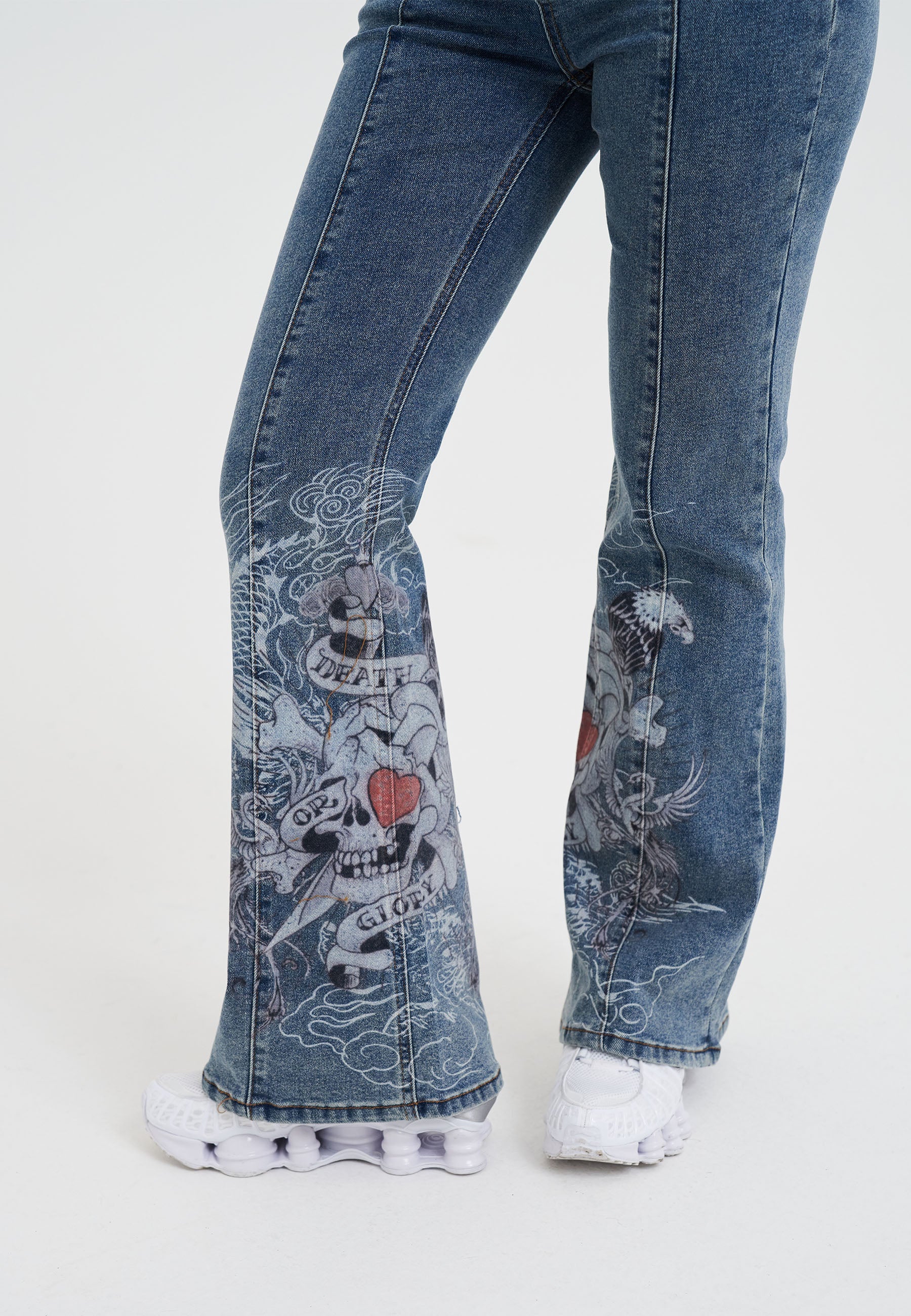 - Faded death or glory skull print to front and back leg and Don Ed Hardy embroidery on the front pocket