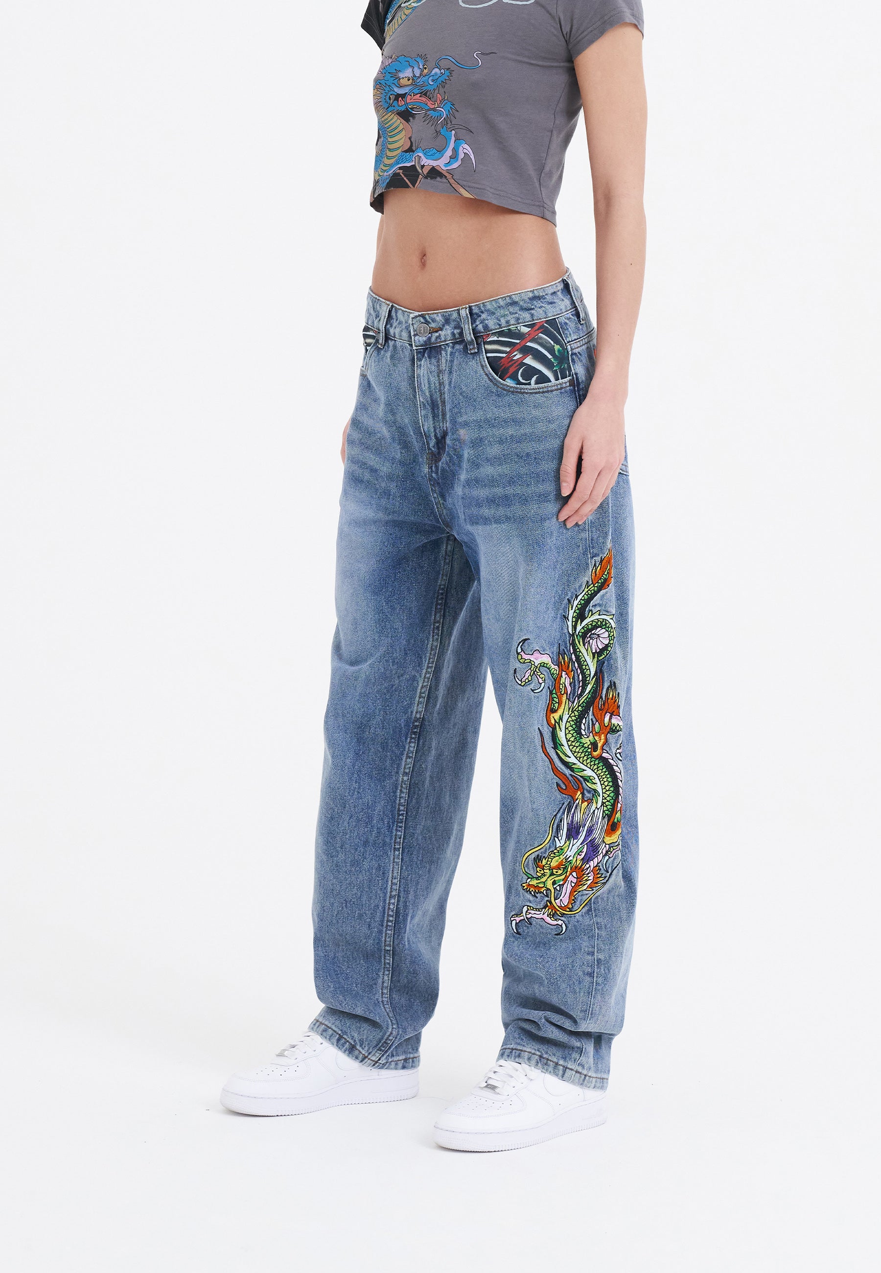 Womens Crawling Dragon Relaxed Fit Denim Trousers Jeans - Bleach