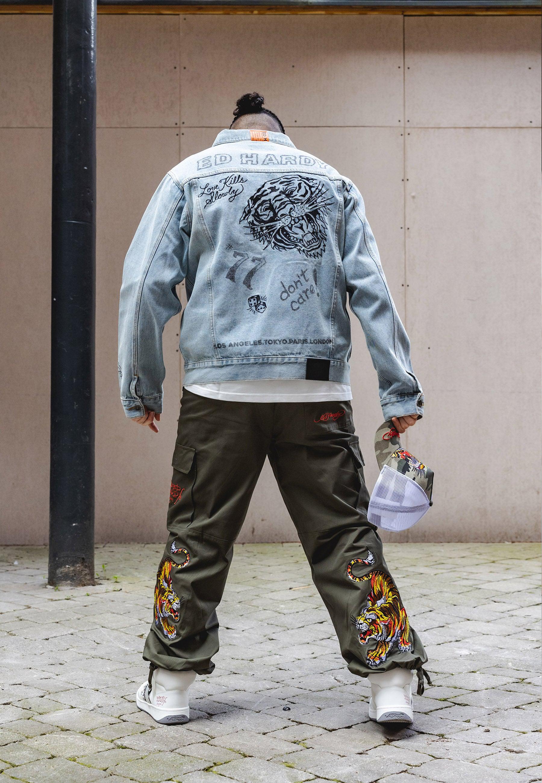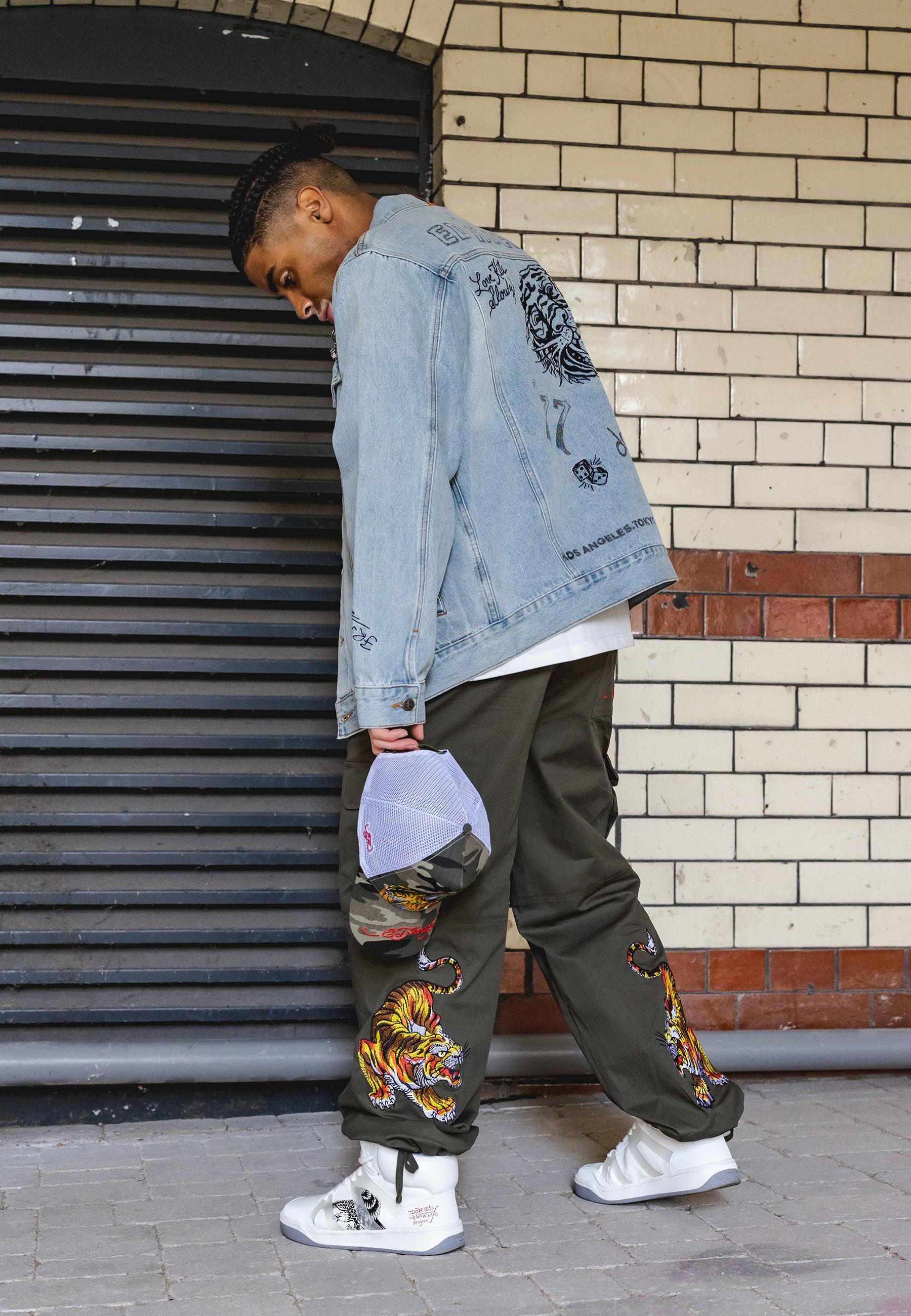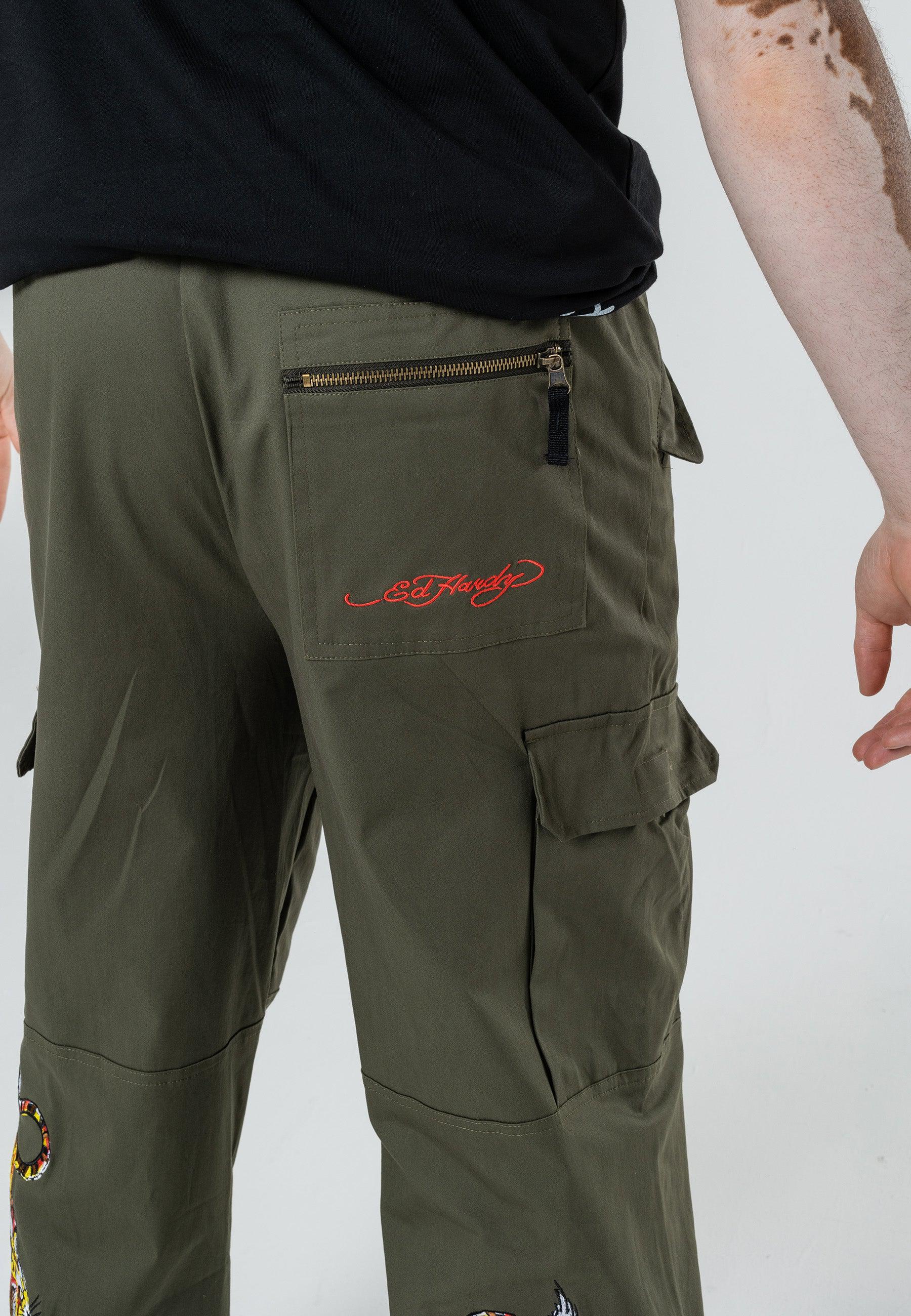 These Double Tiger Cargo Pant-Dusty Olive features the infamous Eds archive of high-definition embroidered Tigers at both lower back legs, as well as the embroidered Ed Hardy logo on the back zip pocket. These comfy cargos are perfect for chill, day and night vibes.