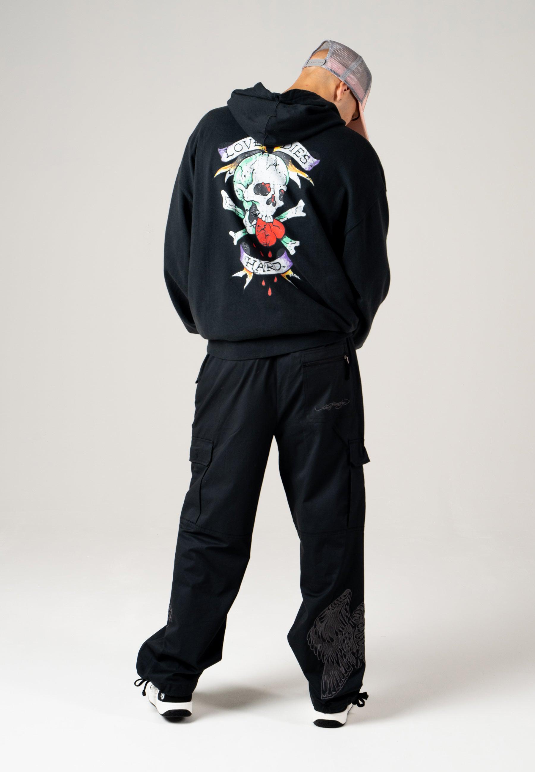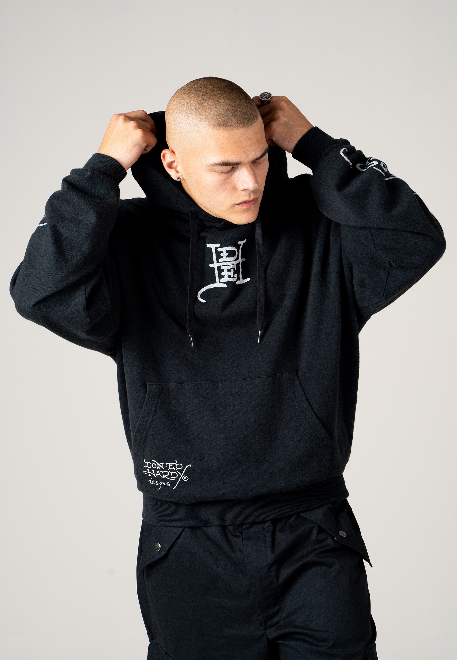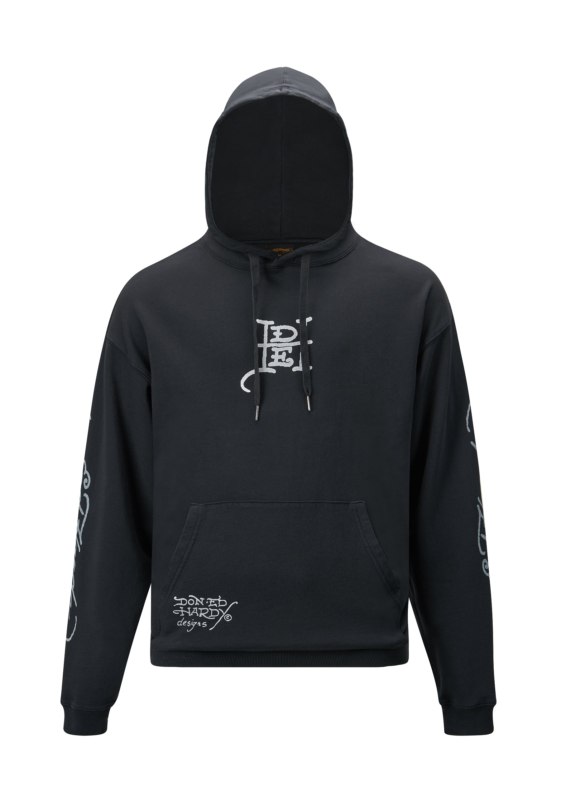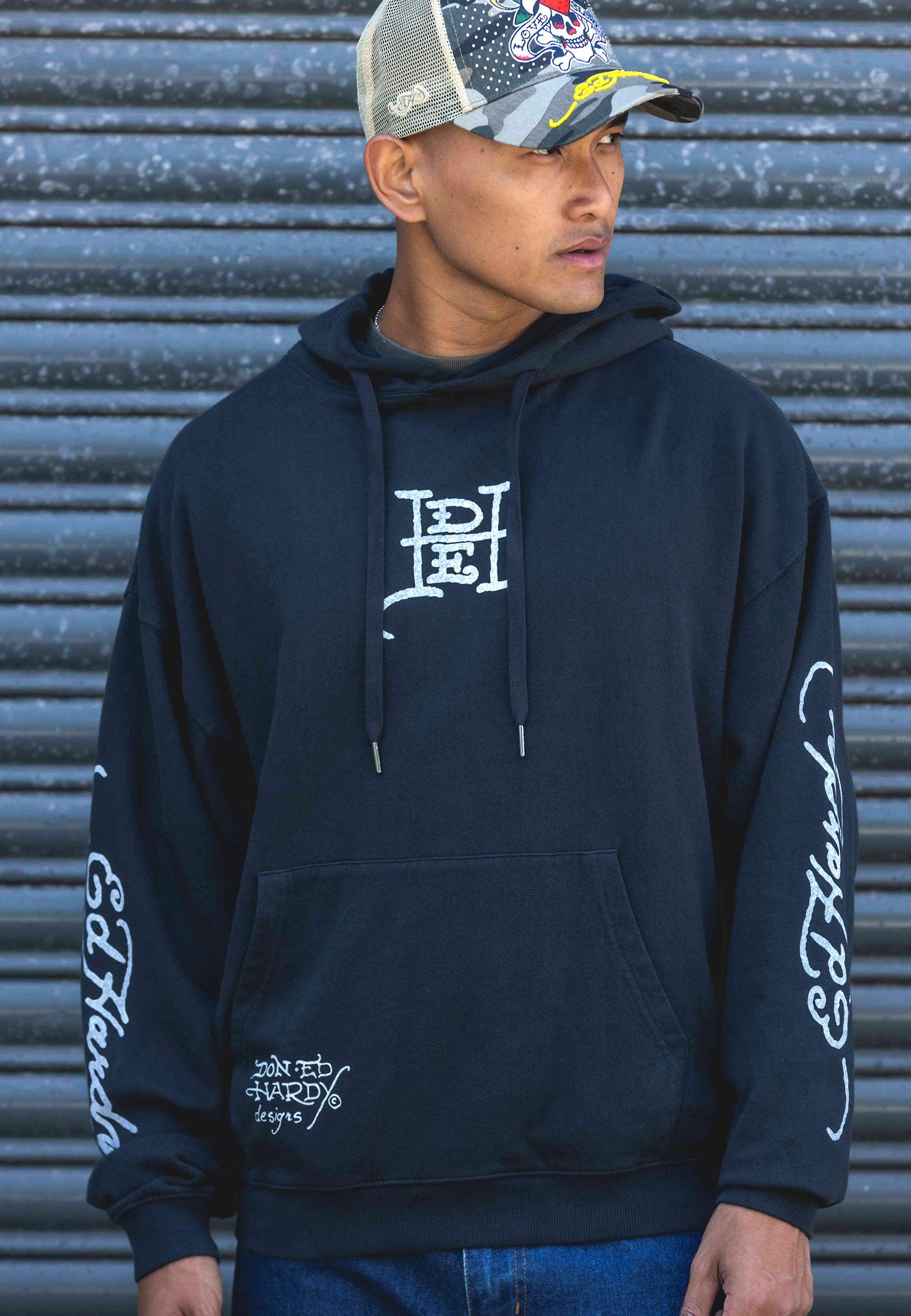 With its washed black colouration and large, menacing skull and crossbones graphic printed on the back, this hoodie's urban twist is a guaranteed attention-grabber. Also featuring the iconic Ed Hardy signature in white on each sleeve, this hoodie’s bold contrast and sinister design give it a dark twist. 100%Cotton loopback 320gsm.