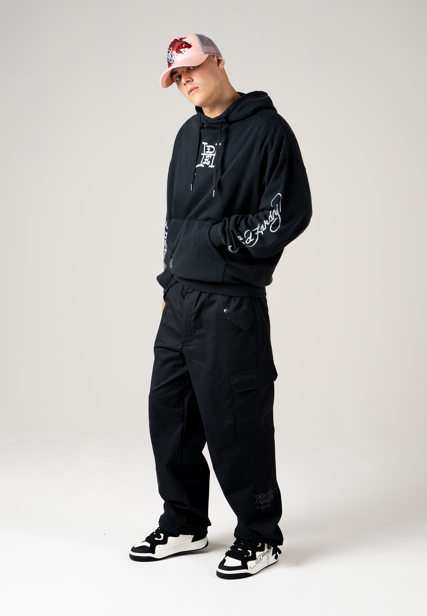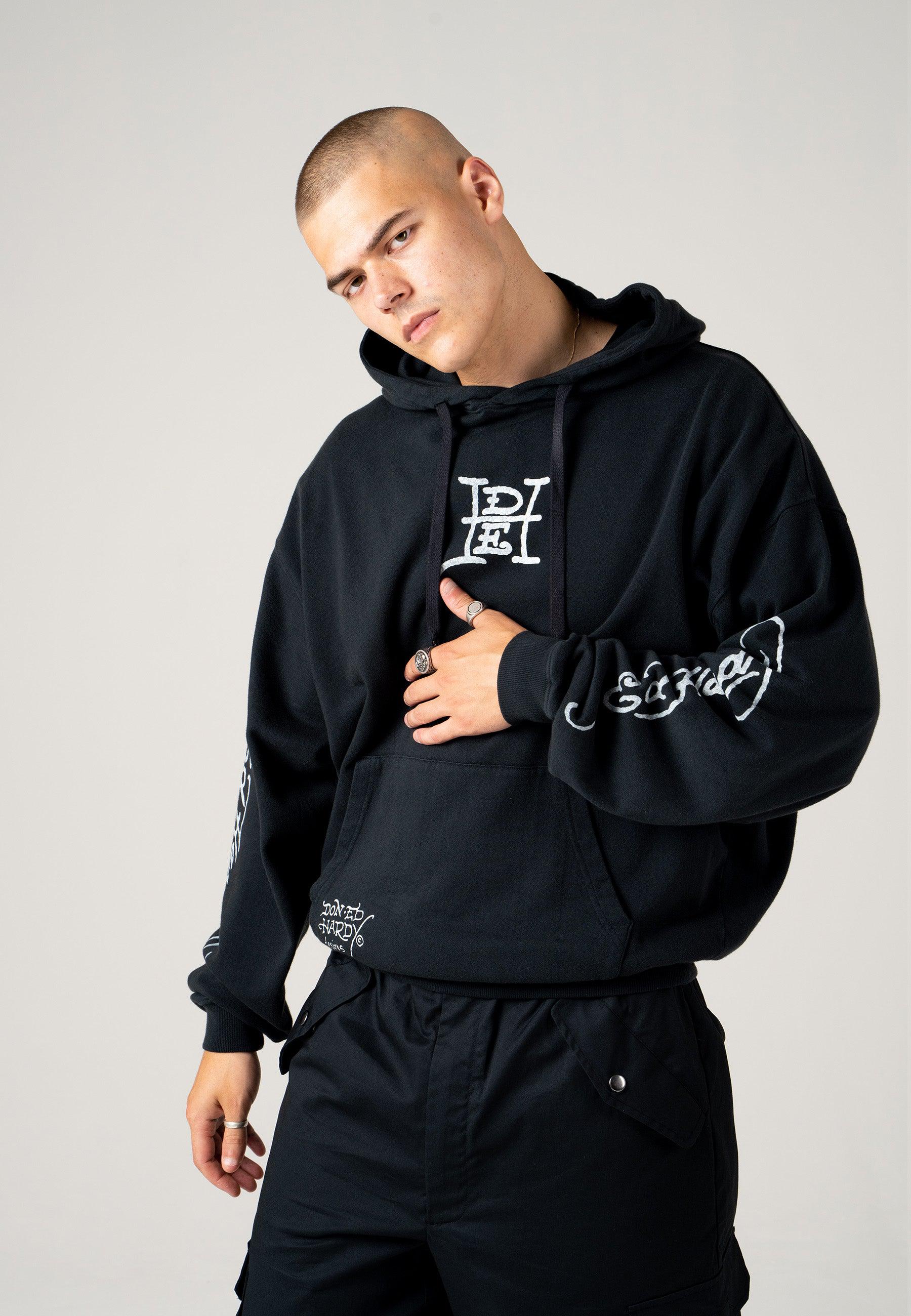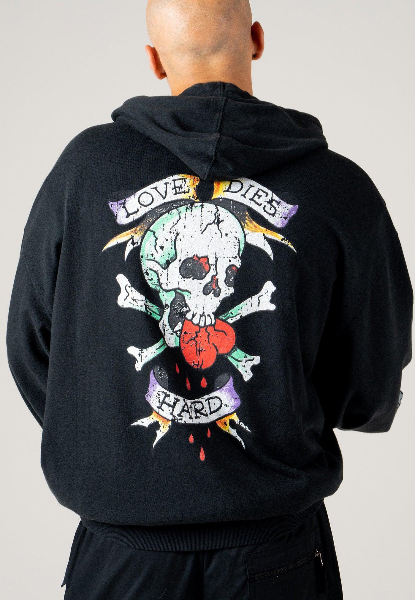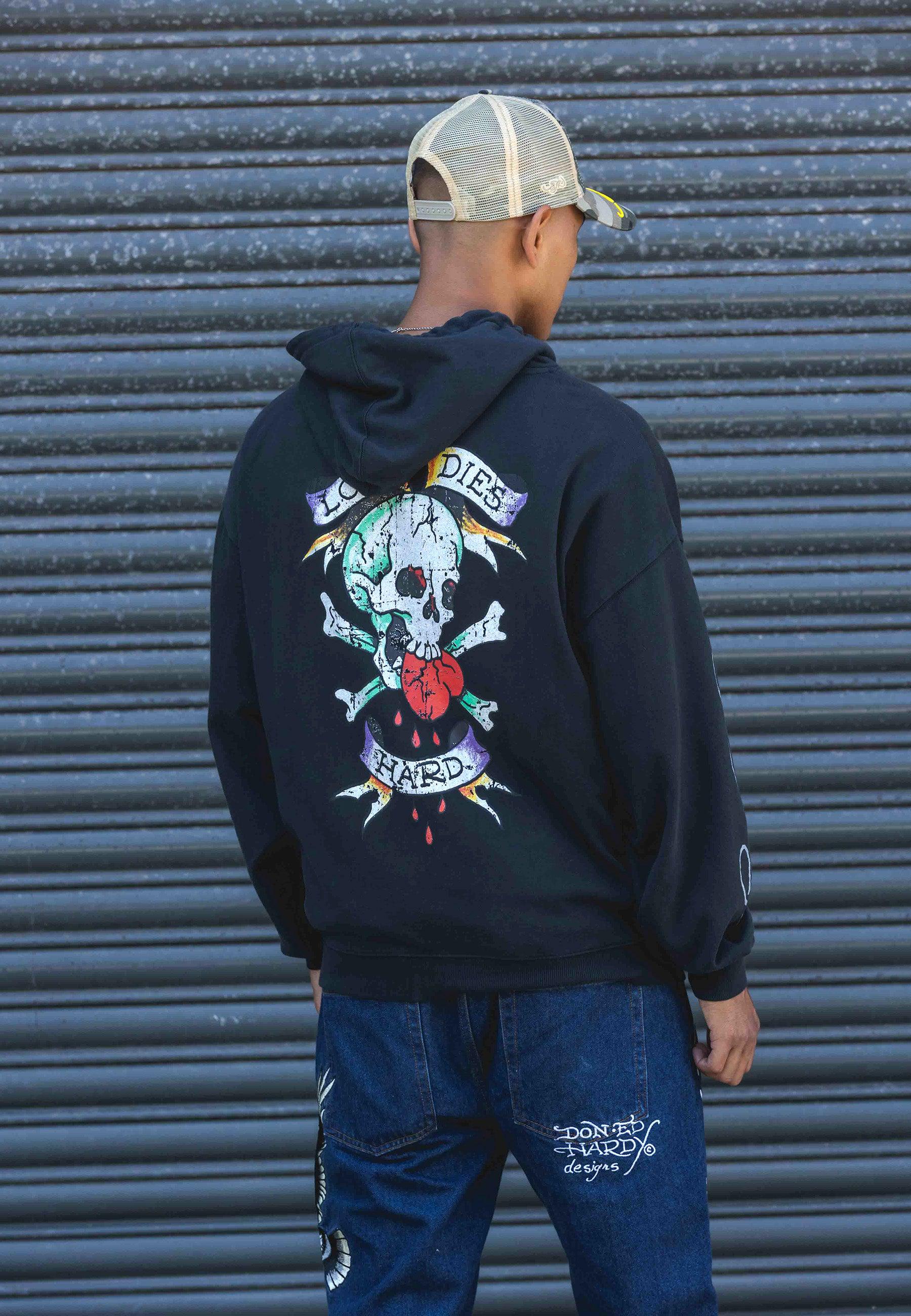 With its washed black colouration and large, menacing skull and crossbones graphic printed on the back, this hoodie's urban twist is a guaranteed attention-grabber. Also featuring the iconic Ed Hardy signature in white on each sleeve, this hoodie’s bold contrast and sinister design give it a dark twist. 100%Cotton loopback 320gsm.