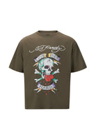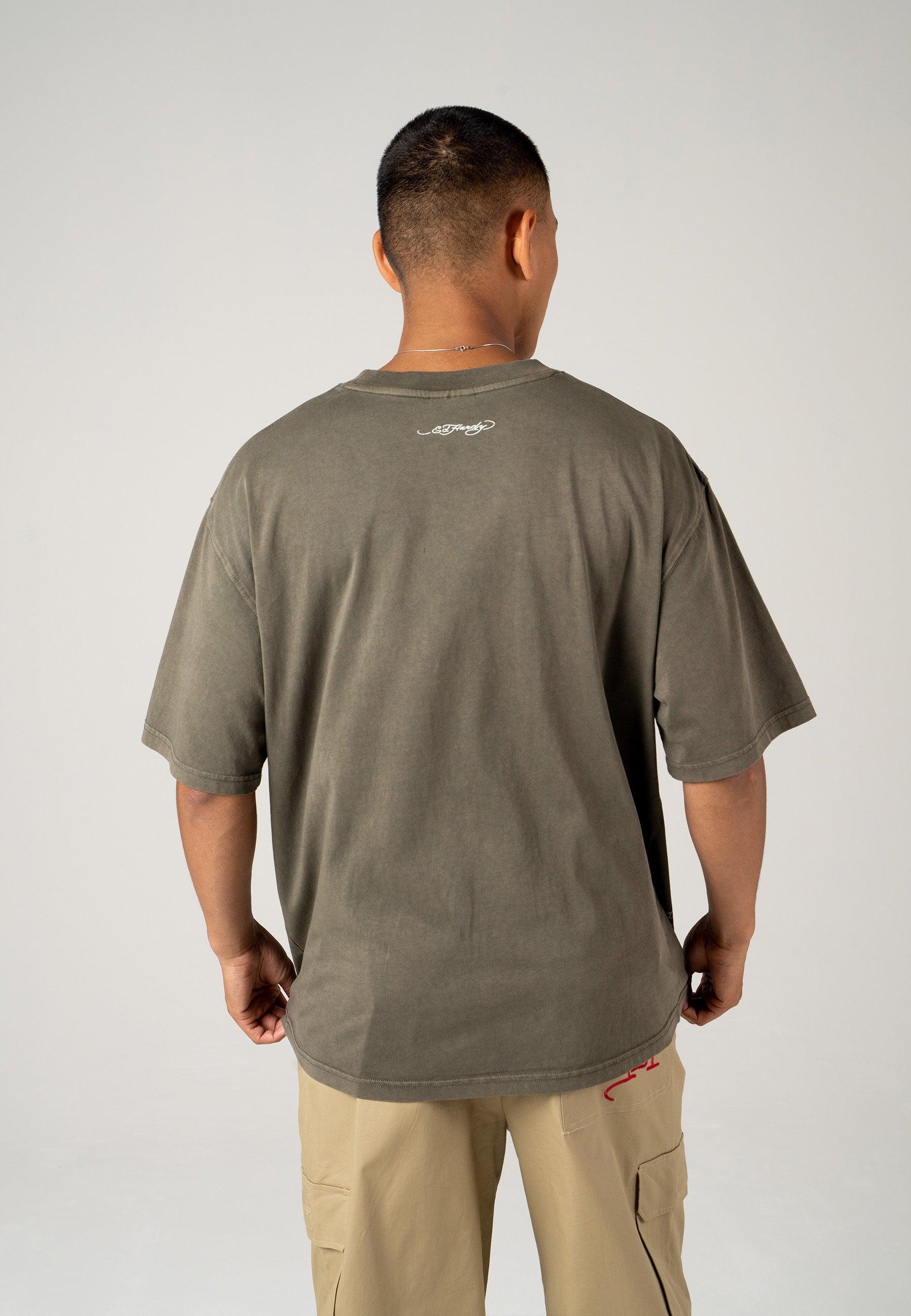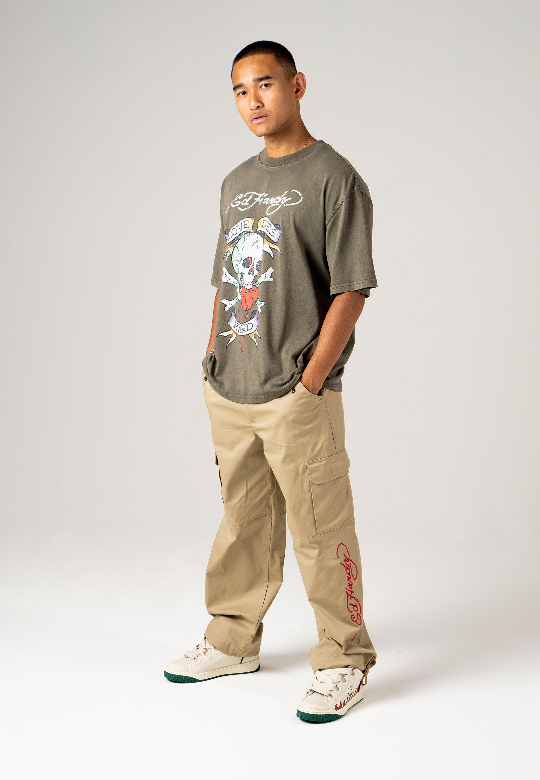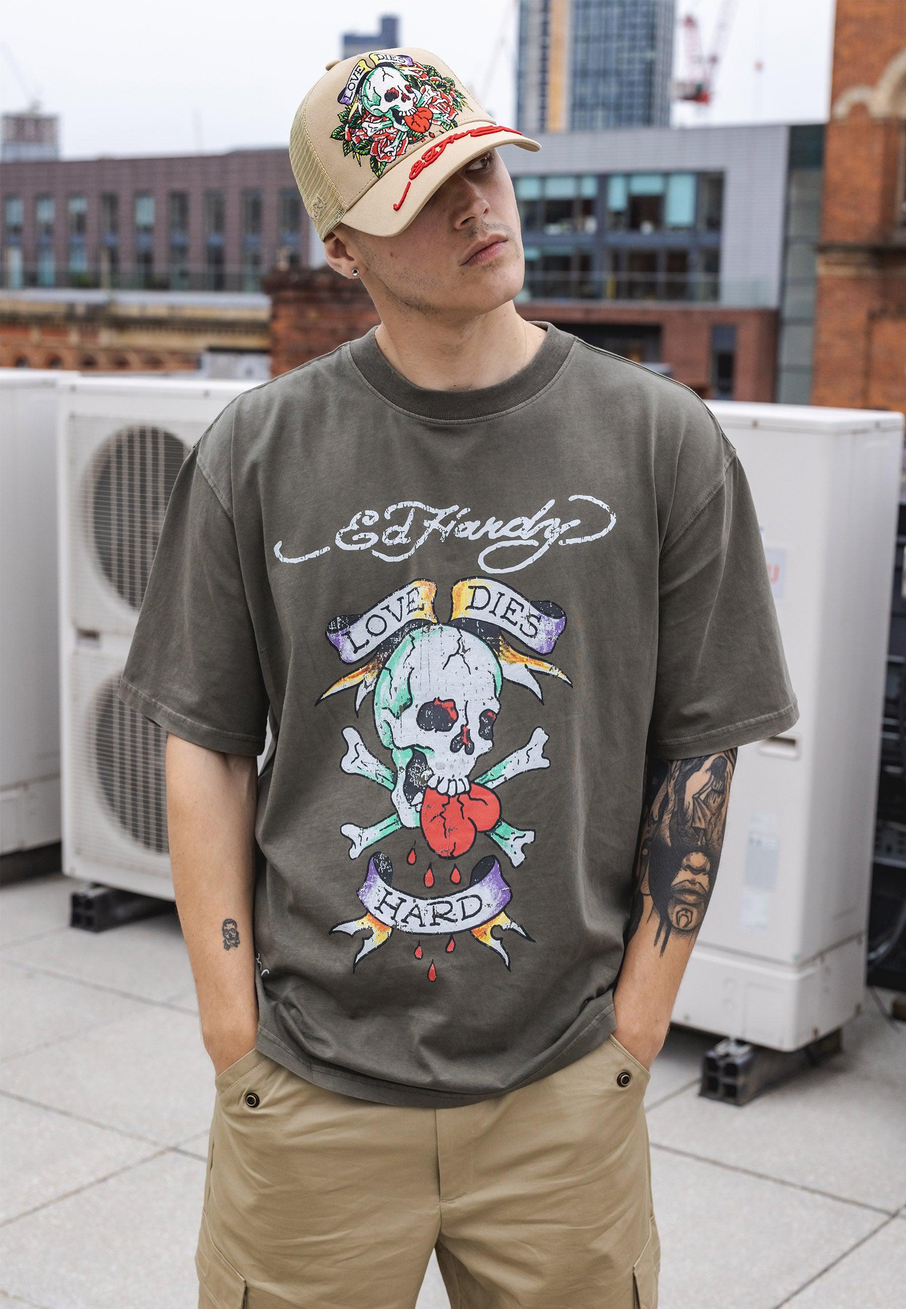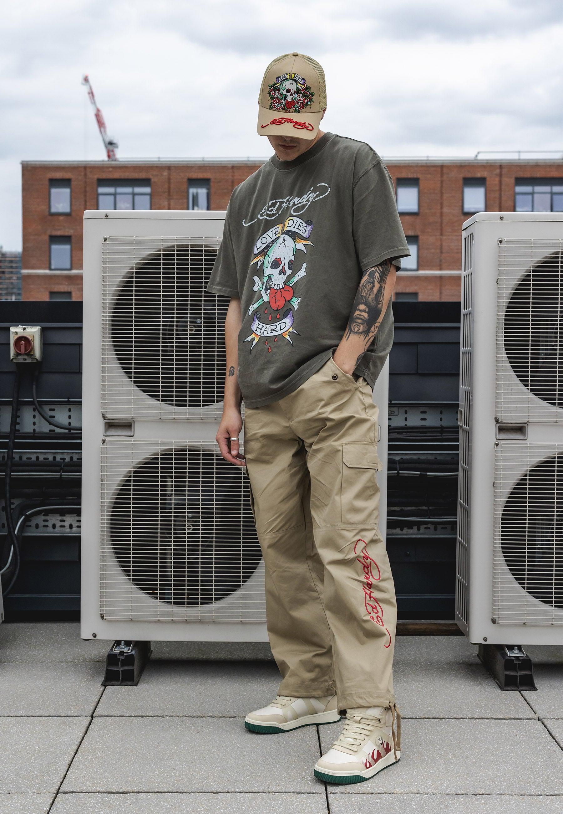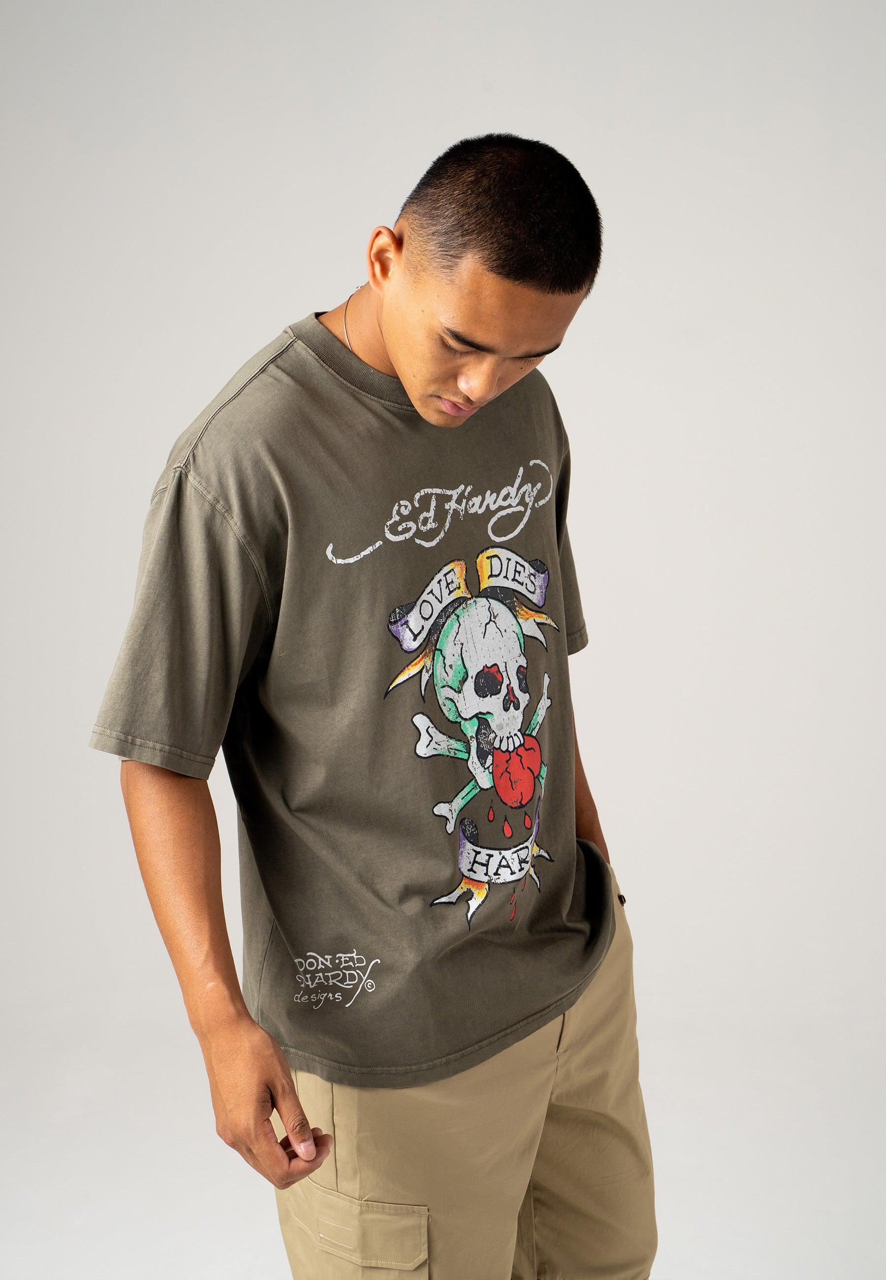 The khaki base and distressed, heart-crushing “LOVE DIES HARD” skull print make this garment truly vintage Ed Hardy. Also featuring the classic Ed Hardy signature logo in white directly above the graphic and an oversized fit, this tattoo design graphic tee looks and feels great. 100%Cotton Jersey 180GSM.